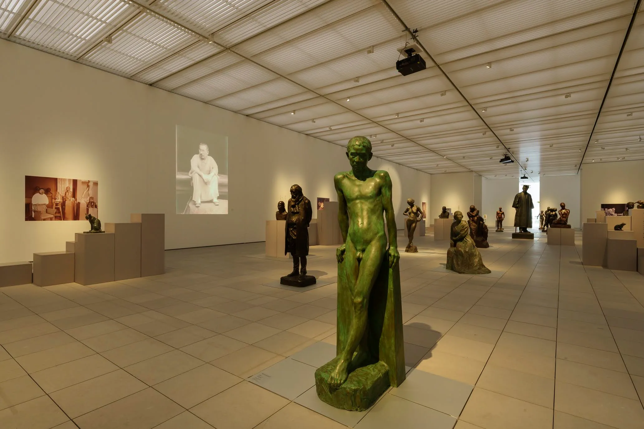会場に入ってまず驚くのが、巨大な回廊のような展示室だ。手前から奥へと朝倉の人物彫刻が並び、胸像や猫は床面パネルがそのまま迫り出したような台座の上に配置されているのを一望することができる。アートファンであれば、2012年にフランス北部のランスに建設されたルーヴル美術館分館を思い出すかもしれない。同館の常設展示室「時のギャラリー」が絵画や彫刻を時系列に並べることで、時代のダイナミックな変遷を可視化したのと同じように、この空間は朝倉にとっての彫刻の歴史を可視化している。