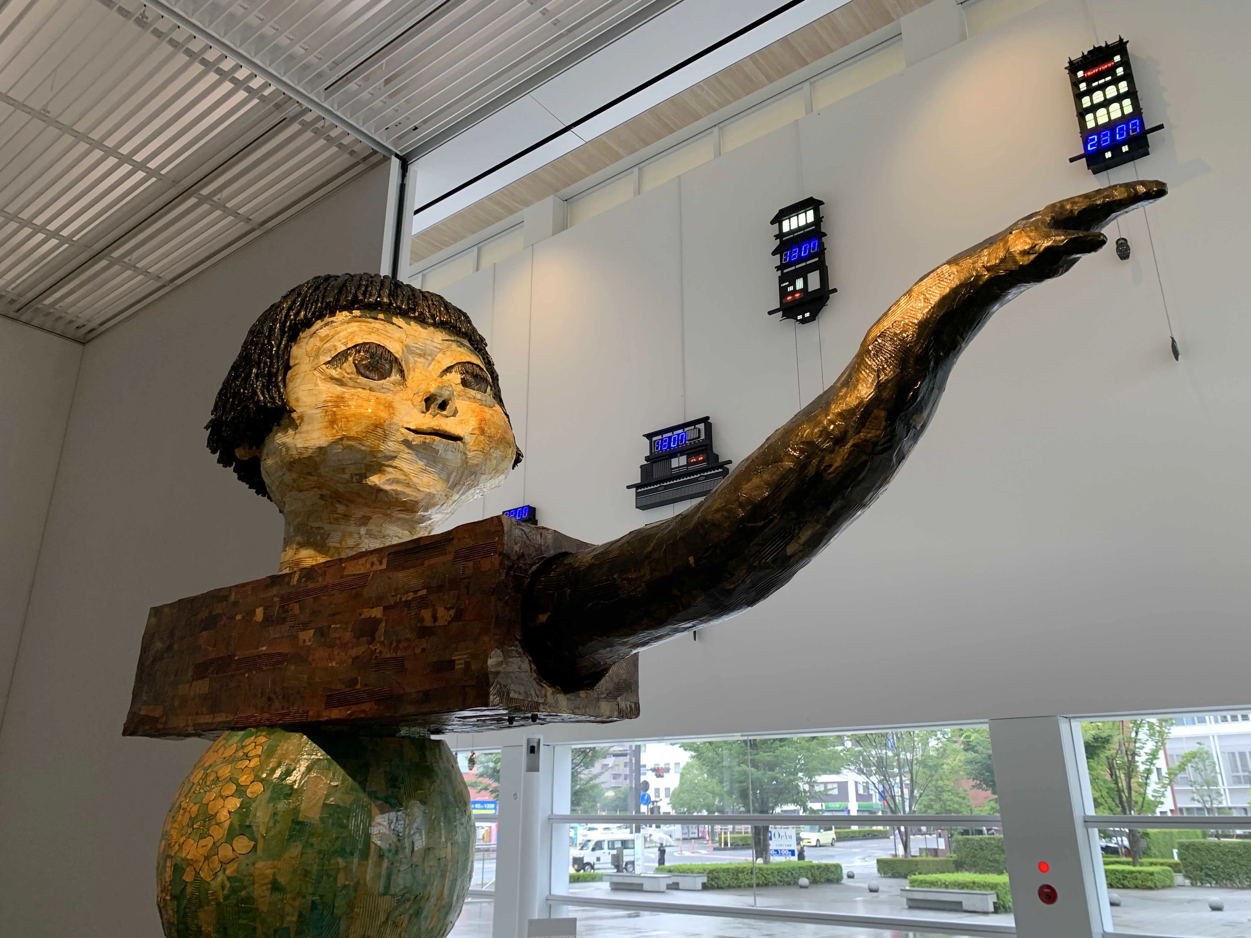 いがぐり頭の少年とおかっぱの少女が互いに手を差し出しあっているような作品は、彫刻であると同時に来場者を会場の外に見送るための門だ。ザ・キャビンカンパニーが言うように、大分県立美術館の周辺や市内には数多くの朝倉による野外彫刻があり、その意味でこの展覧会は、美術館のなかだけでは終わらずその外にも広がっていこうとする意思を示している。