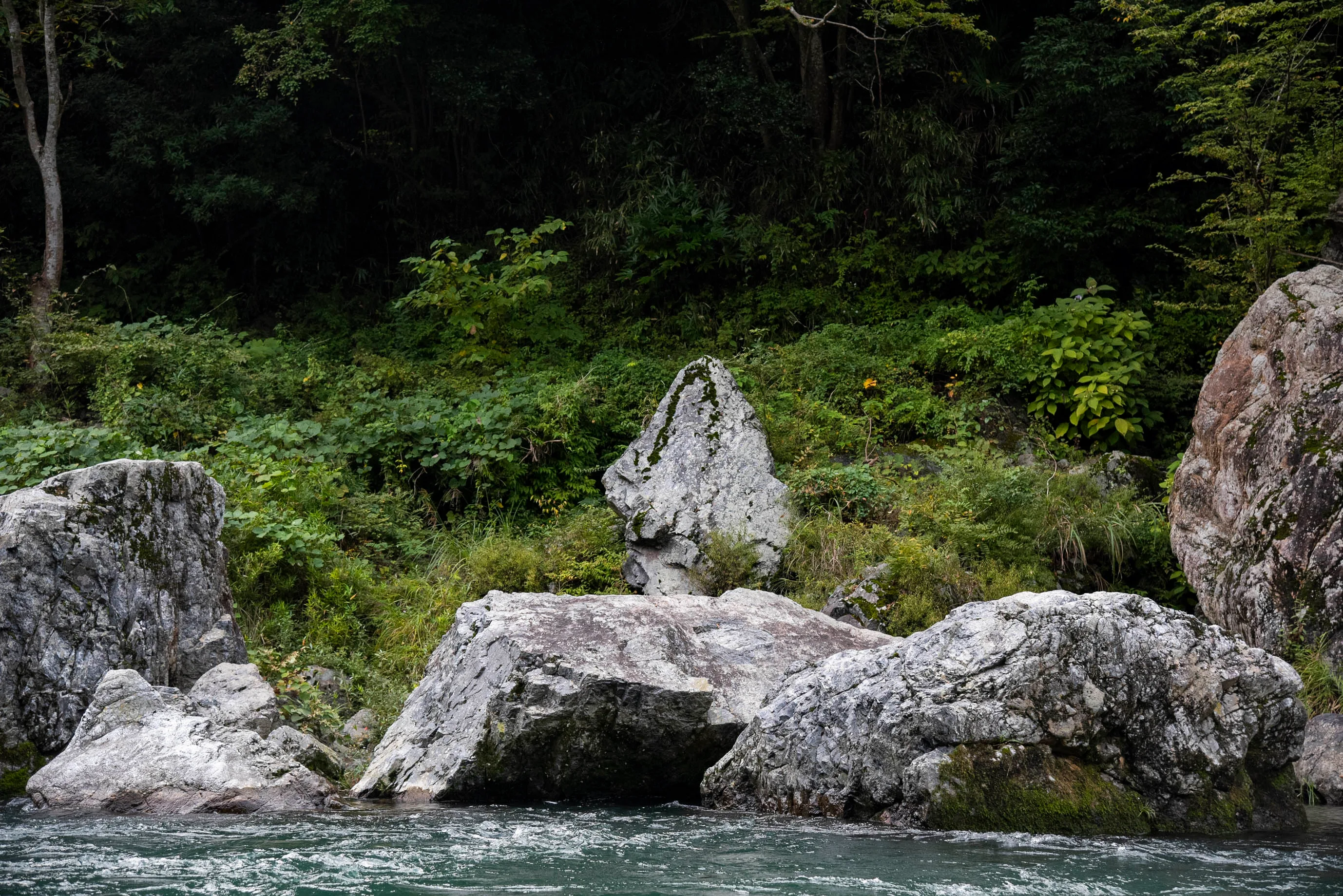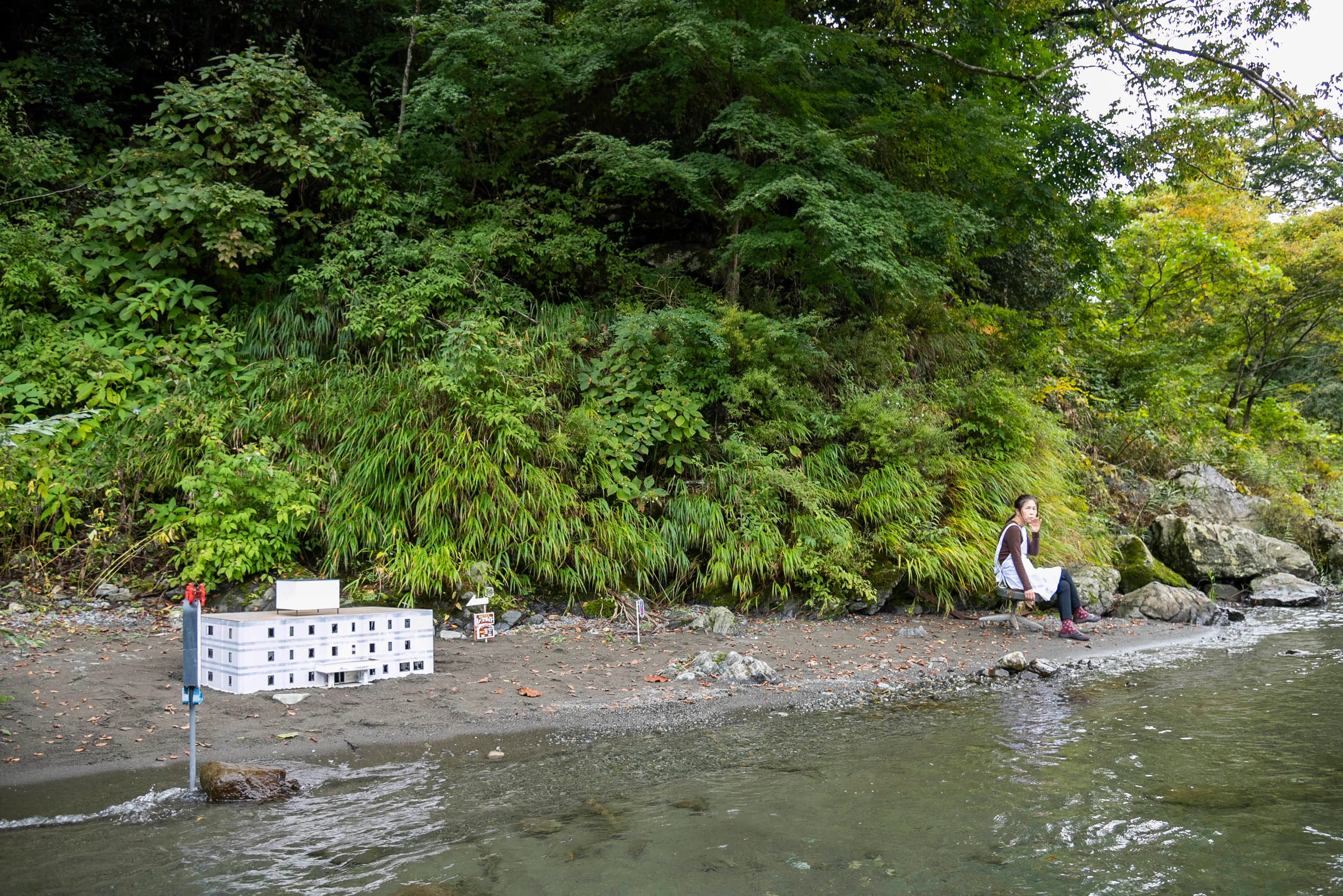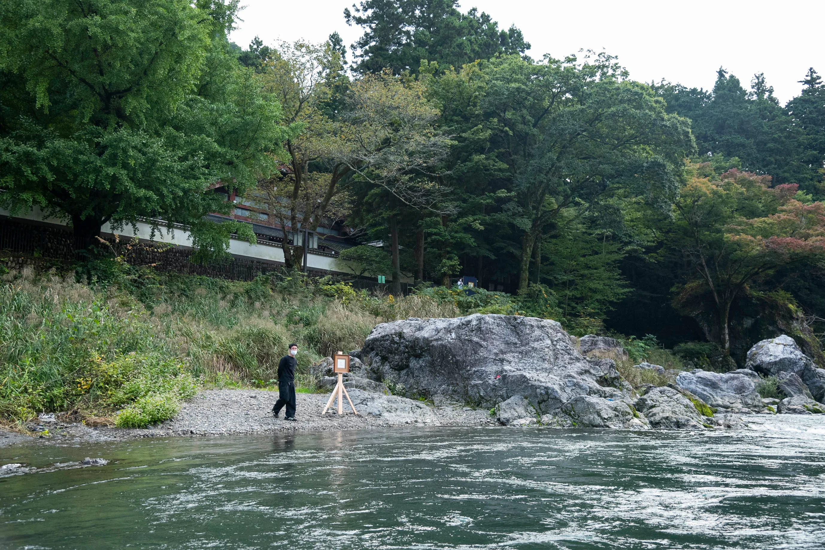 また、玉堂の少し先には、先日急逝した篠田太郎の作品も展開されていた。「そこにある風景をただ見る」という作品は、いわゆる「展示」とは異なるアイデアにもとづいているが、造園家としての経験から現代美術の世界に足を踏み出した篠田の思想に触れるものでもある。ボートをしばし川面に止め、我々は川と山の風景をただ眺めるのだった。