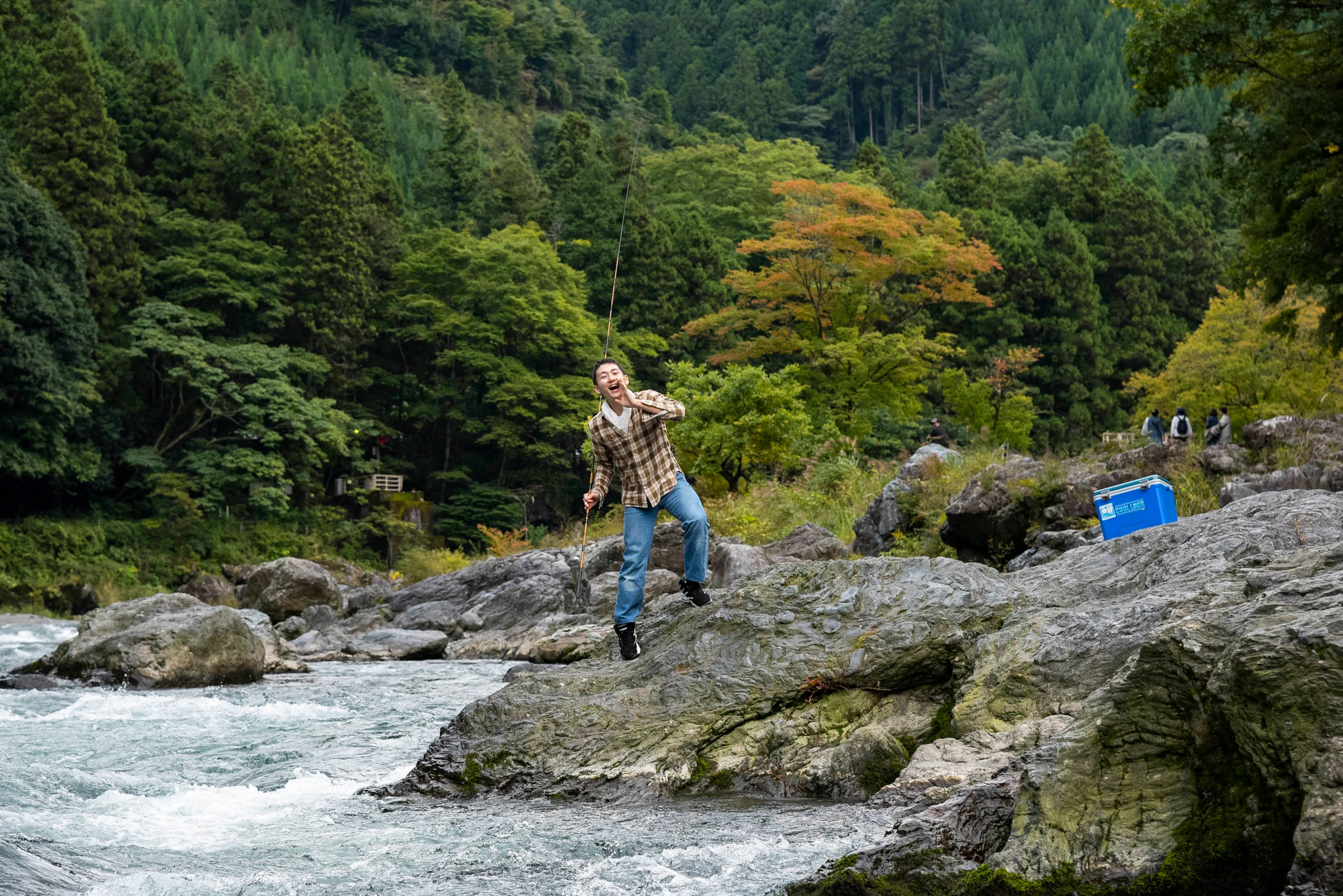 芸術激流には、川の流れを演劇的に用いた作品もある。和田昌宏は上流から下流へと計3つのしかけを用意した。我々が最初に遭遇したのは、年若い釣り客の男性。