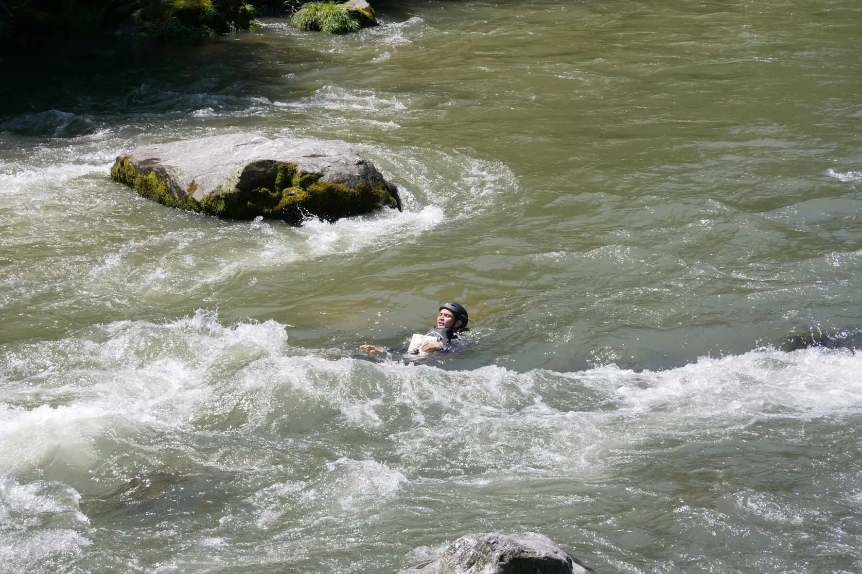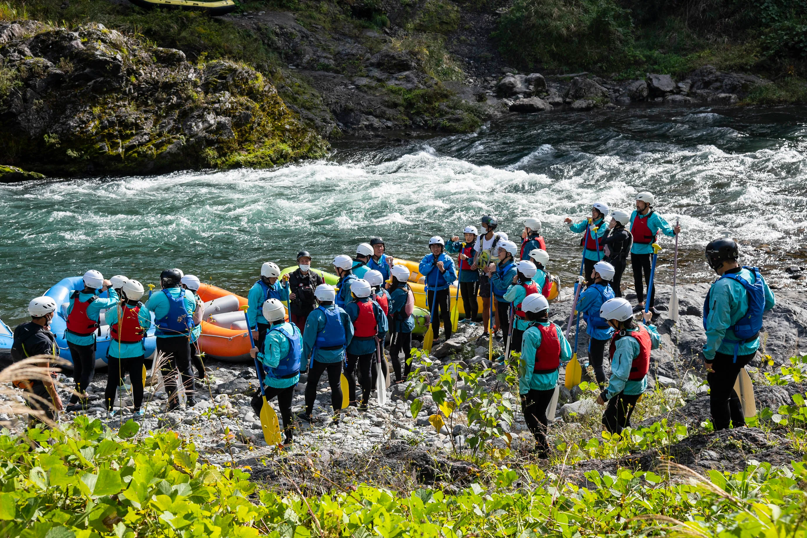 各ボートにはラフティングクラブ所属のガイドがひとりずつ同船し、かれらの掛け声に合わせてパドルを漕いだり、身体をボート内に伏せたりすることになる。大事なのは乗船者全員の気持ちがひとつになることだが、プロフェッショナルのガイドがリードしてくれることに少しずつ安心感が高まってくる。なんとか生きて帰って来れるかもしれない。さあ、出航だ!!!