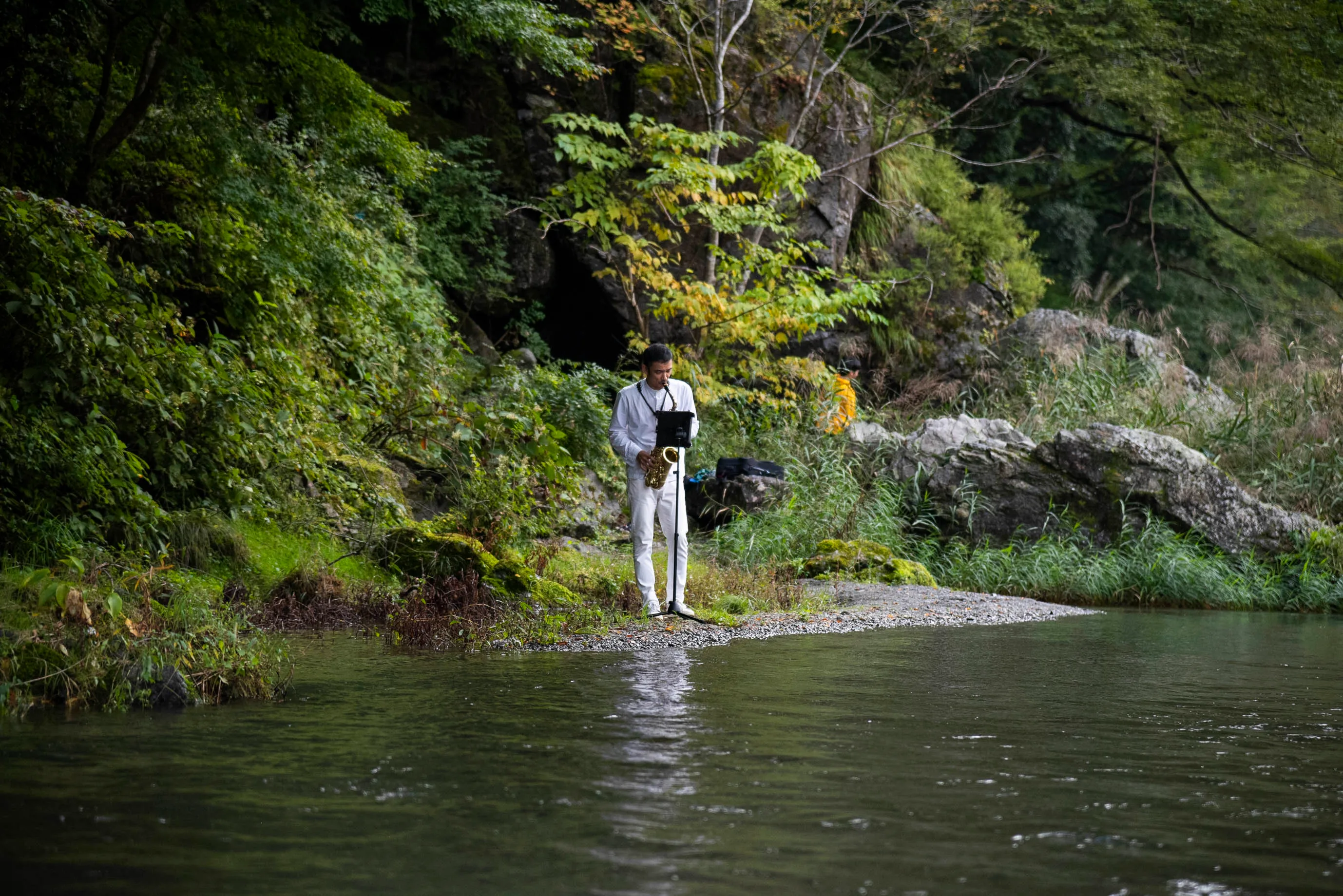 壁を人力で登攀するボルダリングに適した大岩がある御岳渓谷では、その練習に打ち込む大小のグループを何度も見かけるが「ひょっとしてこれも作品?」と疑わしい気持ちにどんどんなっていく。だからサックス奏者である大石将紀も、都会の喧騒を離れて川辺で楽器の演奏をする人のようにも見えてきたりするから困る(困らないが)。