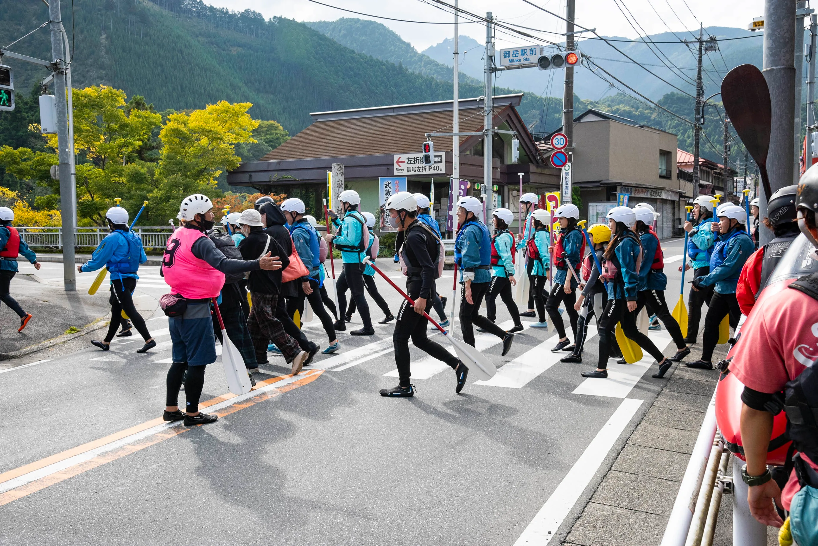 ようやく目的地の御嶽駅に到着。ここから徒歩1分ほどの場所にある「みたけレースラフティングクラブ」が集合場所だ。それぞれの体型に合わせてウェットスーツ、ヘルメット、パドルが支給され、ボートごとに8人程度のグループに分けられる。