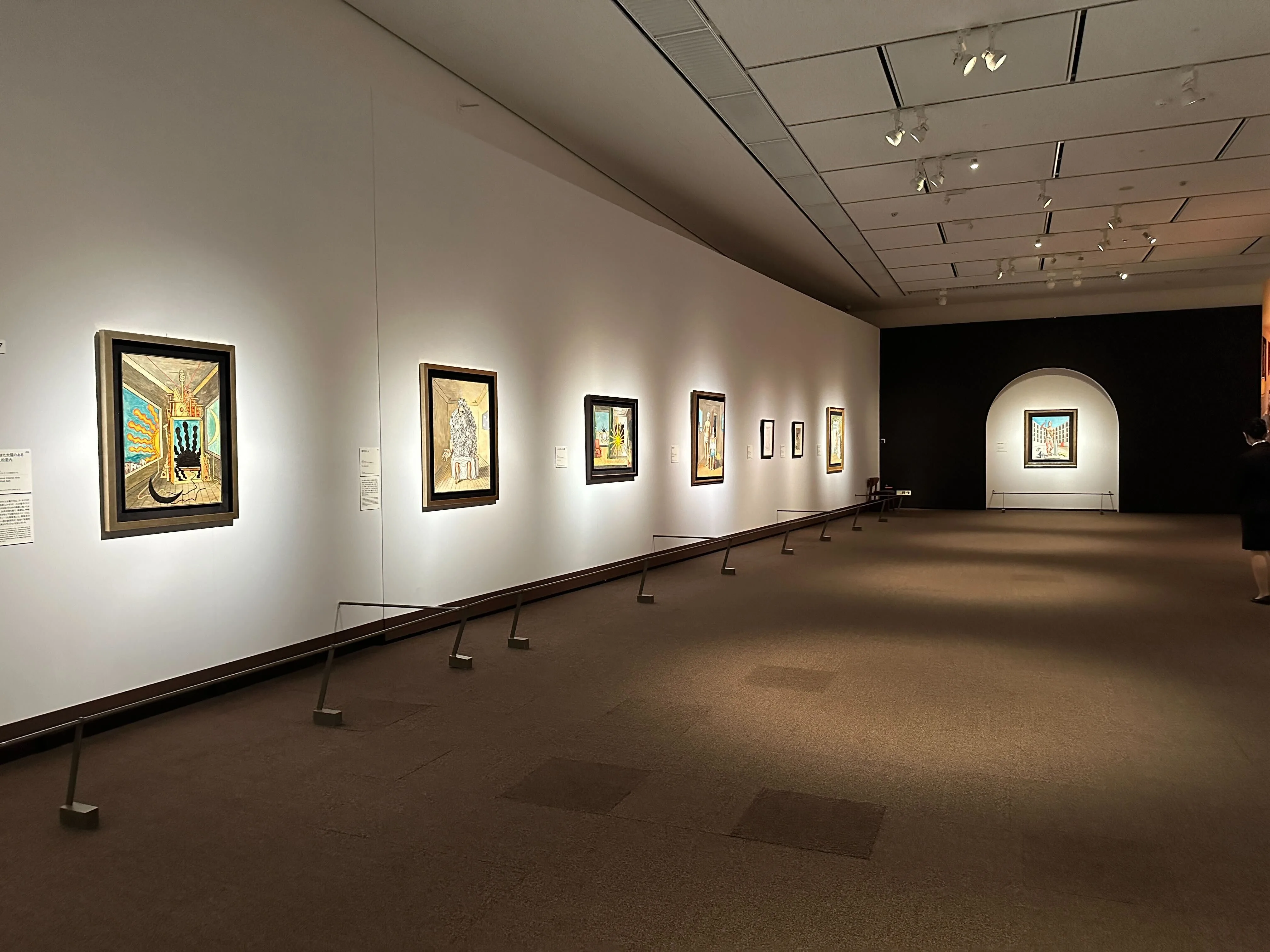 展示を順を追って見ていくと、形而上室内を描いた作品においても制作年代ごとの差異が感じられる。形而上室内を描き始めた初期の作品が閉塞感の強い、どこか抽象的で暗い画面構成なのに対し、中期~後期の作品では部屋の内部に窓が描かれるようになり、それにともなって画面全体の明るさと奇妙な奥行き感が強調されている。