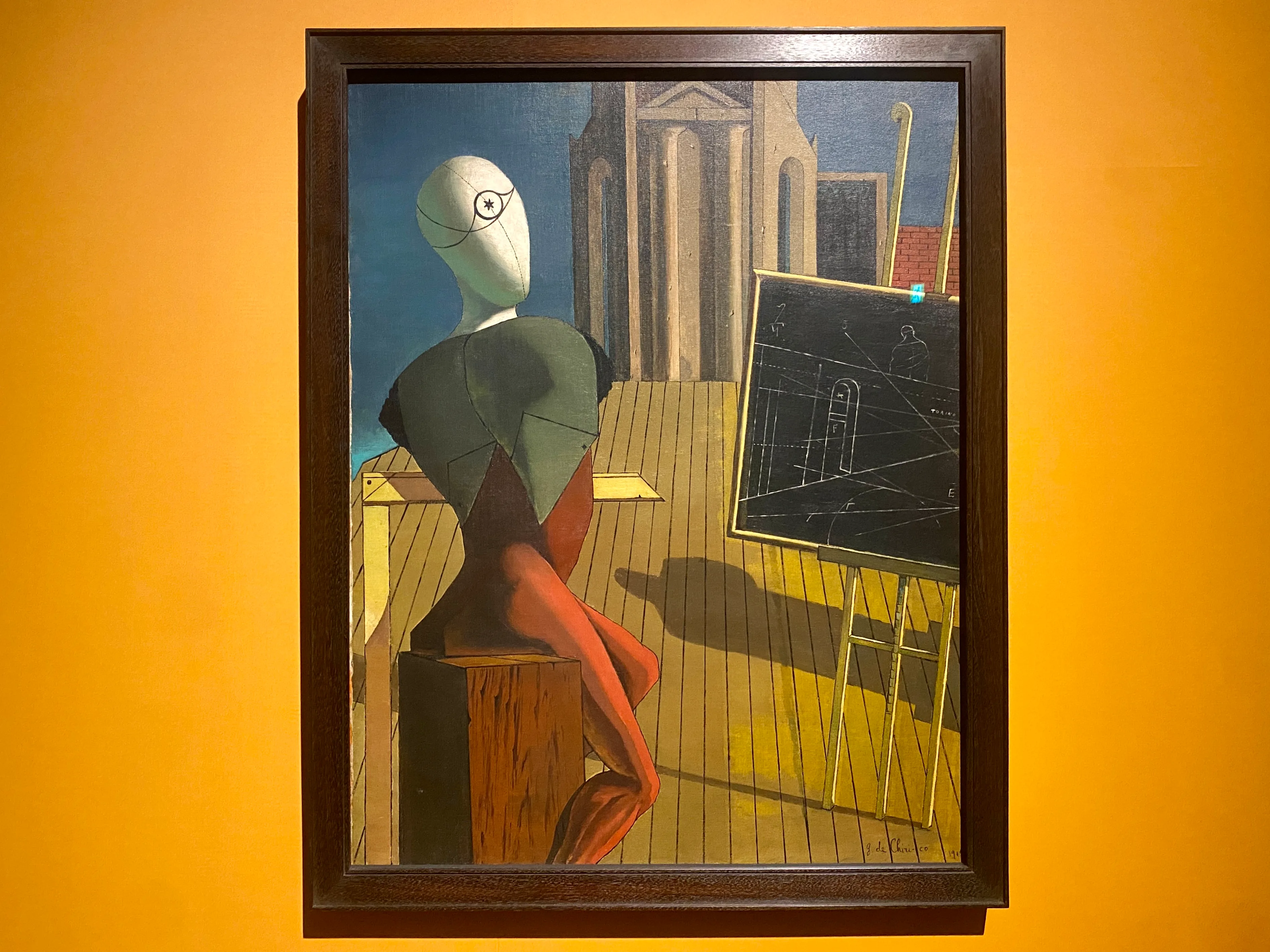 展示室を抜けていくと、そこには彼の代名詞ともいえる、形而上絵画が目に入ってくる。形而上絵画は、それまでの伝統的な写実/網膜絵画を超越し、私たちが見ている世界の奥底にある非日常的で神秘的な世界をほのめかすような絵画だ。デ・キリコはある日、見慣れたはずの街の広場が、初めて見る景色であるかのような感覚に襲われたことが形而上絵画誕生の「啓示」となったと語ったという。