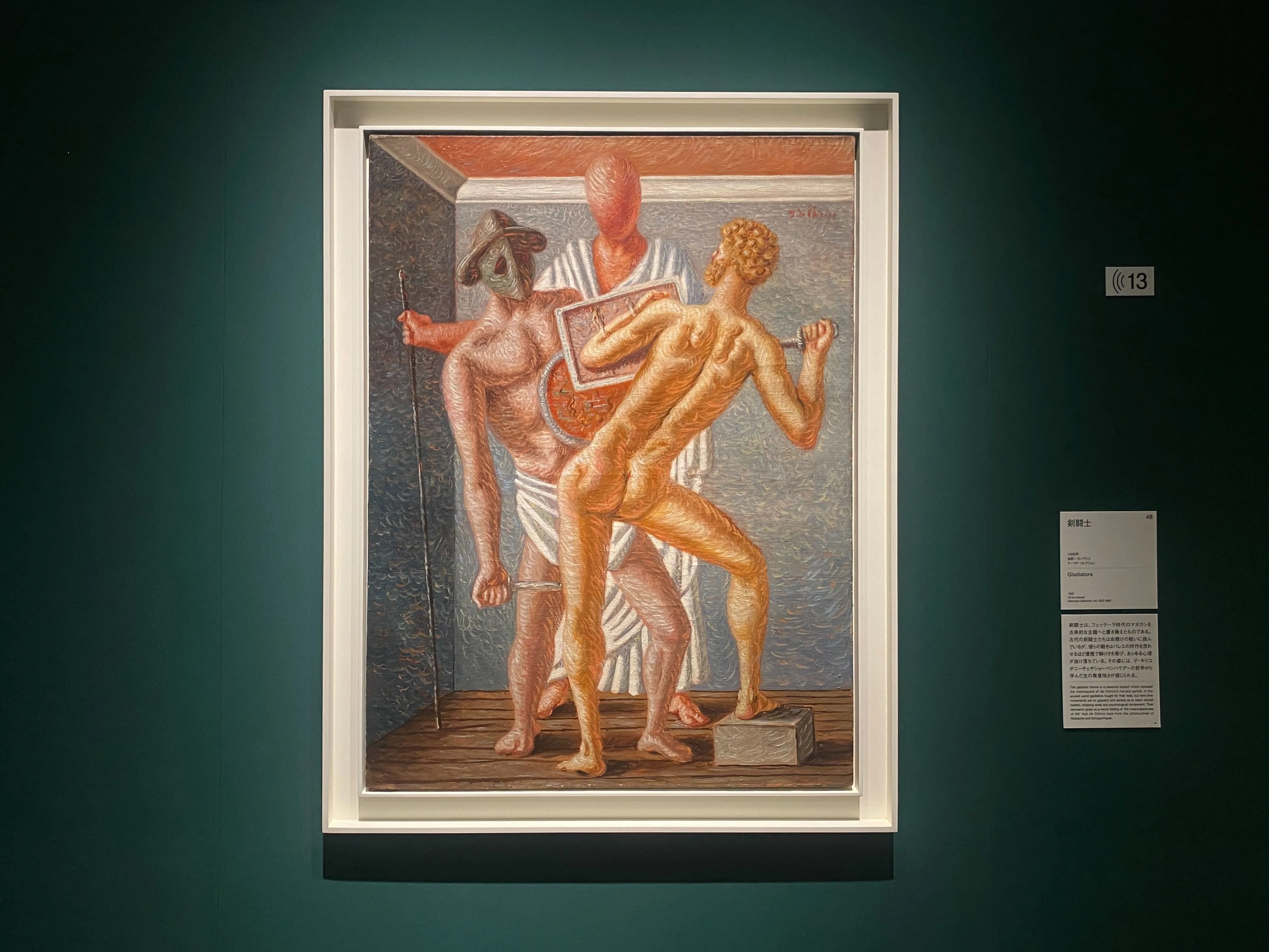 担当学芸員の髙城は、デ・キリコにとって前衛的な表現と古典主義的な表現は相反するものではなく、彼は常に古典と前衛という2つの美学を持ち合わせている画家なのだと語ってくれた。前衛的なものの中にある古典的なもの、古典的なものの中にある前衛的なものこそが、デ・キリコの絵画世界に独特の違和感と、神秘性・演劇性をもたらしているのであり、それらは彼の熱心な古典美術/技法に対する研究の成果なのだ。