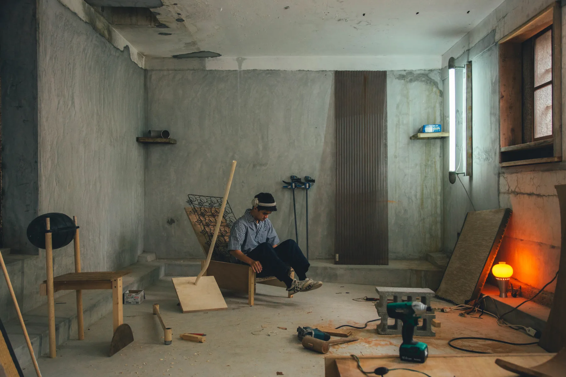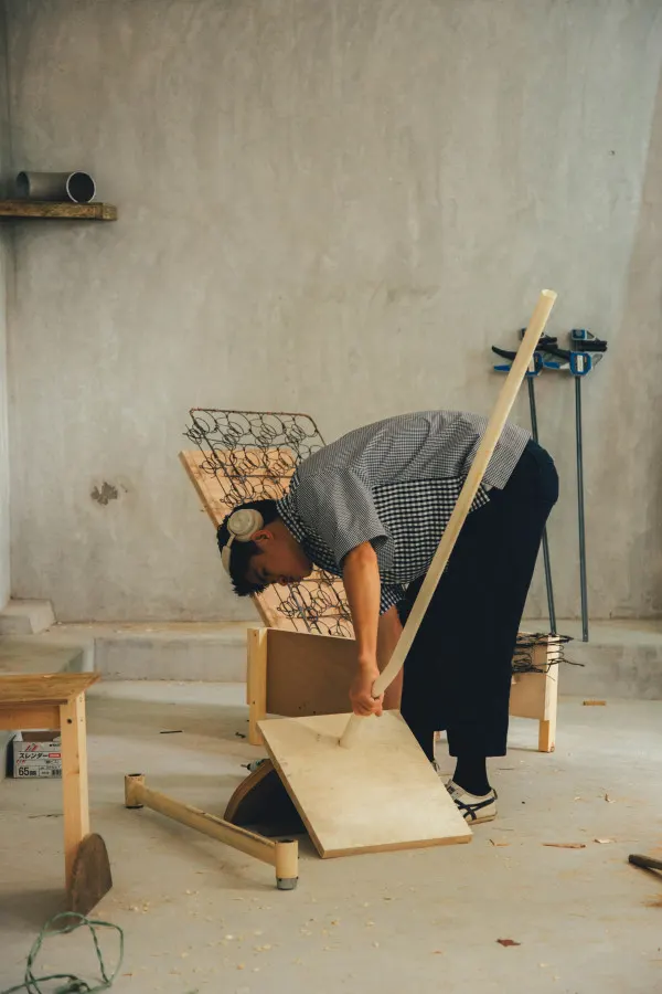 地下ギャラリー・Baison Azitoには、デザイナー兼写真家・Dương Gia Hiếu(ズオン・ギア・ヒエウ)によるインスタレーション空間が広がっていた。彼はベトナムで自身が空間設計をしたバー兼スペースを運営している。室内に点在する家具は、すべて廃屋から発見されたものを素材に組み合わせて作られたもの。手作りという行為や既存のものを再利用する術を忘れ、購入で済ませてしまう物質主義への問いかけでもある。日本もベトナムも同じだという。