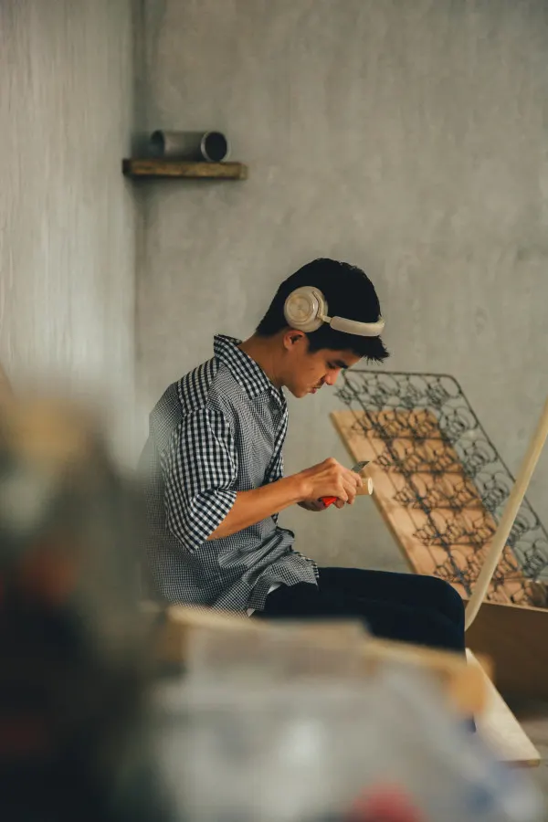 建築家・Ngô Đức Bảo Lâm(ゴ・ドゥク・バオ)の作品が見えてくる。直前にビザが降りずにオンライン制作を余儀なくされ、設計図の指示を受けた西村組とのセッション制作となった。「巣」というテーマと展示場所の風景を伝えて、来日メンバーと同様の条件で制作した。