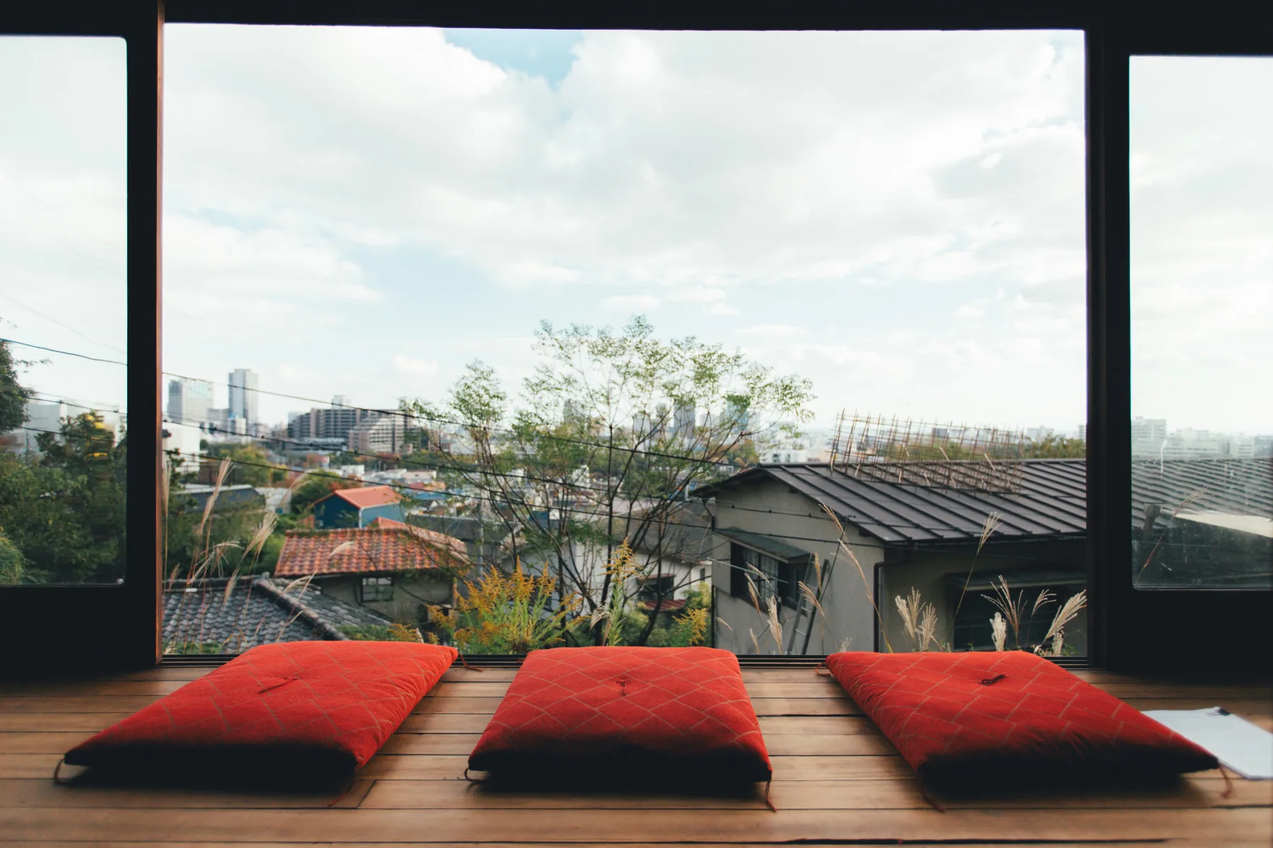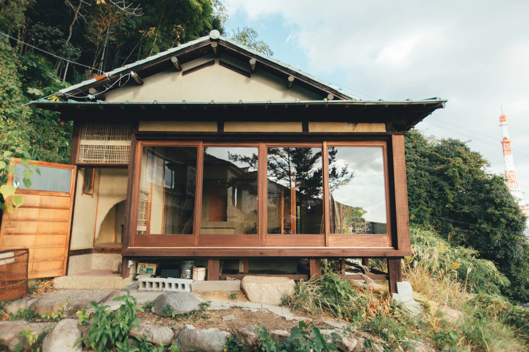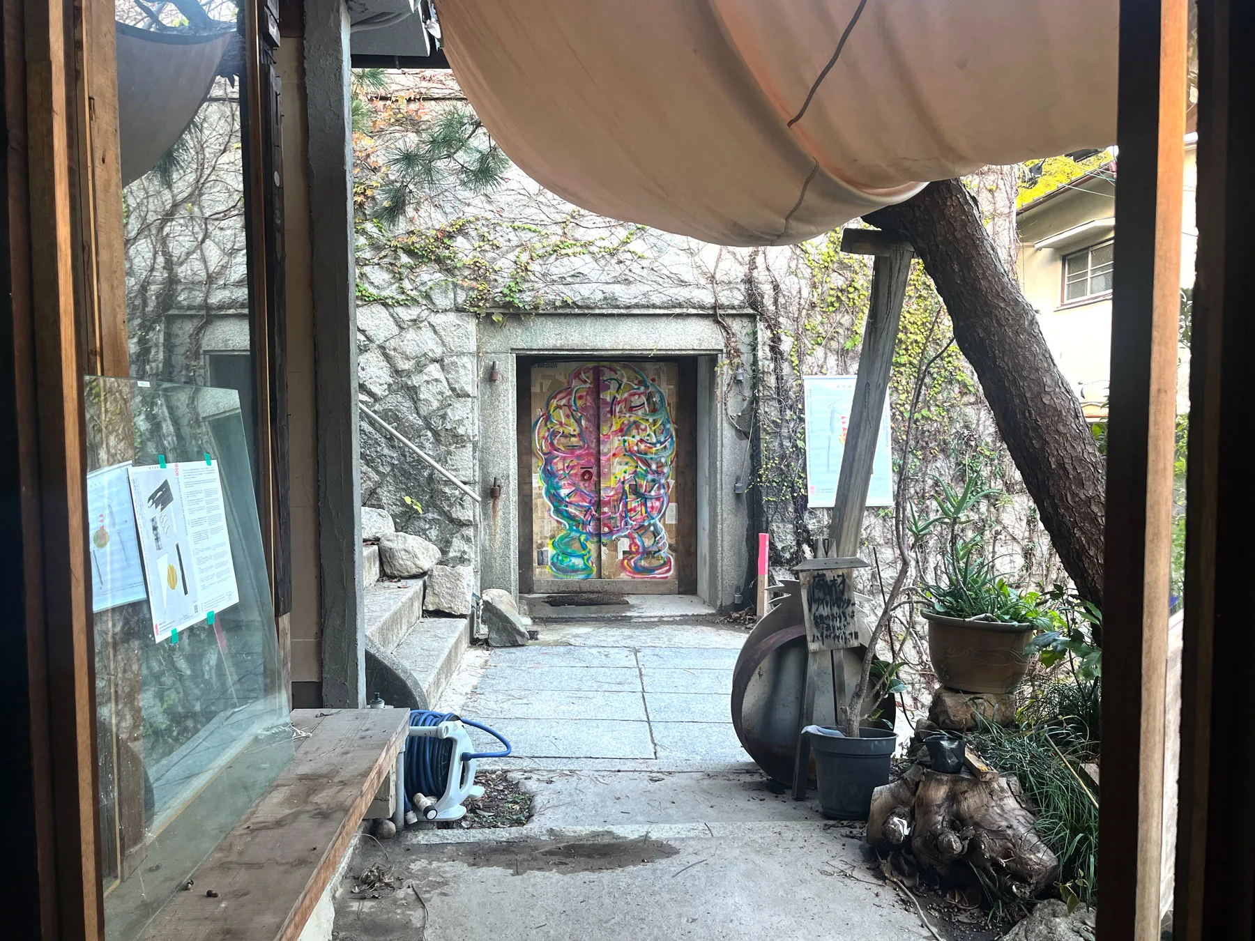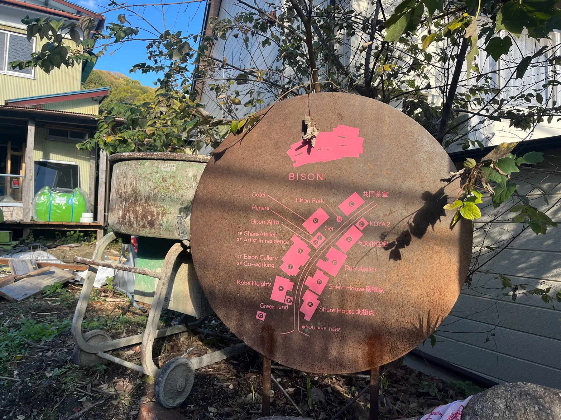 神戸市兵庫区梅元町にあるバイソンとは、西村組が改修した空き家群だ。神戸の繁華街三宮からバスに15分ほど揺られて住宅街に向かい、坂を登ると見えてくる集落がそれだ。このエリア一帯に残っていた廃屋を1軒ずつ購入して改修を加え、現在ではギャラリー、地下ギャラリー、アトリエ兼住宅、コワーキングオフィス、シェアハウス、共同茶室などの9棟が群れをなしている。