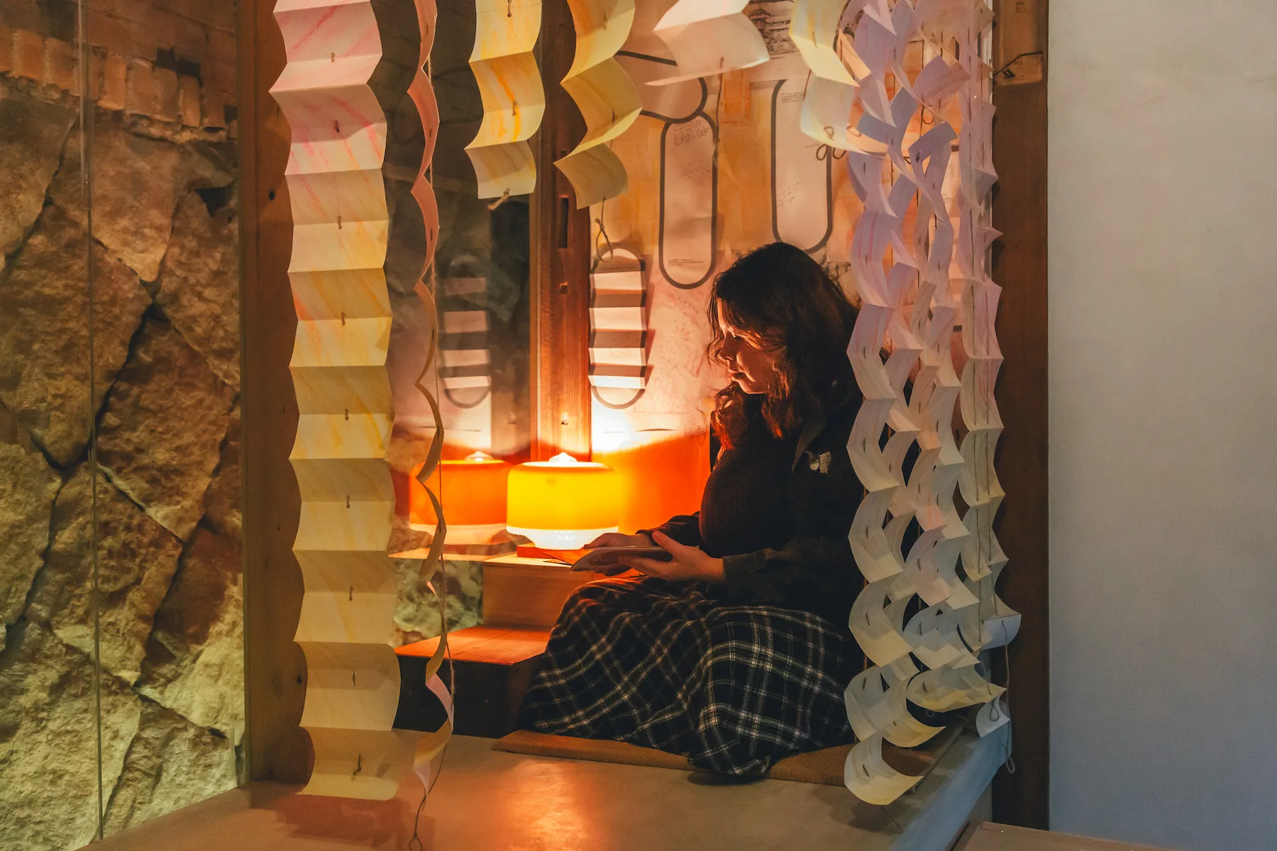 インターディサプリナリーデザイナー・Cécile Ngọc Sương Perdu(セシル・ゴック・スオン・ペルドゥ)による《untitled(Kobe)》(2023)は、巣をシェルターや安全性という意味に捉えた。小さな読書コーナーを作るインスタレーションは、「ヌック=隠れ家」に誘い、壁に貼られたプリントのコレクションに没入させる。彼女の2冊のZINEは、街中を歩き回って、スマホでスクショしながら丁寧に作り上げるゲリラプリンティングという手法が用いられている。