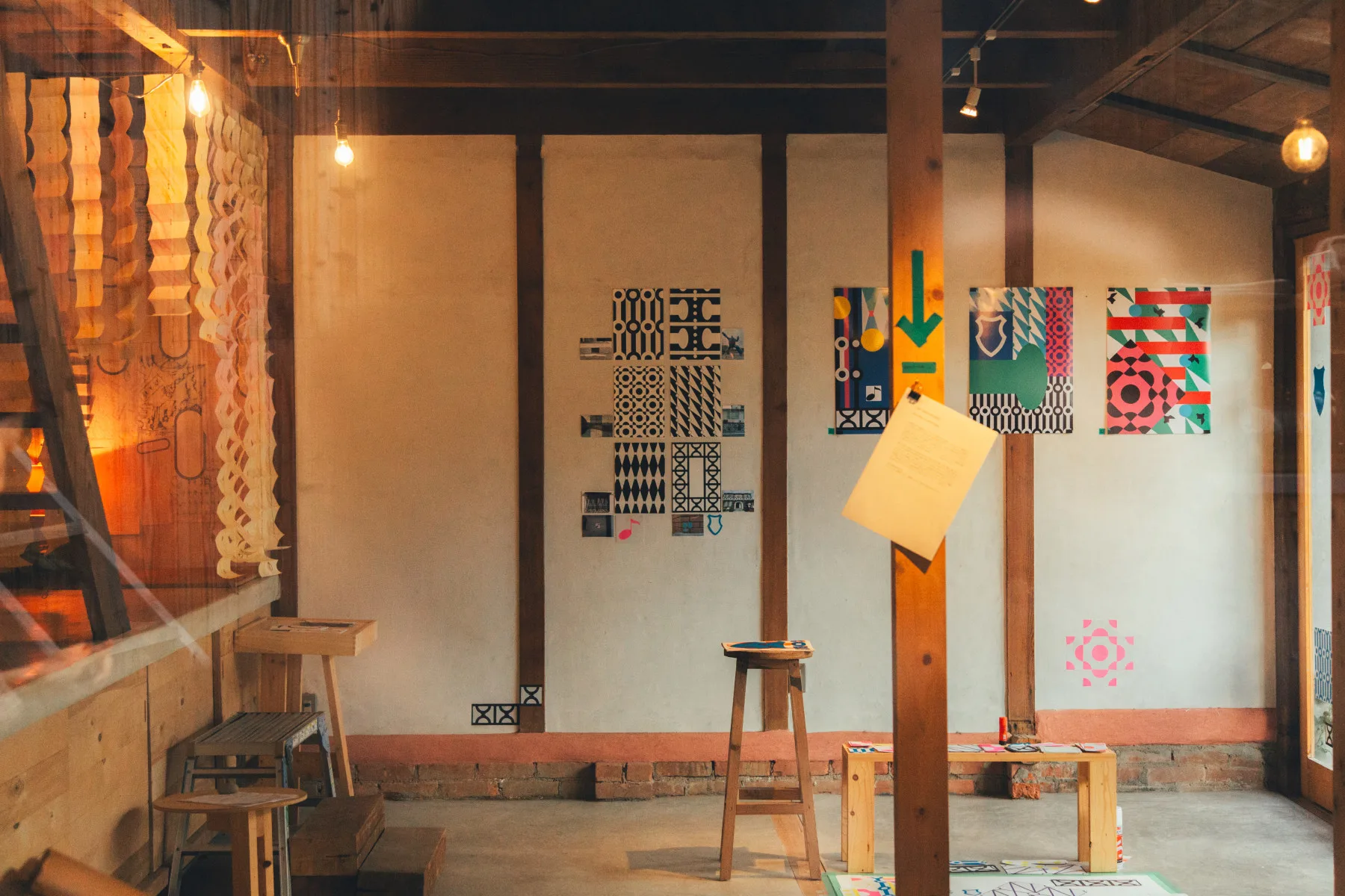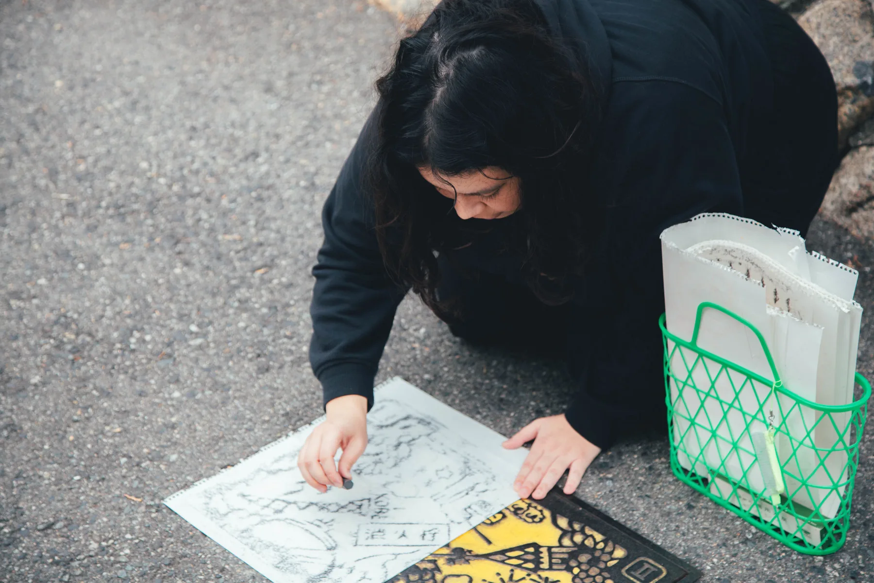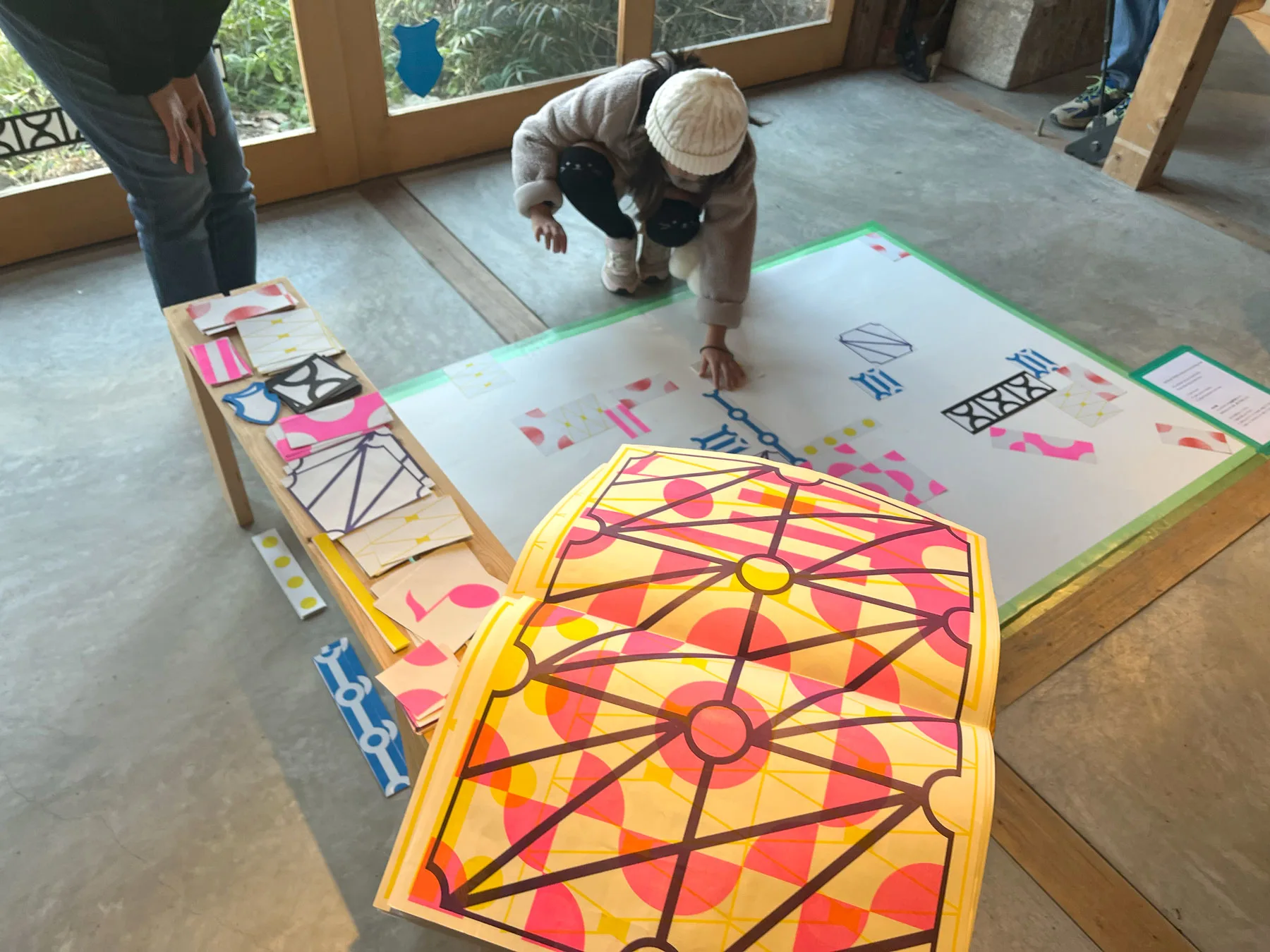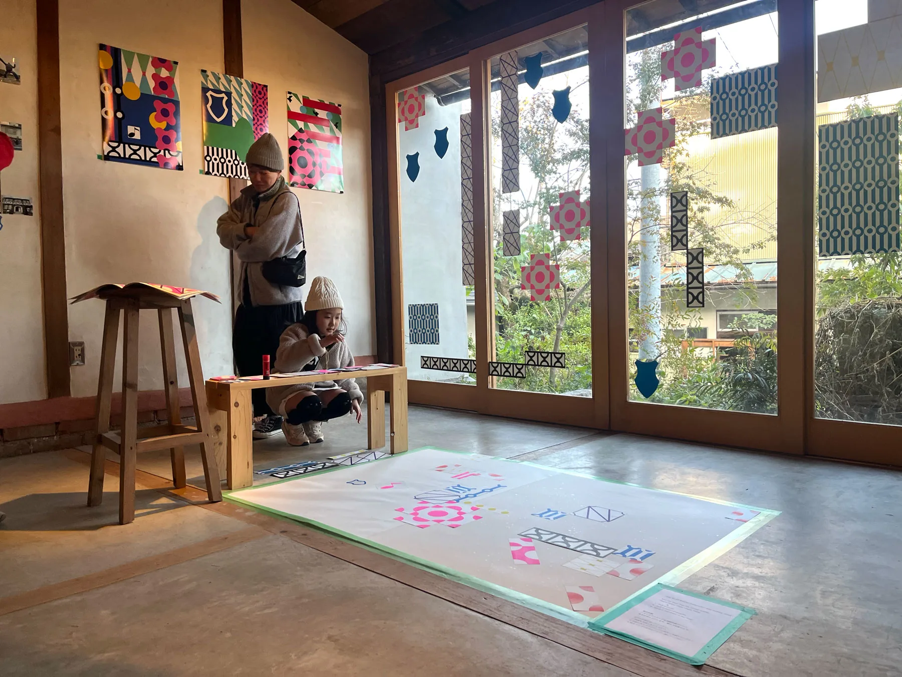 グラフィックデザイナー・Simon Phan(サイモン・ファン)は、鉄の窓枠から地元のテキスタイル・パターンなどを作るアーティストだ。神戸をリサーチし、その風景をテキスタイルに落とし込んだ作品《I SPY WHIT MA EYES》(2023)を発表した。またそれらのテキスタイルを参加者が自由に組み合わせて地図を作成する、《THE PLAY ROOM (interactive map making zone)》(2023)というプレイフルな仕掛けにも落とし込んだ。