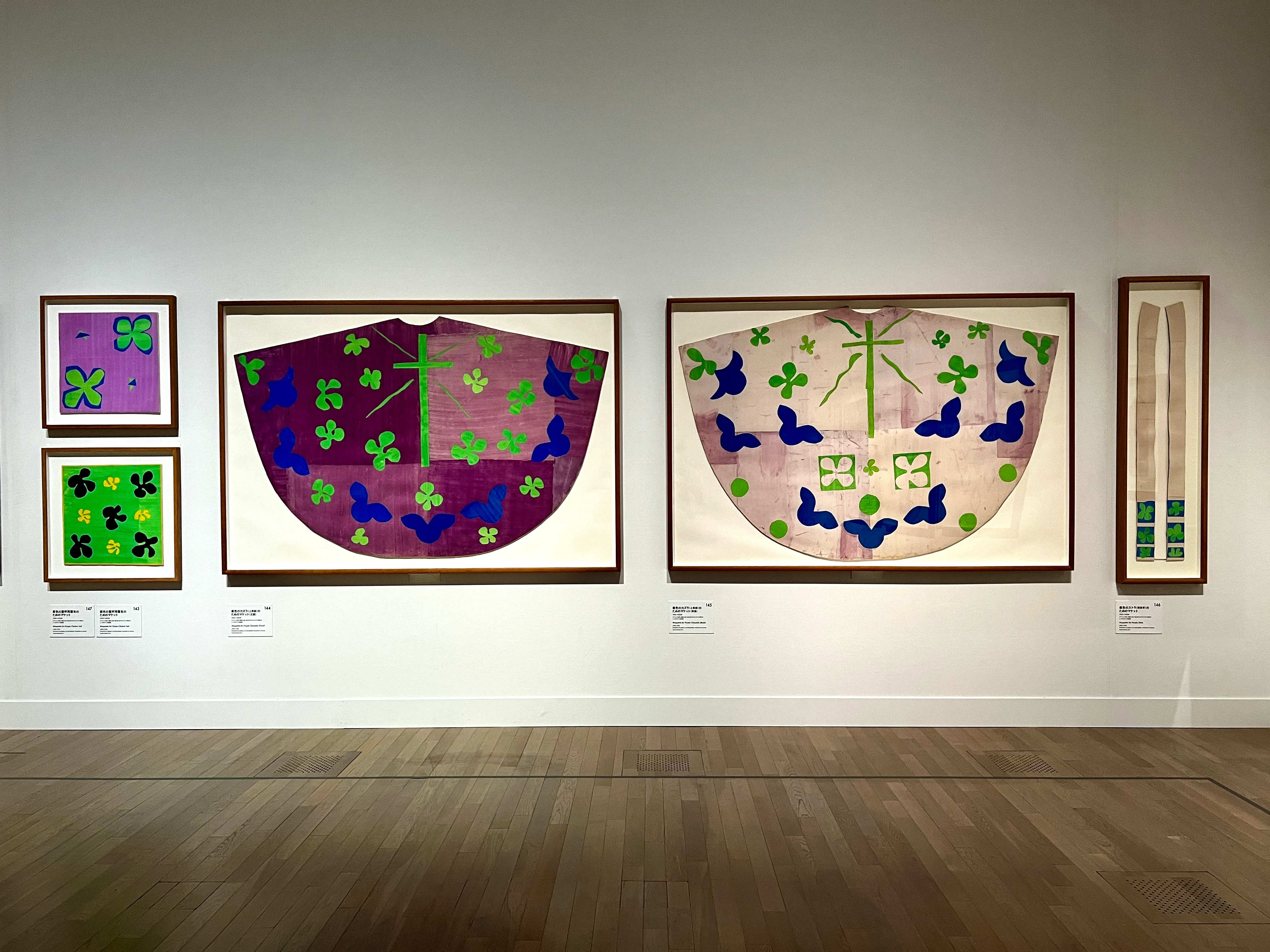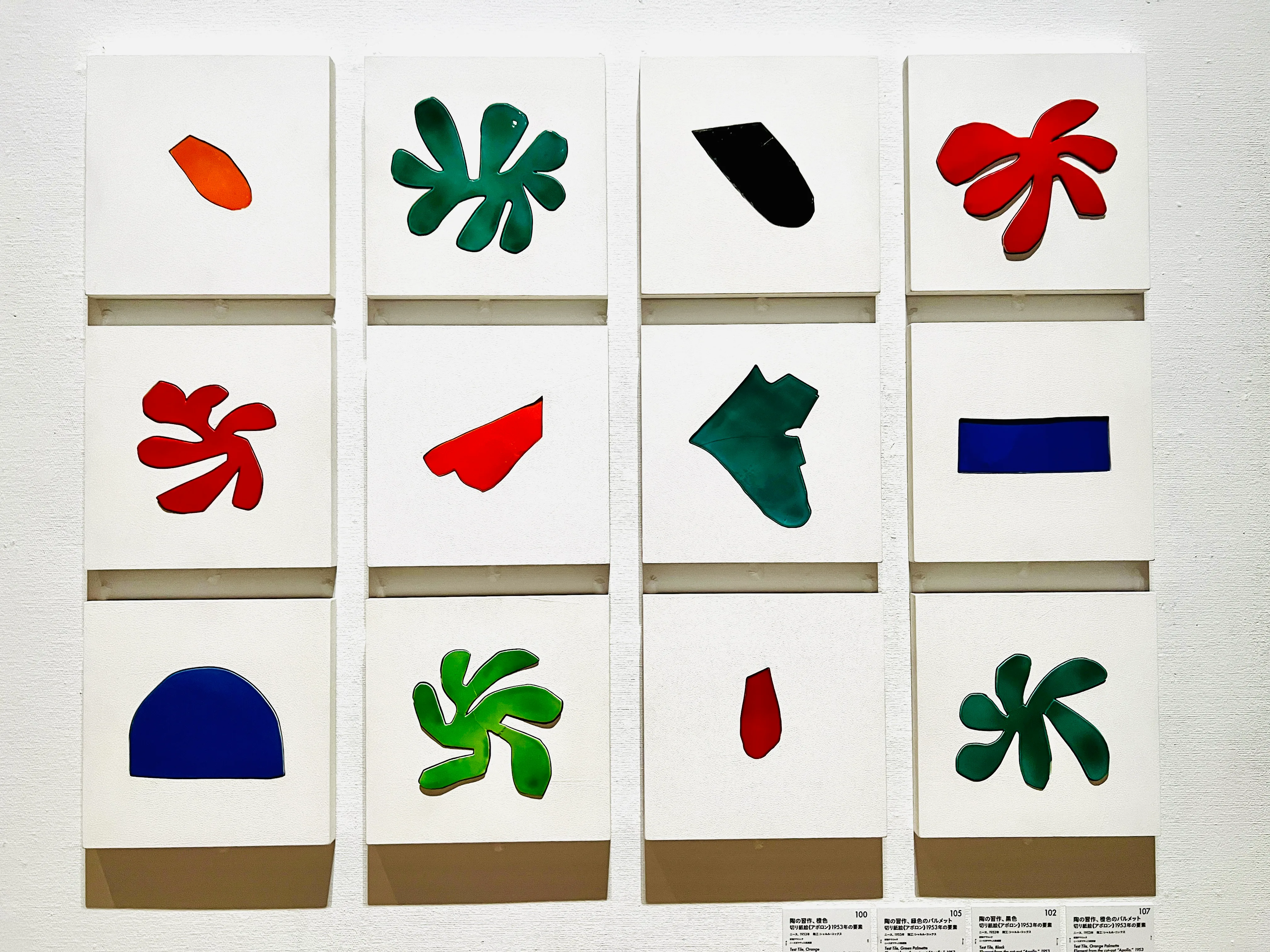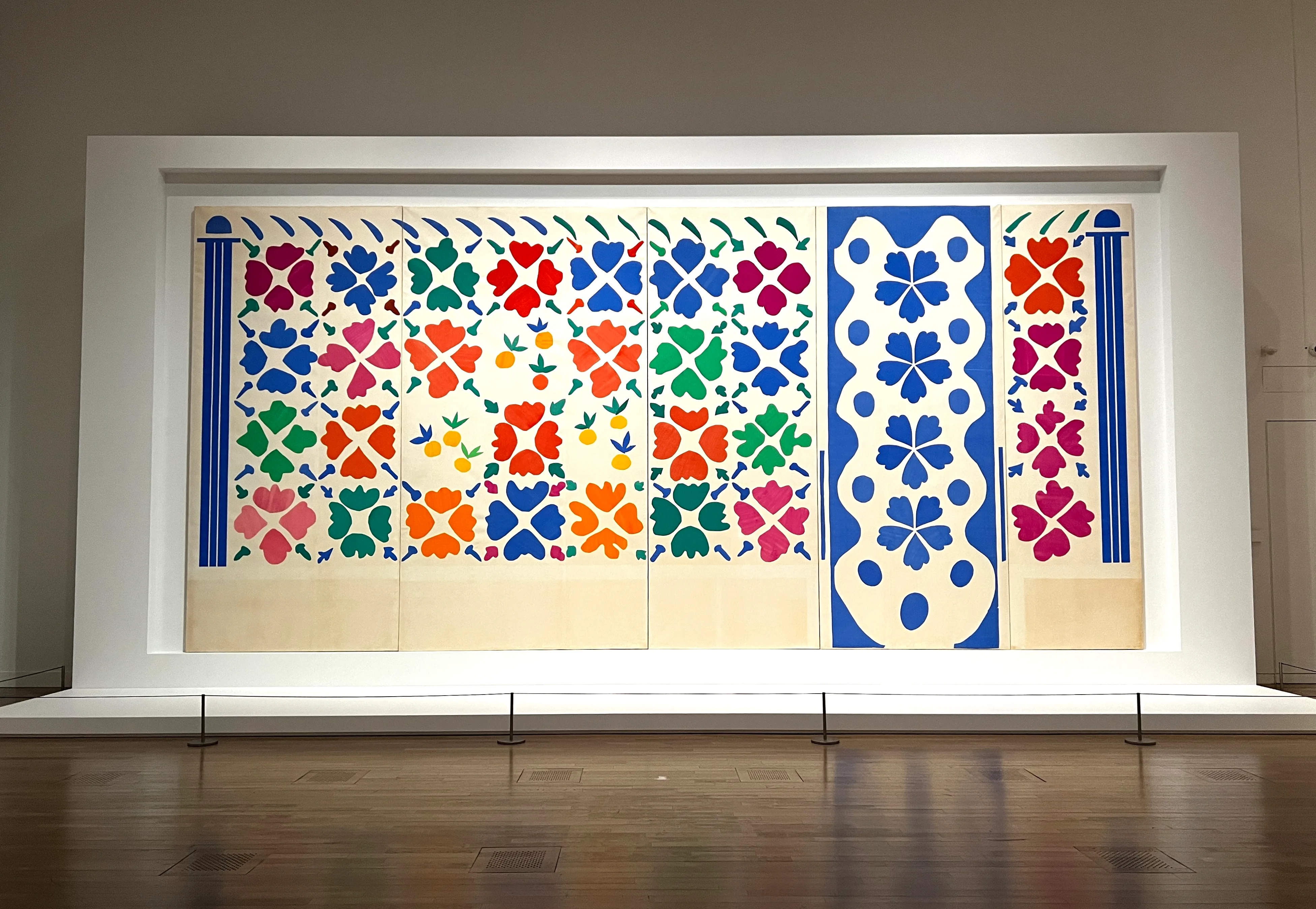 本作は、アメリカ人コレクターから中庭を飾る陶板絵による大型壁面装飾の依頼を受けたマティスが、その構想を練るなかで制作した切り紙絵によるマケットのひとつ。5枚のキャンバスを使った縦4.1m、横8.7mに及ぶ大作で、花と果実の形態が様々な色で反復されている。こうした形態の変容や交換、配置の変更などにあたって、容易に手繰ることができる切り紙絵の手法は非常に効果的だった。