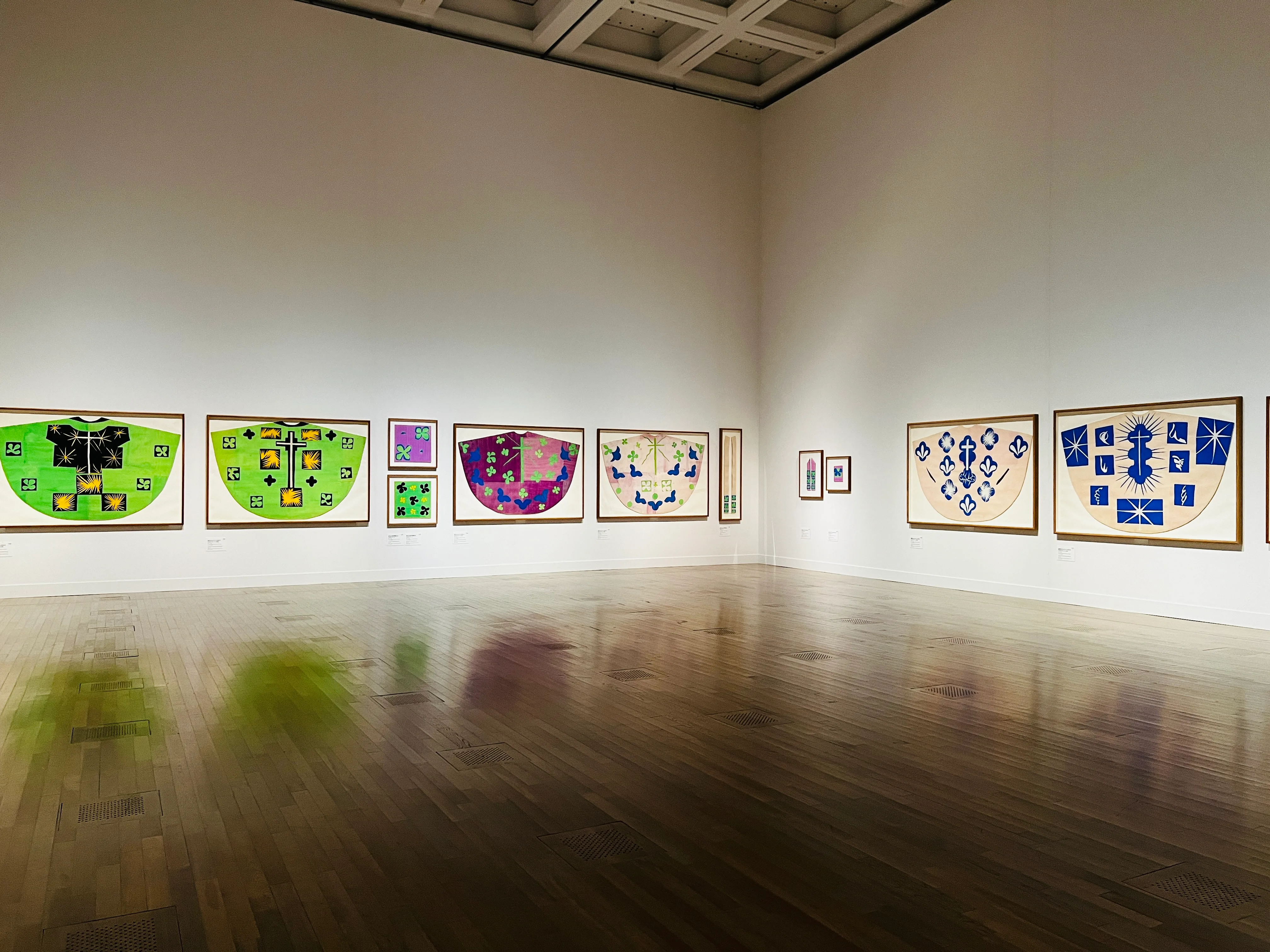 数年の疎開生活を送ったヴァンスで、マティスは建築空間やデザイン・装飾、絵画や彫刻といった自身の芸術のすべてを統合する最高傑作「ロザリオ礼拝堂」を手がけた。1947年にドミニコ会の修道士から建設の相談を受けたことをきっかけに、礼拝堂のためのステンドグラス、陶板壁画、告解室の扉、磔刑像、司祭服、儀礼用装身具などを制作。51年に献堂式が行われたが、マティスは体調不良で出席が叶わなかった。