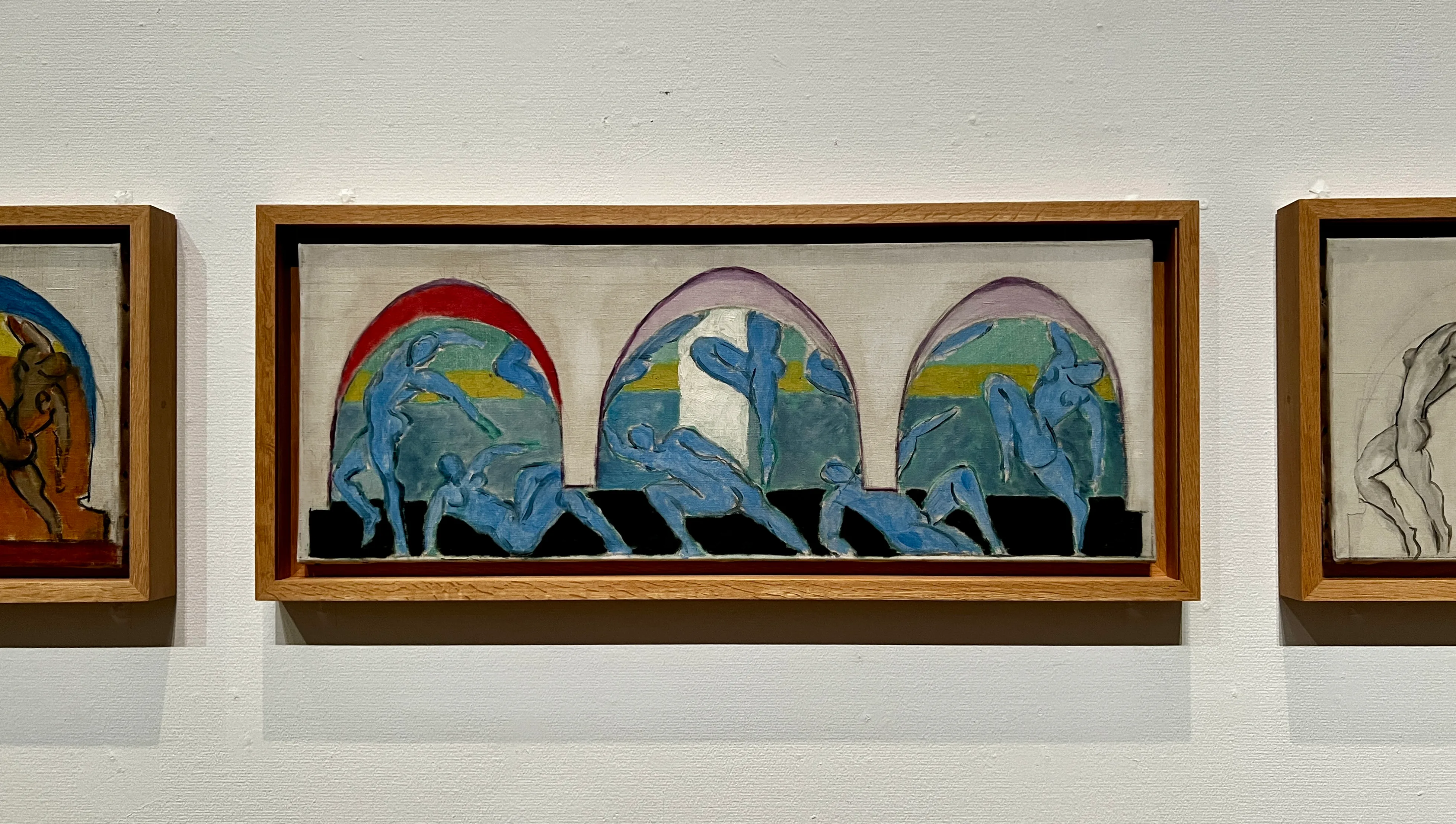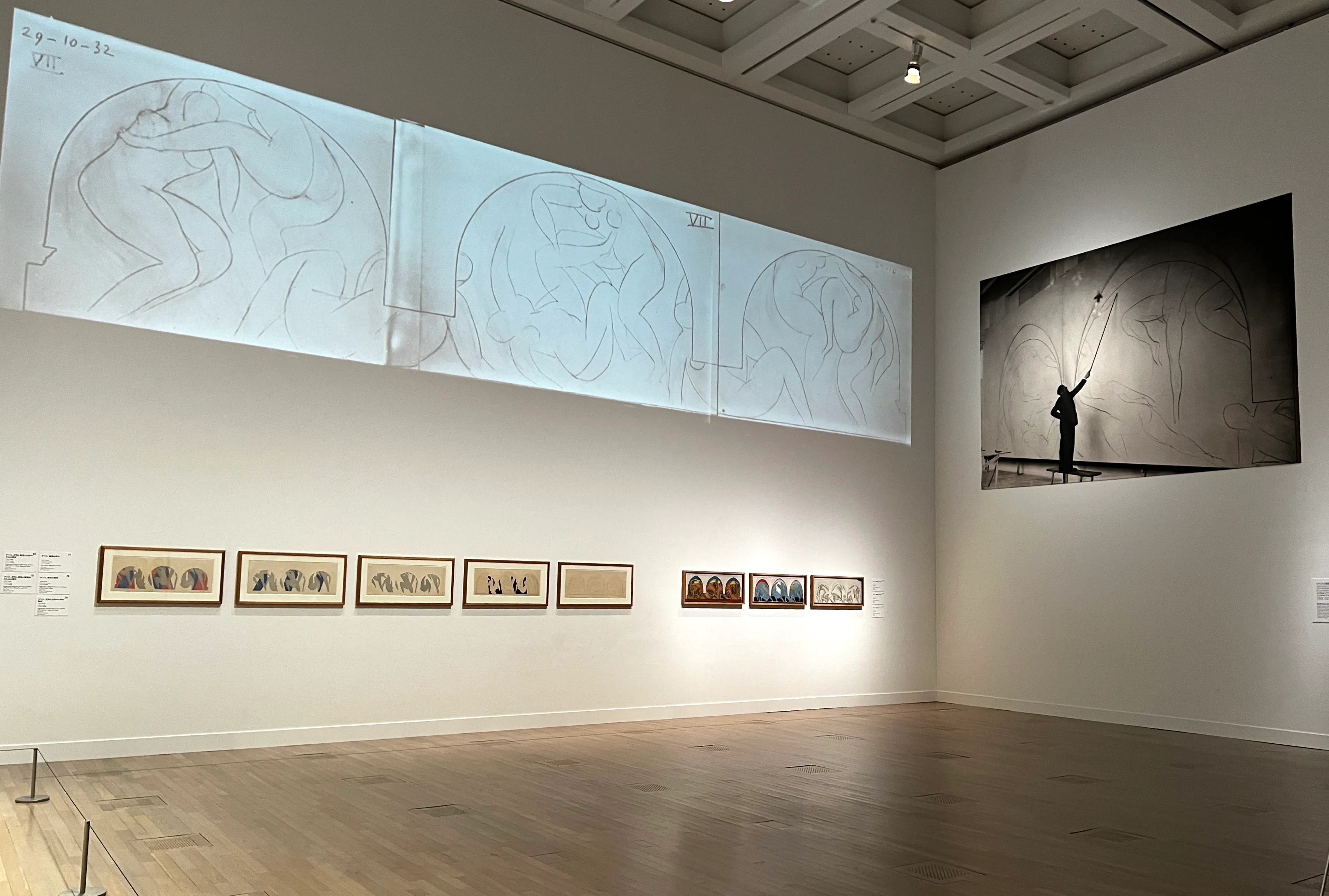 61歳を迎える1930年、マティスは実業家のアルバート・C・バーンズに壁画《ダンス》の制作を依頼された。本展ではこの依頼に伴う一連の《ダンス》の習作が展示され、また壁画をやや縮小したサイズでプロジェクターで壁に投影している。