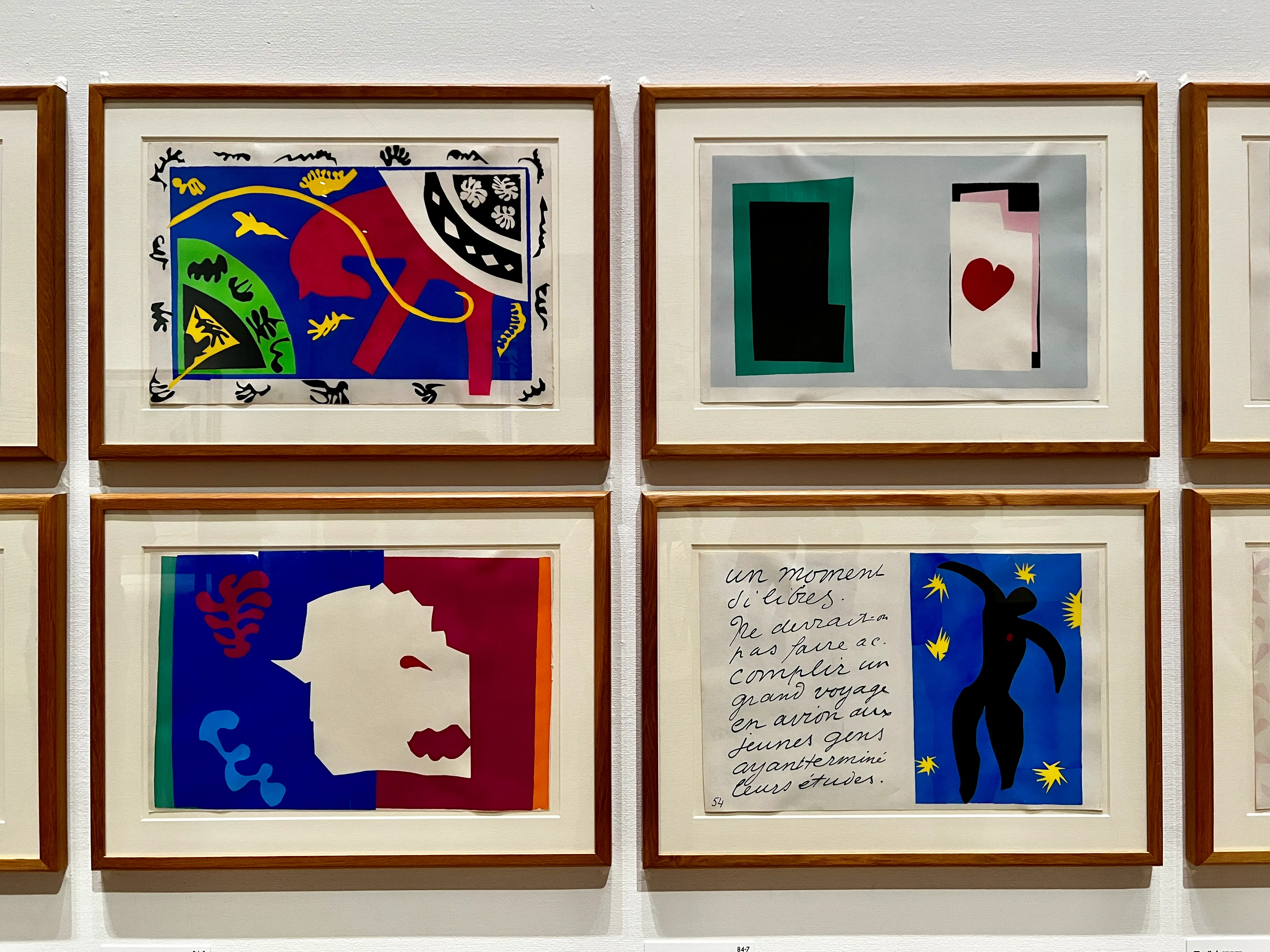 41年に腸の手術を受け、その後体調が悪化。さらに43年、ニースが空爆の危機にあったことから近郊の街ヴァンスへと疎開したマティス。切り紙絵の手法が生み出されたのは、こうした体調をはじめとする様々な制約のなかでだった。しかし結果的に、切り紙絵は、それまでマティスが制作にあたり長年頭を悩ませていた「デッサンと色彩び永遠の葛藤」に決着をつける、自身の芸術の「到達点」となった。