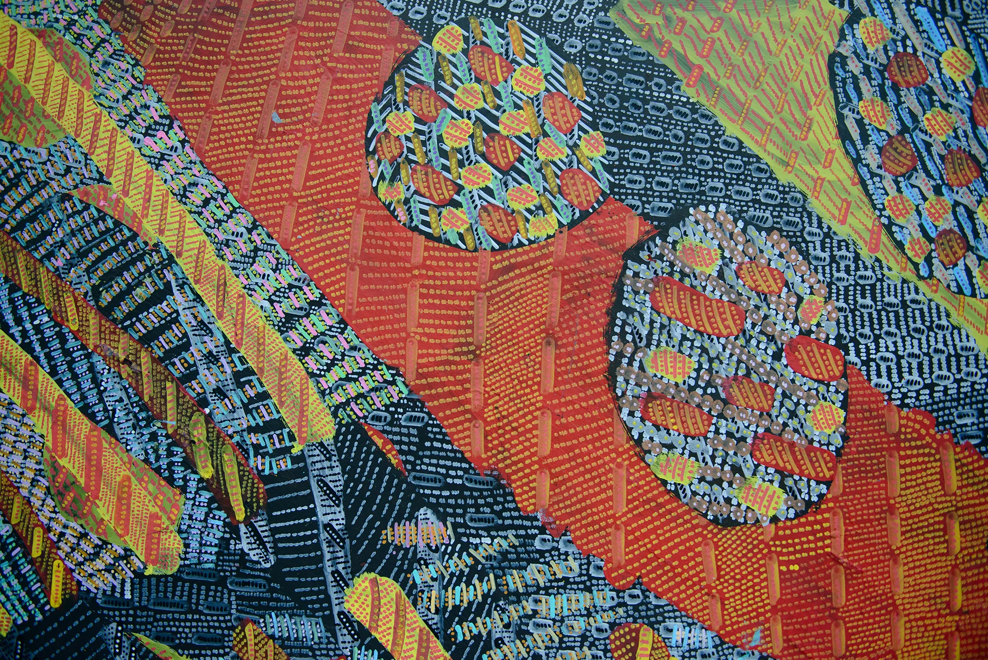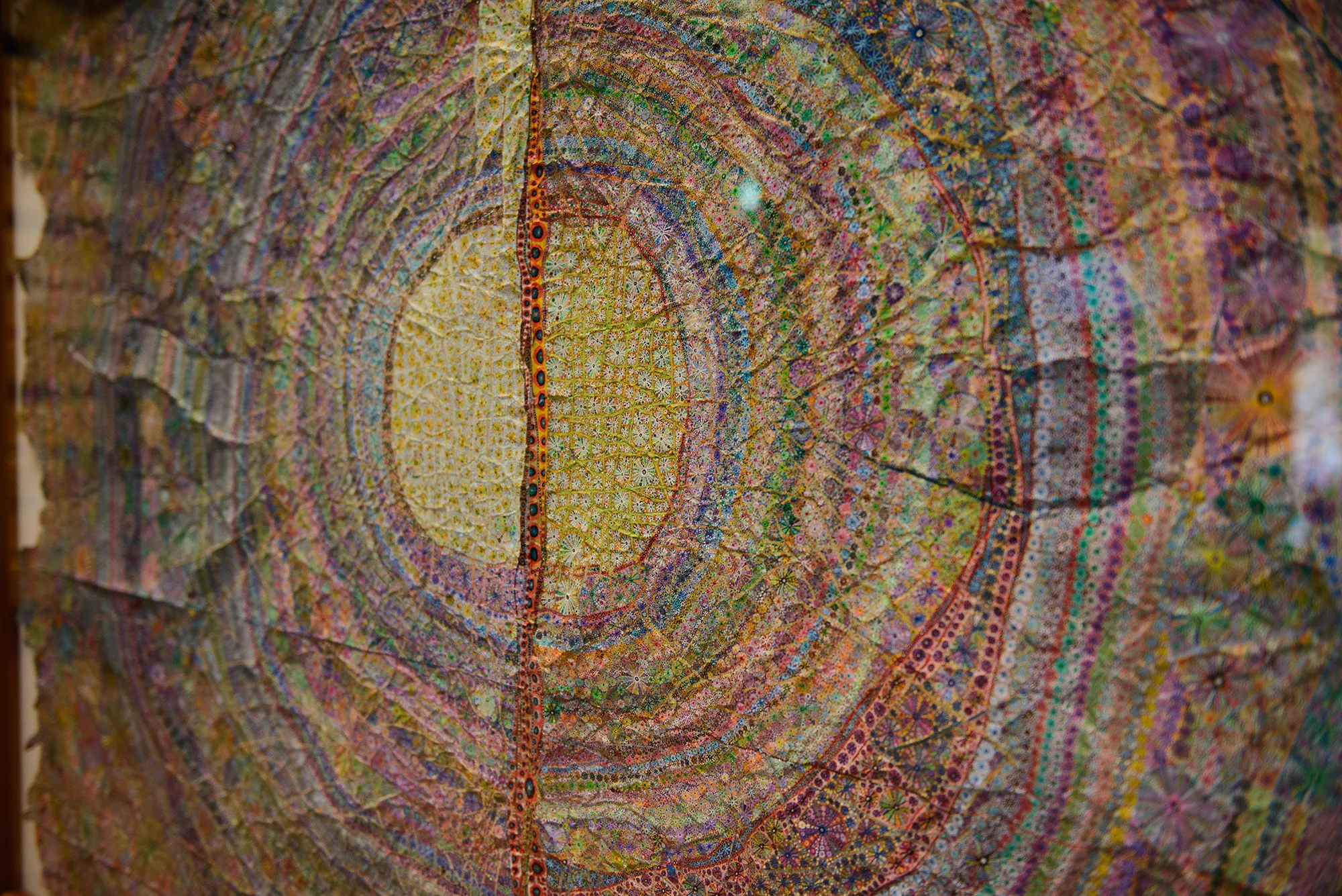 20歳で統合失調症を発症後、入退院を繰り返す浅野春香による《ヒョウカ》がグランプリを受賞。29歳で絵を本格的に描き始め、「評価されたい」という以前まで恥ずかしいと思っていた欲求を「素直な気持ちの表れ」と捉え直したことで名付けた作品だ。支持体は、切り広げた米袋。満月の夜の珊瑚の産卵をテーマに、満点の星空や宇宙、満月などのモチーフを緻密に描いた。距離をおいて作品全体を鑑賞し、徐々に目線を細部にフォーカスしていくと、大小さまざまな円環の連なりに宇宙と生命の広がりが浮かび上がってくるような没入感が生まれる。時間をかけて味わいたい作品だ。