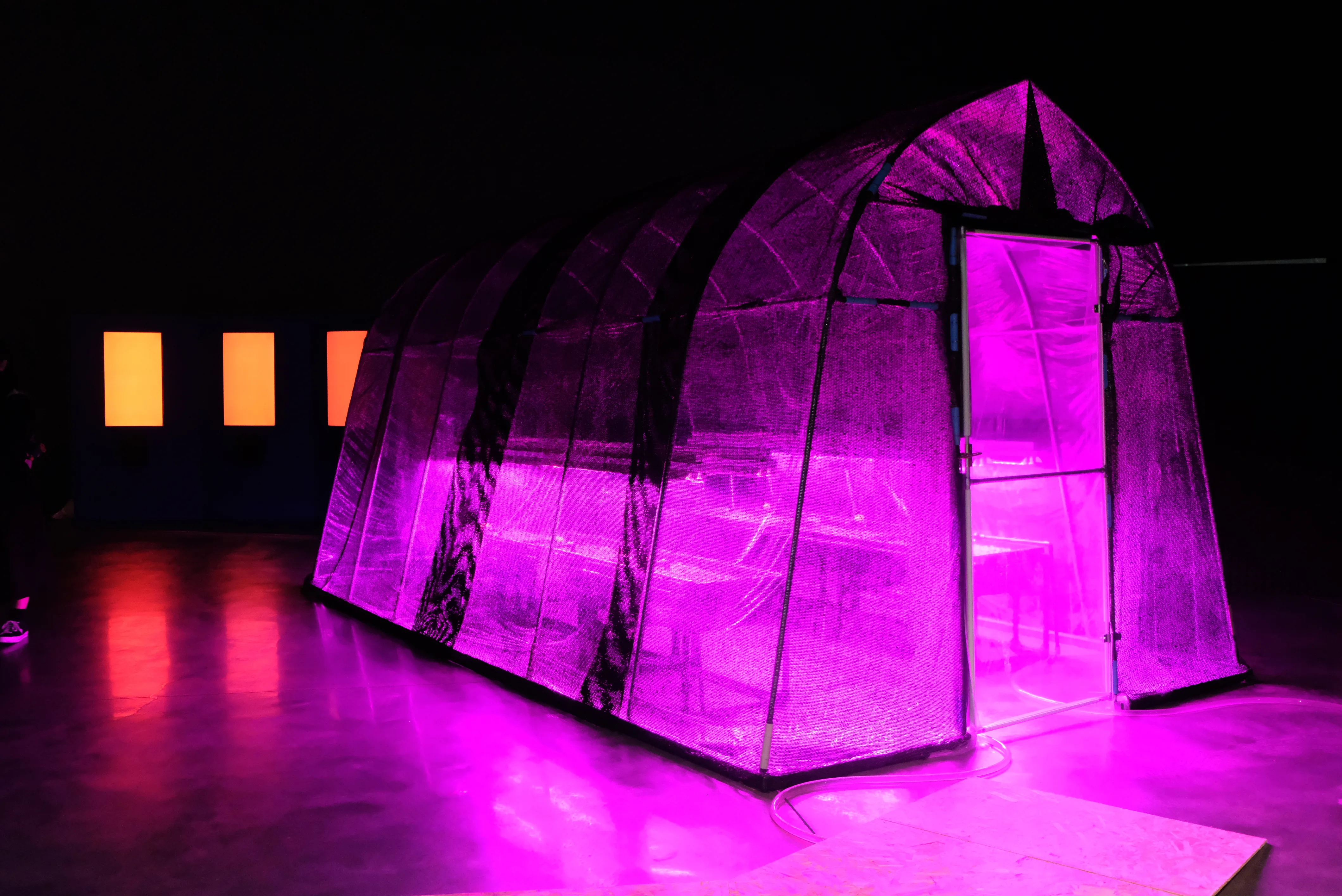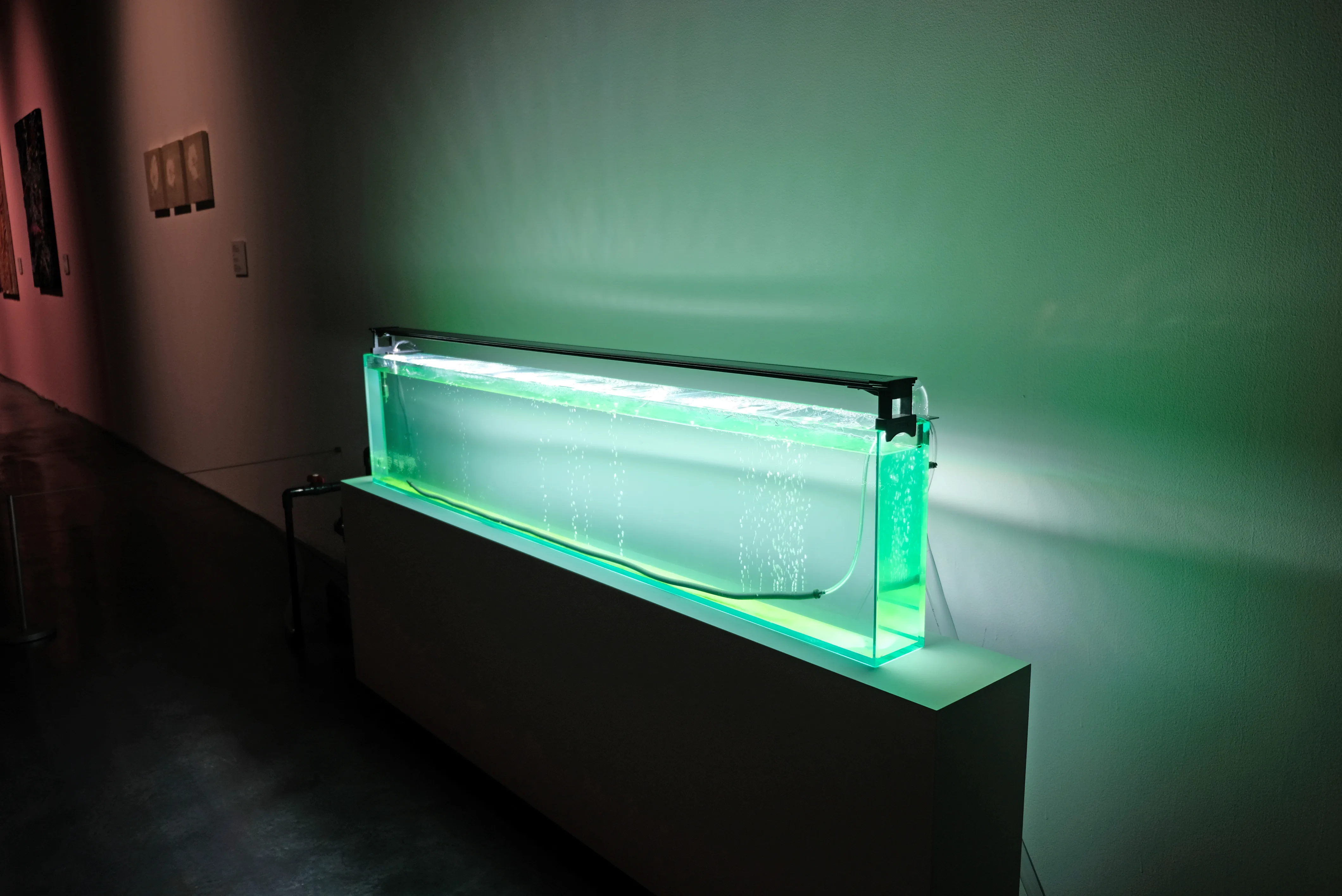 外来種や絶滅種、生態系など、人間と生物、物体との関係を問い直す作品を制作する渡辺志桜里は、新作インスタレーション《サンルーム(不在の部屋)》を発表。バクテリアや魚、植物などが入った水槽を美術館全体に配置、それぞれをホースでつなぎ、擬似的な生態系を展開している。