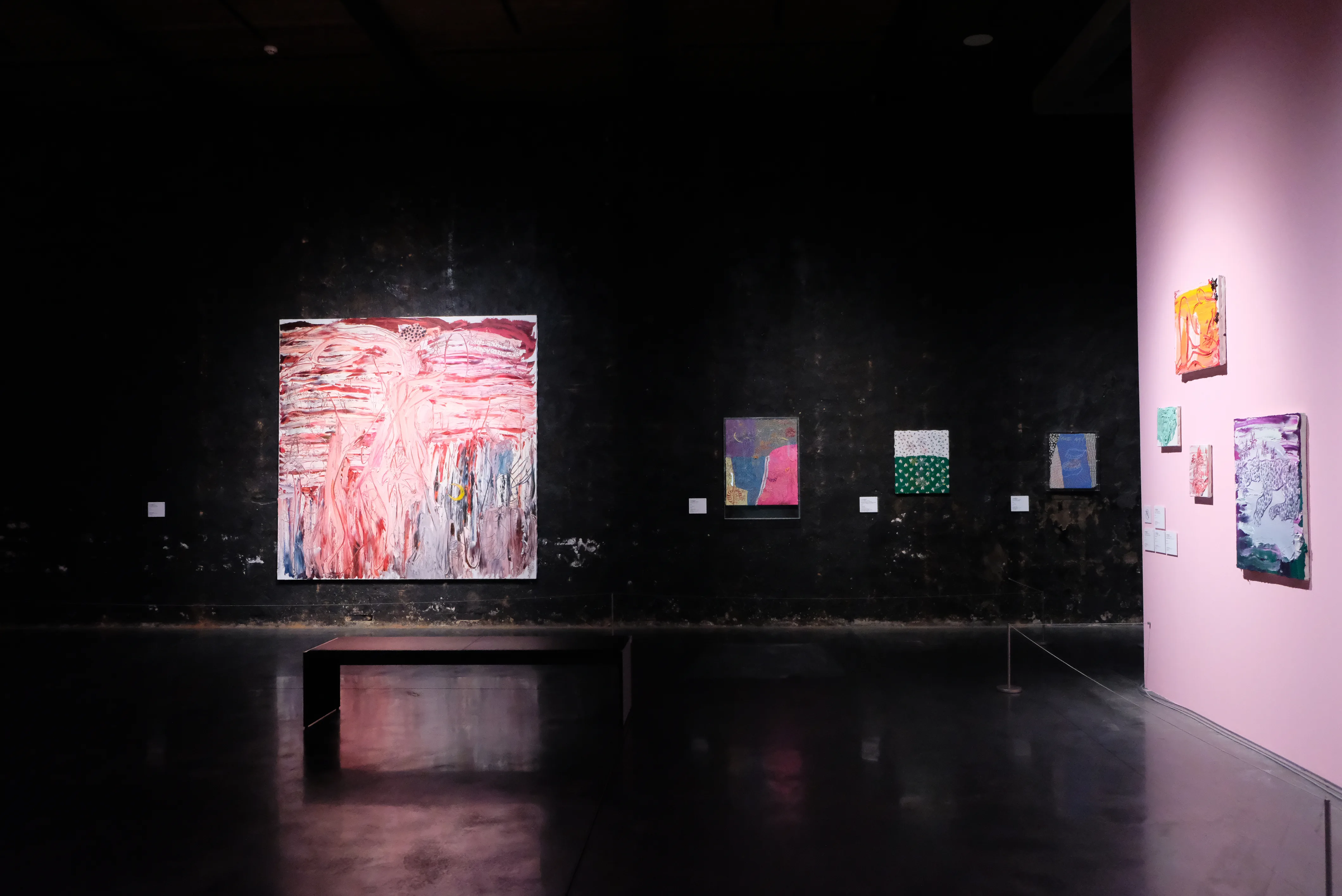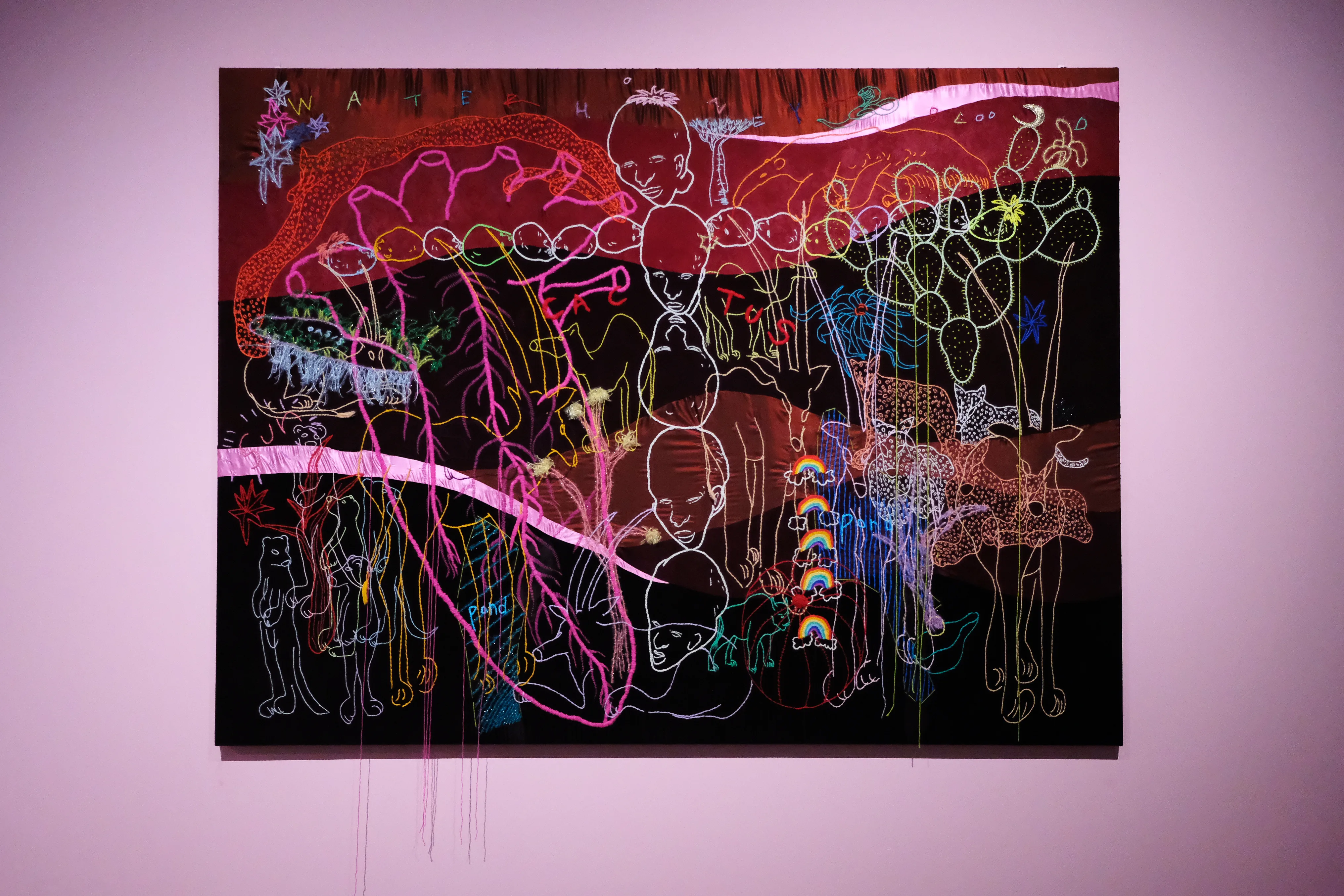 食への関心や違和感を起点として、身体をテーマにした作品の制作で知られる川内理香子は、同館では初めての展示となる。川内は数多くのペインティングのほか、近年積極的に取り組んでいる刺繍を使った大型の新作を発表。力強い色と線をもって重層的な世界を作り出している。