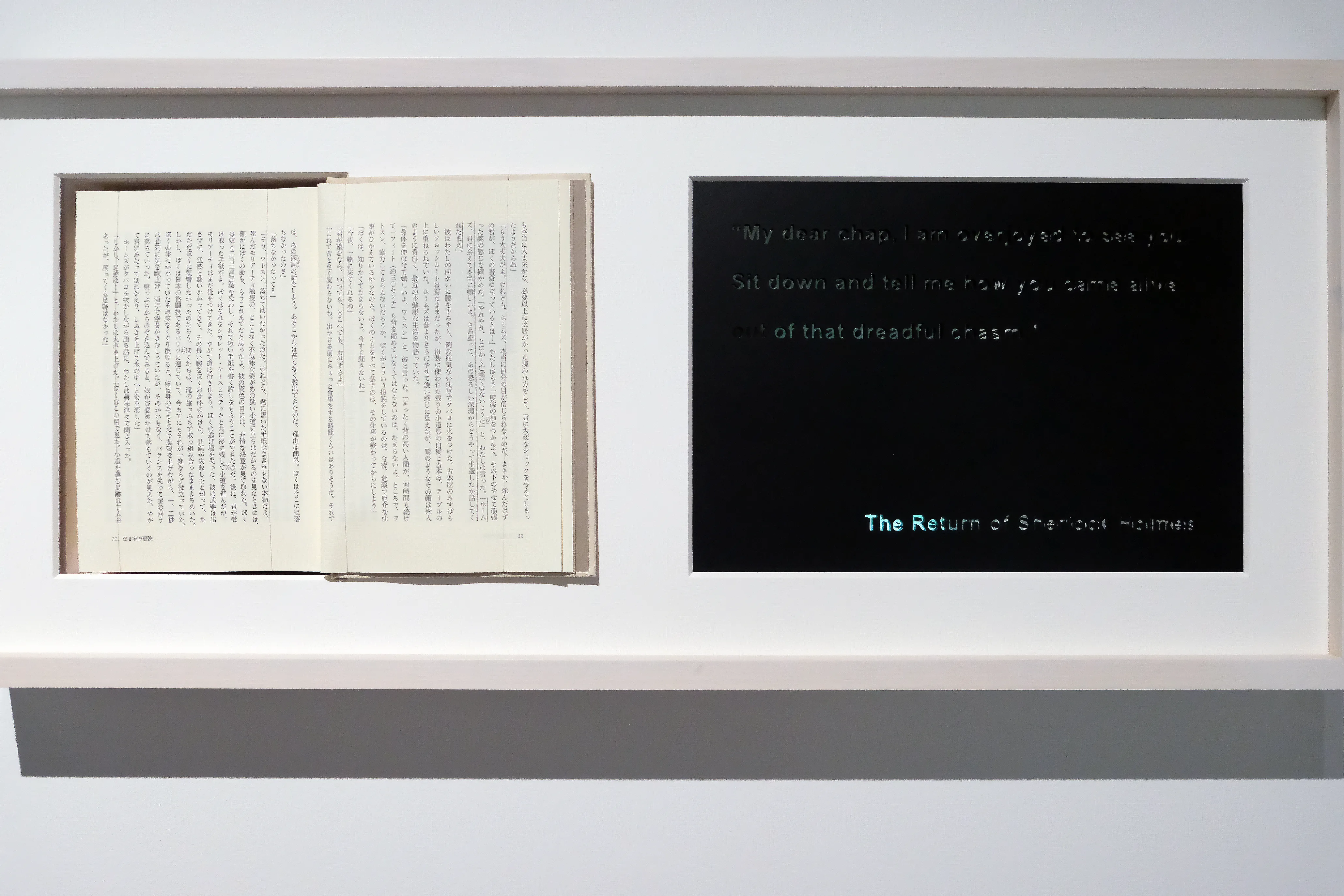 美術領域にとどまらず、小説やコミックなど他分野に渡り精力的に活動を行う小林エリカ《旅の終わりは恋するものの巡り逢い》は、弘前で軍医だった祖父と、同地で生まれ「シャーロック・ホームズ」シリーズの翻訳を手掛けた父、そして「シャーロック・ホームズ」の作家、コナン・ドイルの3人の人生が行き交う作品で、館内の複数の場所に展示されている。