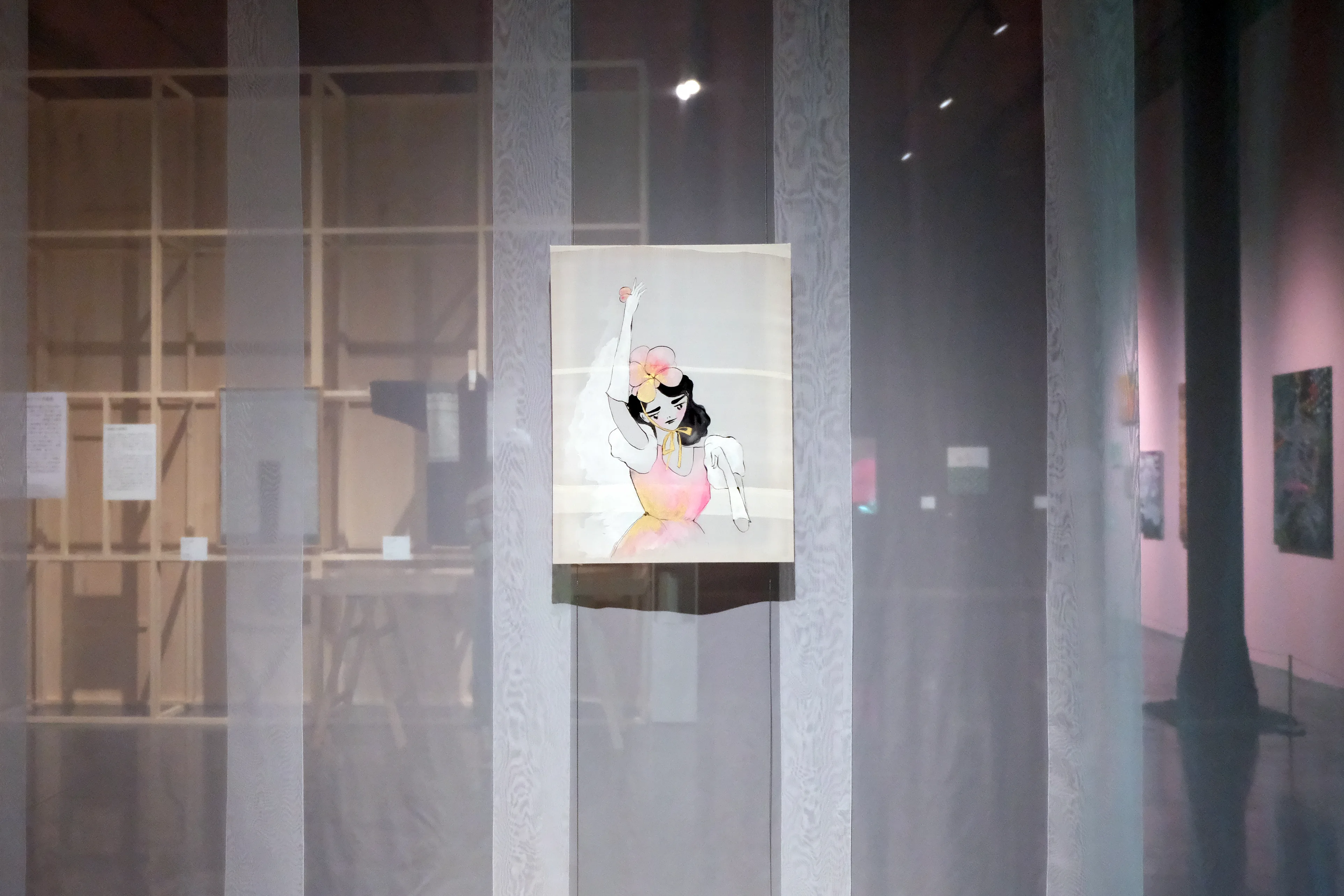 会場風景より、「JAIL HOUSE 33 1/3」内部から作品を見る。画面中央の作品は奈良美智《Girl from the North Country(study)[北国の女の子(習作)]》(2025)