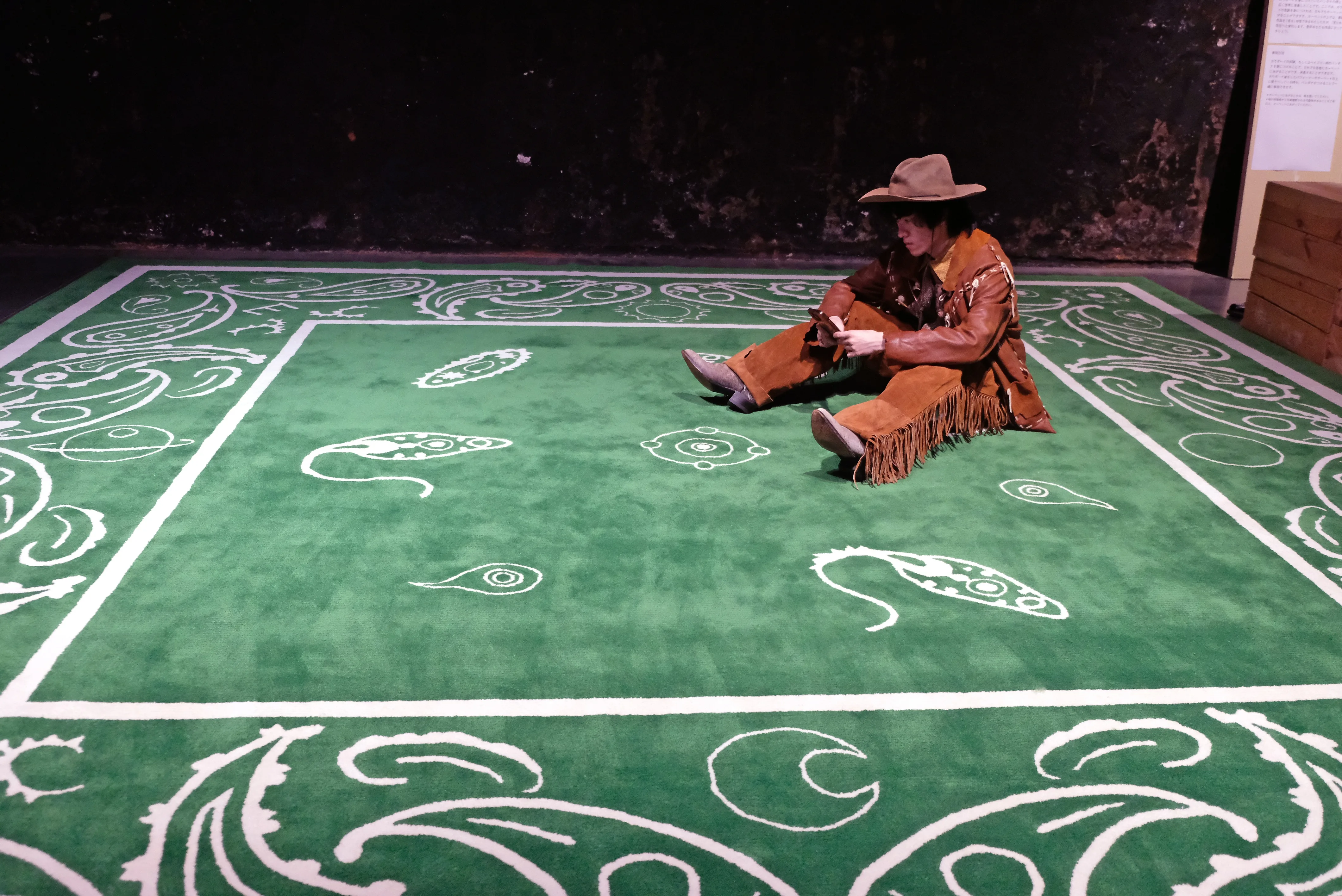 ユーイチロー・E・タムラの《草上の休息》は、19世紀にエドゥアール・マネが描いた《草上の昼食》を下敷きにした作品。ペイズリー柄の大きなカーペットの上にはカウボーイ姿のパフォーマーが座り込み、スマートフォンをいじったりするなど「休息」に耽っている。鑑賞者はカウボーイをただ見るだけではなく、カウボーイの衣装を身につけることによって、このカーペットの上で休息を取れる。ただ、カーペットの上に上がった瞬間に、鑑賞者は「見る」存在から「見られる」存在に変貌するのだ。