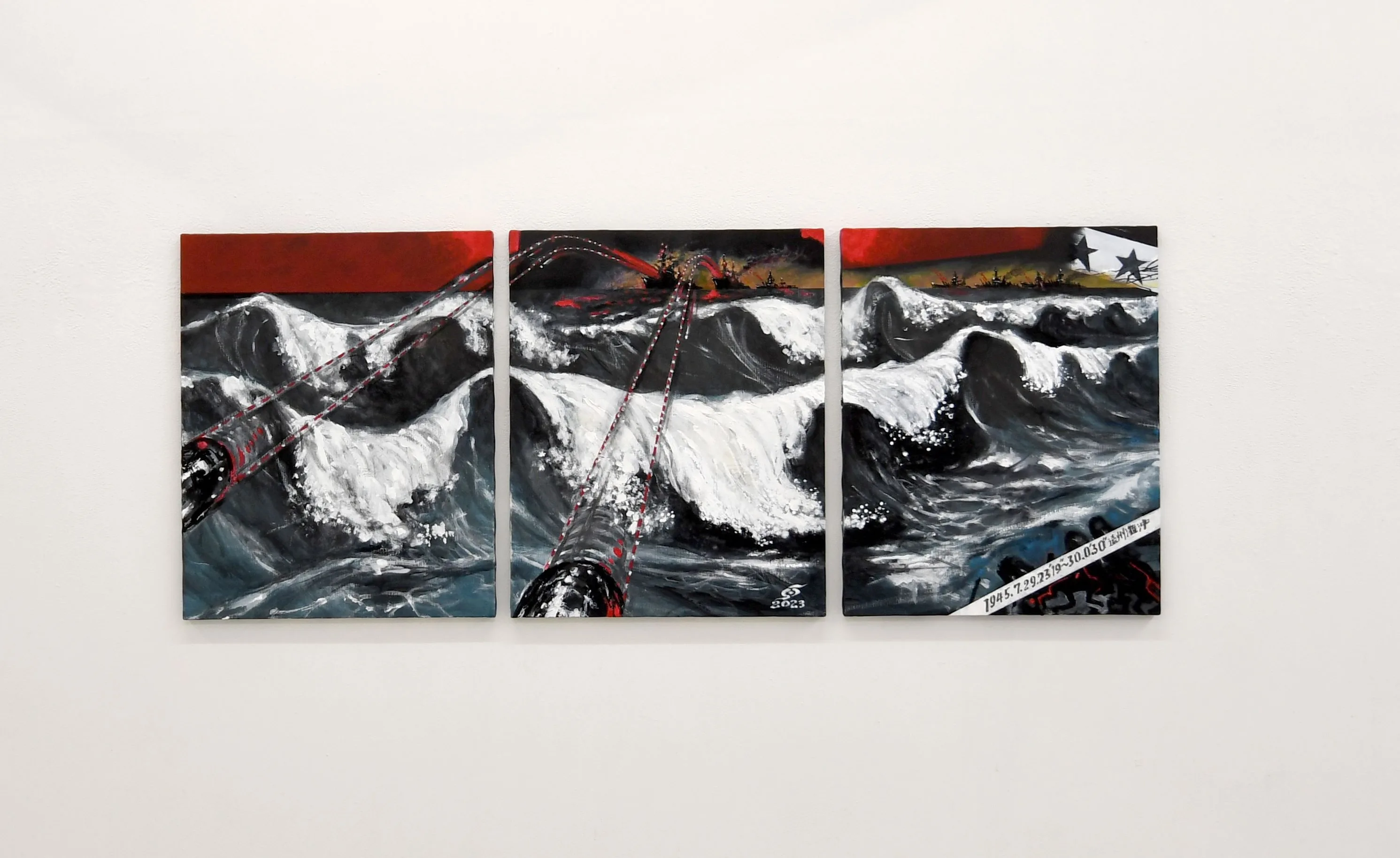 1945年7月29日夜、浜松に2千発の砲弾を撃ち込んだ艦砲射撃を題材にしたのが《艦砲射撃 1945》(2023)。同年6月18日の浜松大空襲により大部分が焼けた市街地は、艦砲射撃で壊滅的ダメージを受けた。その仄光を疎開先で見た中村は、校長を務める女学校を守って市内に残った父の死を覚悟したという。