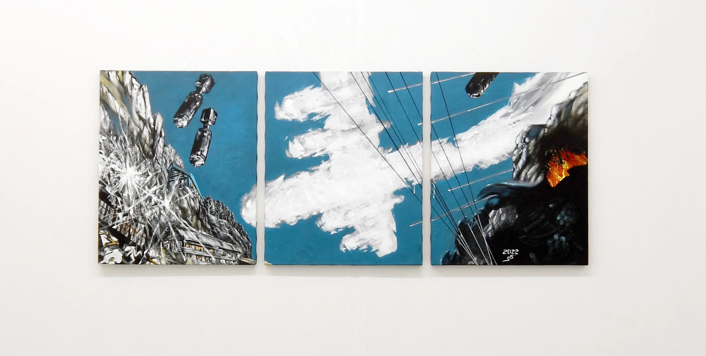 中村の作品《空襲 1945》は、青空を雲のような巨大なB29が横切る場面を下から見上げる構図で描く。焼夷弾は学校らしき建物に着弾する寸前で、画面右では炎が燃えている。記憶を頼りに自分が経験した戦争を描こうと決めた2022年に制作した。