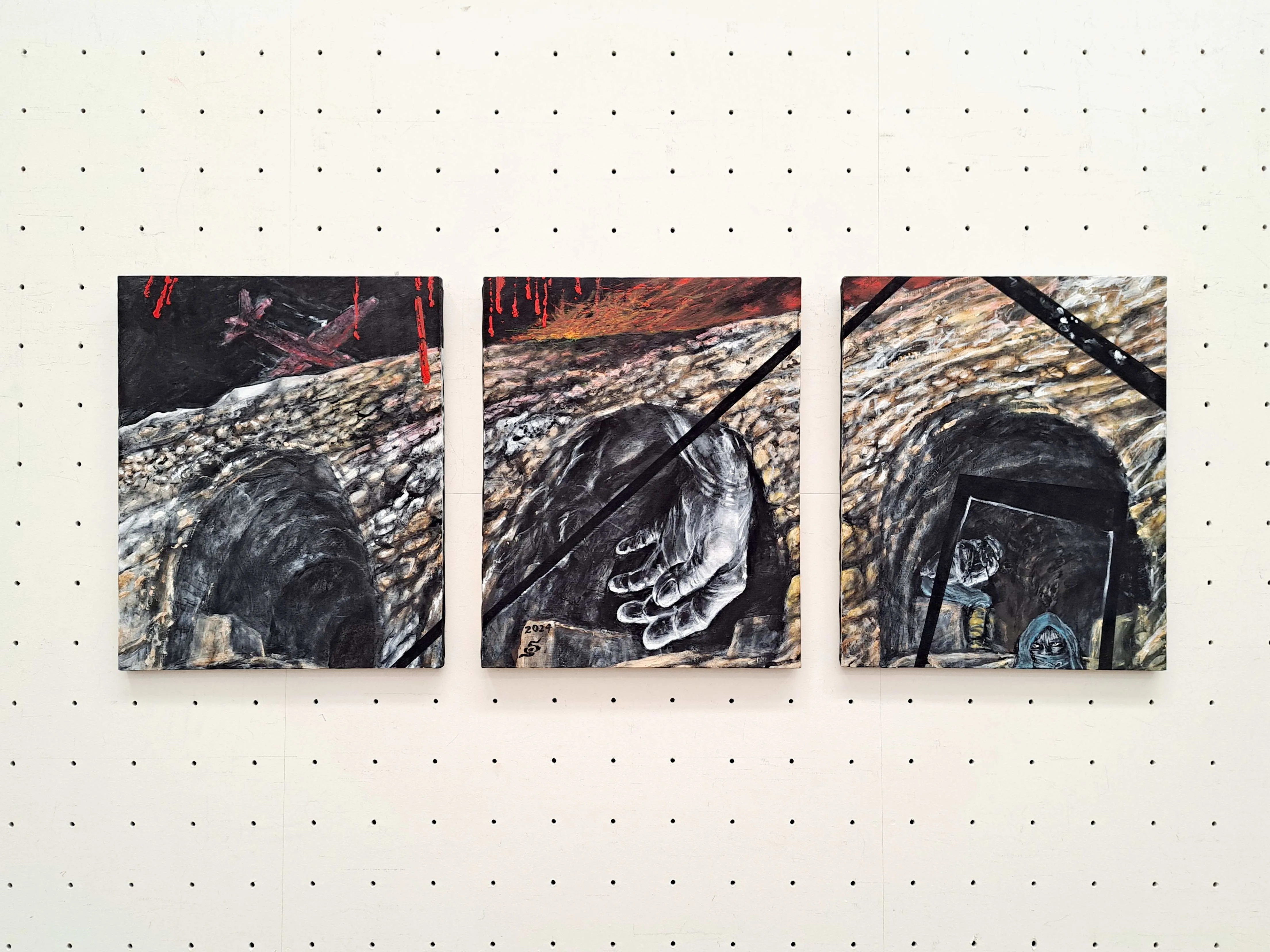 2024年に中村が制作した《防空壕 1945》は、3つの防空壕と中央の巨大な手が目を引き、片端に防空頭巾をかぶった子供の顔が見える。手は、《空襲 1945》の画面右下にも登場させたモチーフだ。中村ら子供たちは、防空壕の中では爆風から身を守るために体を丸めて両手で頭を抱える姿勢を教え込まれていた。