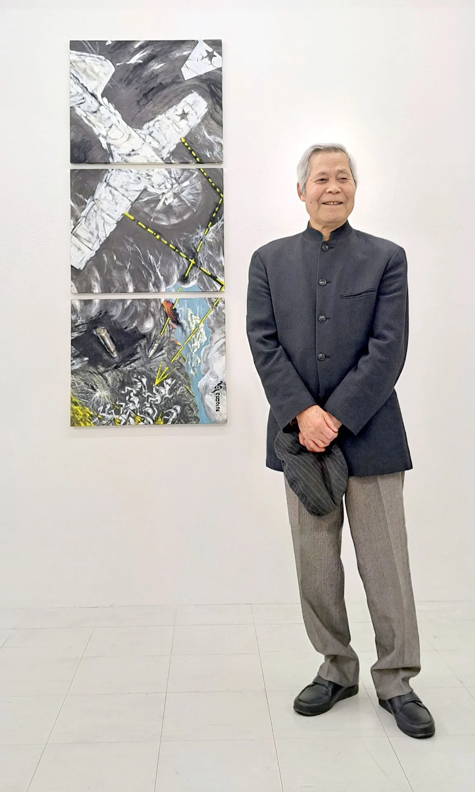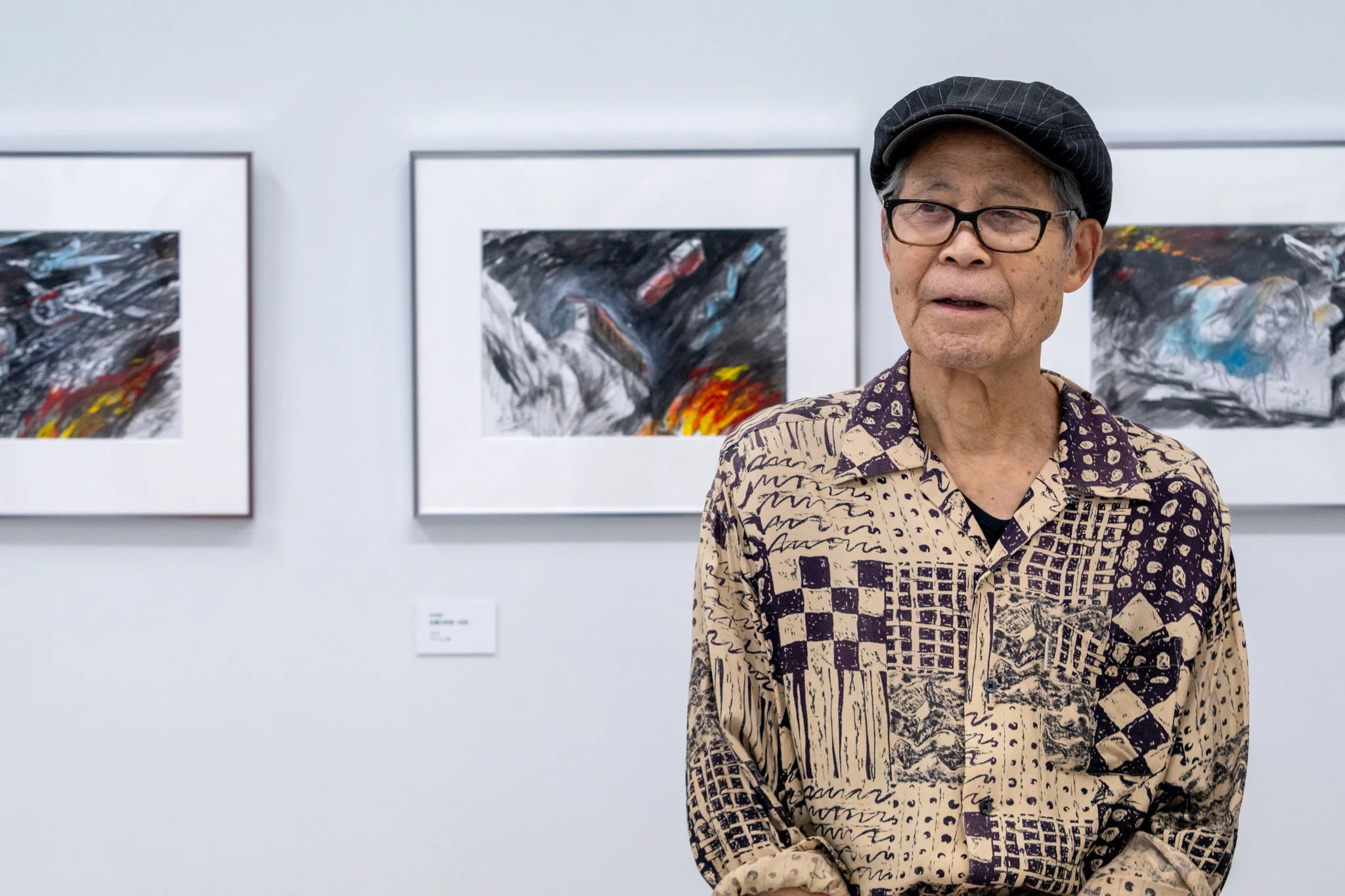 画家の中村宏、ギャラリー58「戦後80年 1945年の記憶」展の会場にて 撮影:編集部・灰咲光那