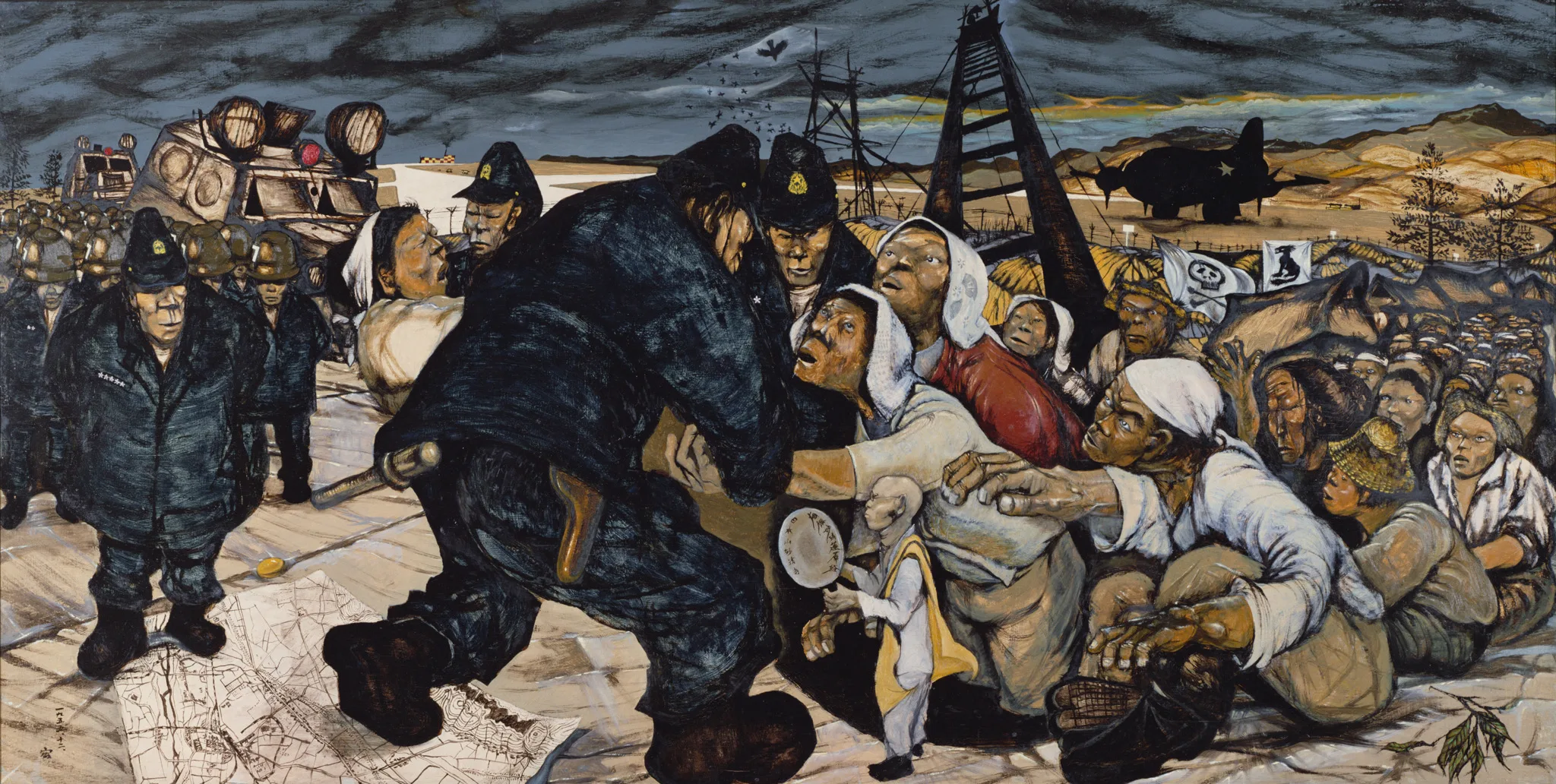 中村は1932年静岡県生まれ、日本大学芸術学部在学中の1953年から本格的に絵画制作を始め、政治・社会的事件を取材し記録する「ルポルタージュ絵画」で注目された。エイゼンシュタインのモンタージュ論を絵画に適用し、60年代以降は「観念絵画」「観光芸術」「タブロオ機械」など独自の方法論に基づく制作を展開。鑑賞者の自由な解釈を可能にする、飛行機や機関車、セーラー服の女子学生といった記号的モチーフを用いた作品でも知られるが、これまで戦争体験を直接表現したことはなかった。
