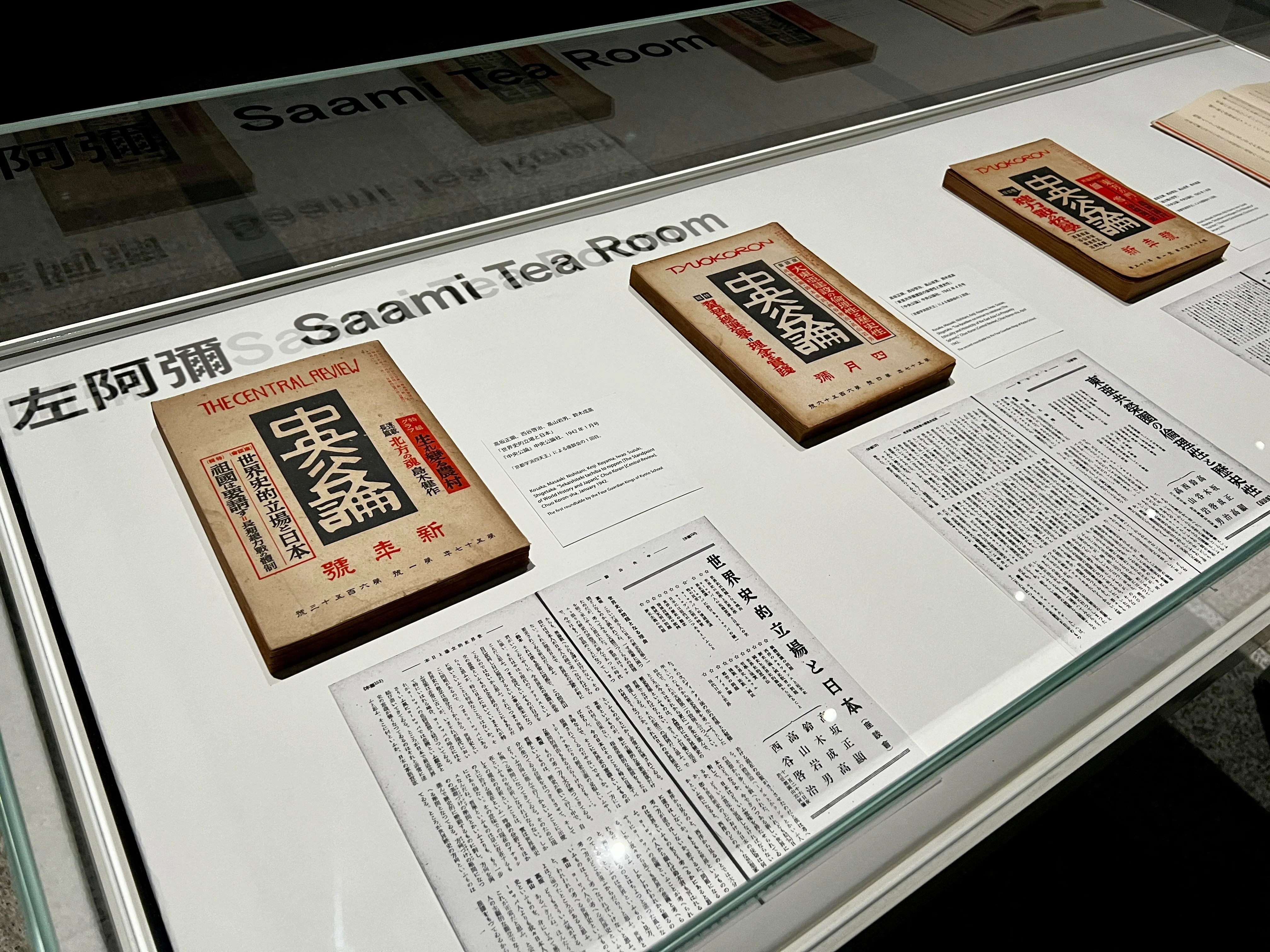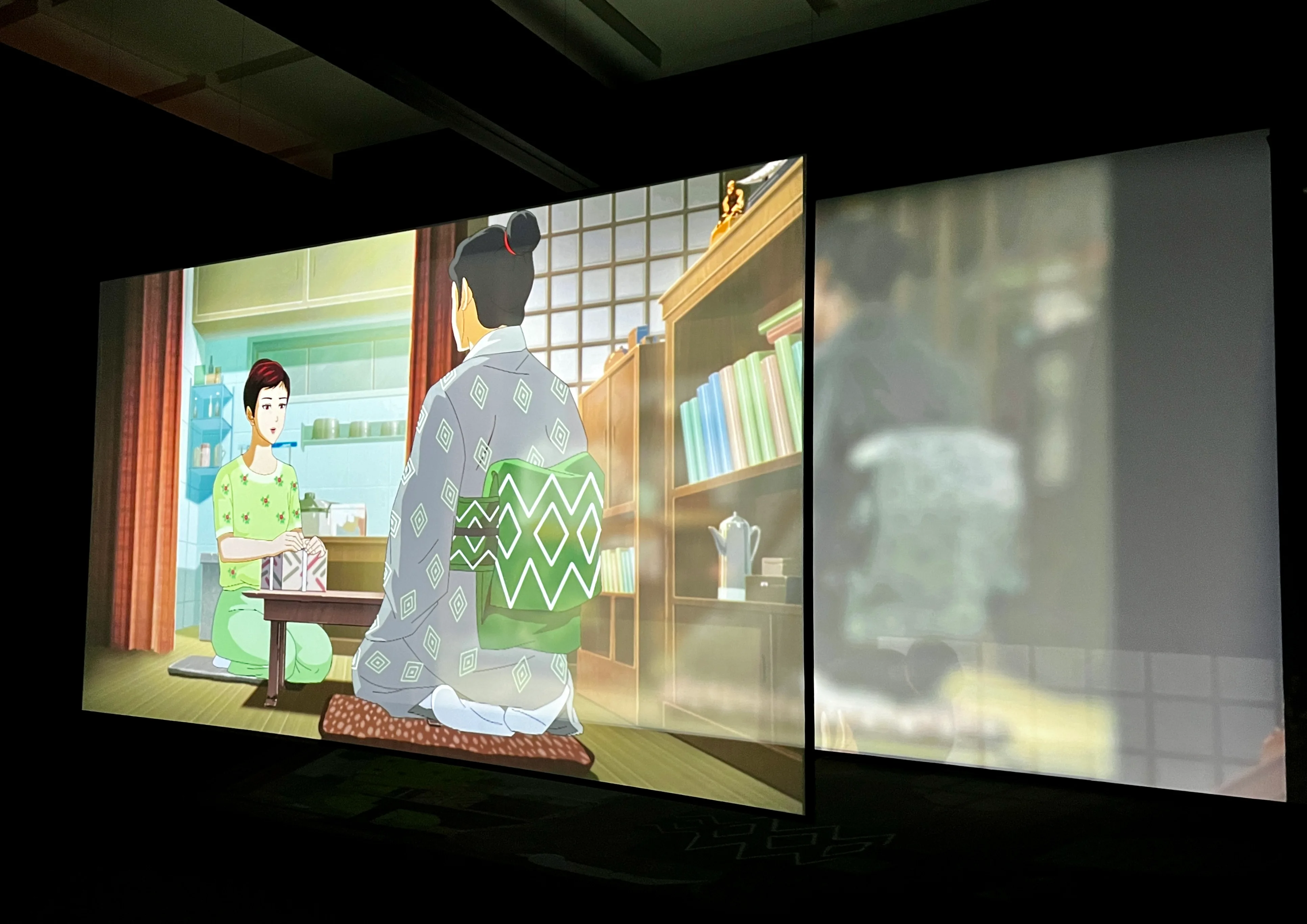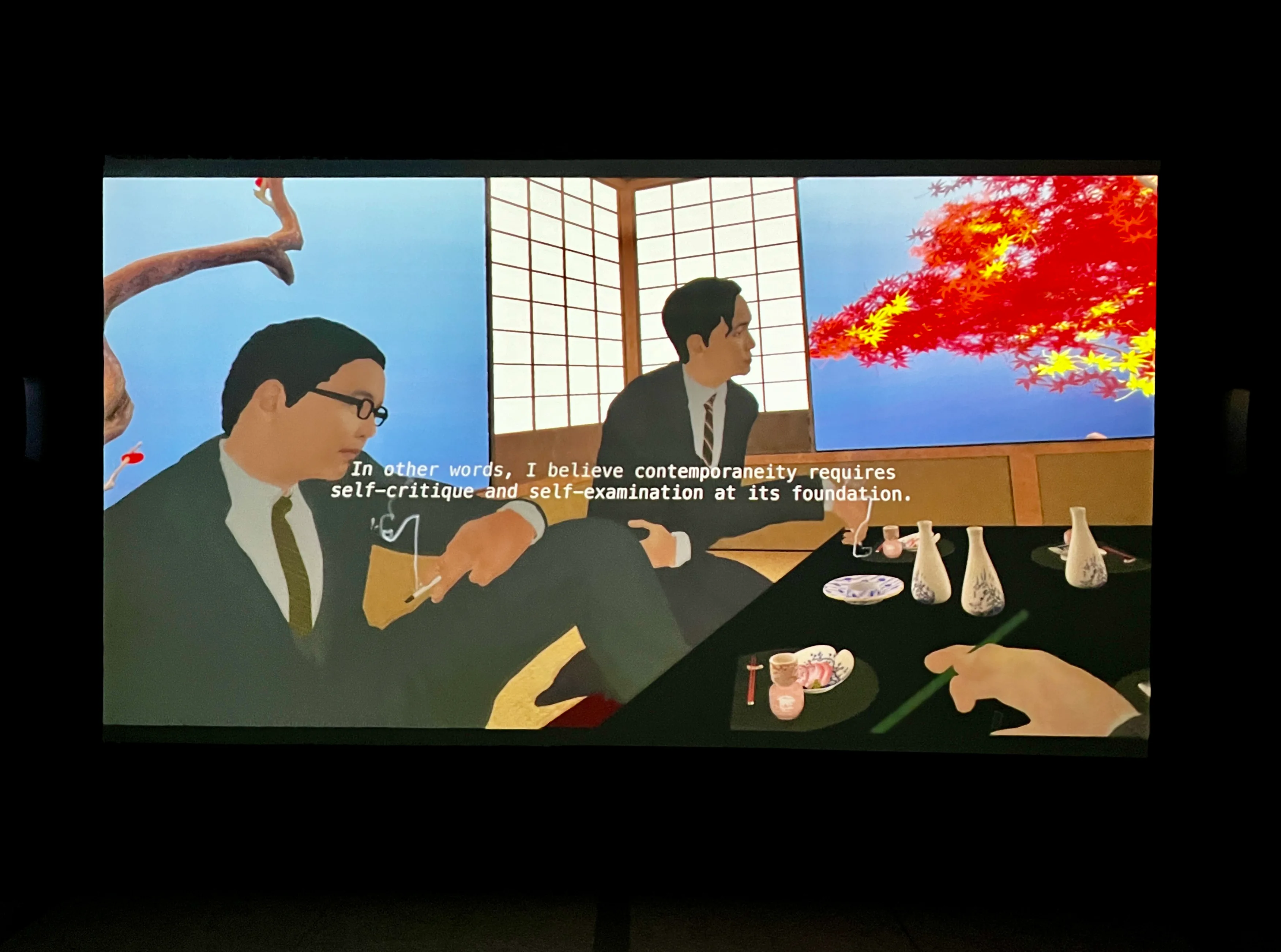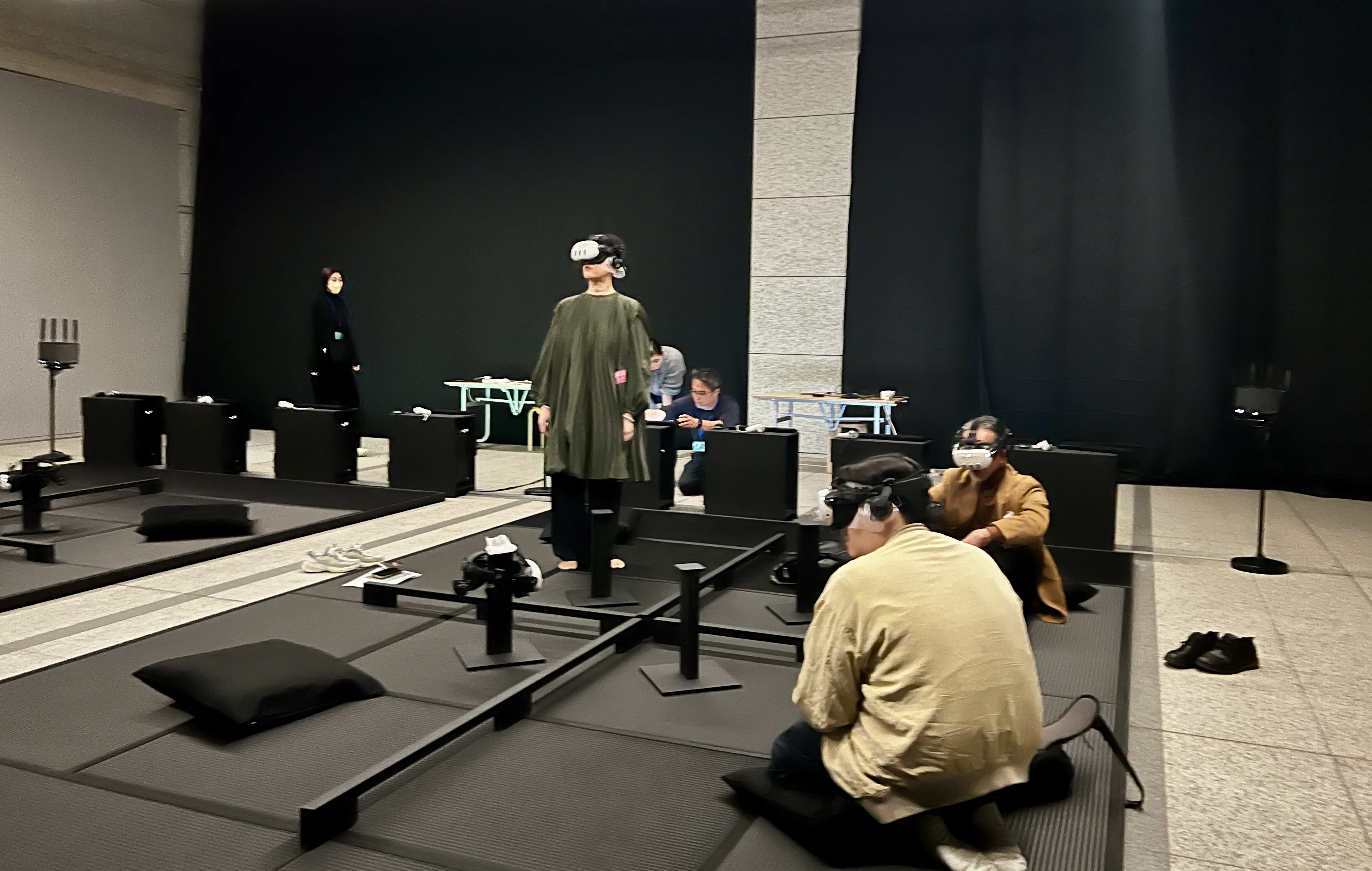 《ヴォイス・オブ・ヴォイド—虚無の声》は本展の後半に登場。VRを用いた作品で、鑑賞者はヘッドセットをつけて、座る・寝転ぶ・立つという動作を行うことでいくつかの仮想世界を行き来する。中心となる舞台は、「京都学派四天王」と呼ばれた西谷啓治、高坂正顕、高山岩男、鈴木成高が、真珠湾攻撃の直前の1941年に語り合った座談会「世界史的立場と日本」の現場だ。鑑賞者は速記者の立場に身を置き、議論を交わす4者と「左阿彌の茶室」で同席する。
