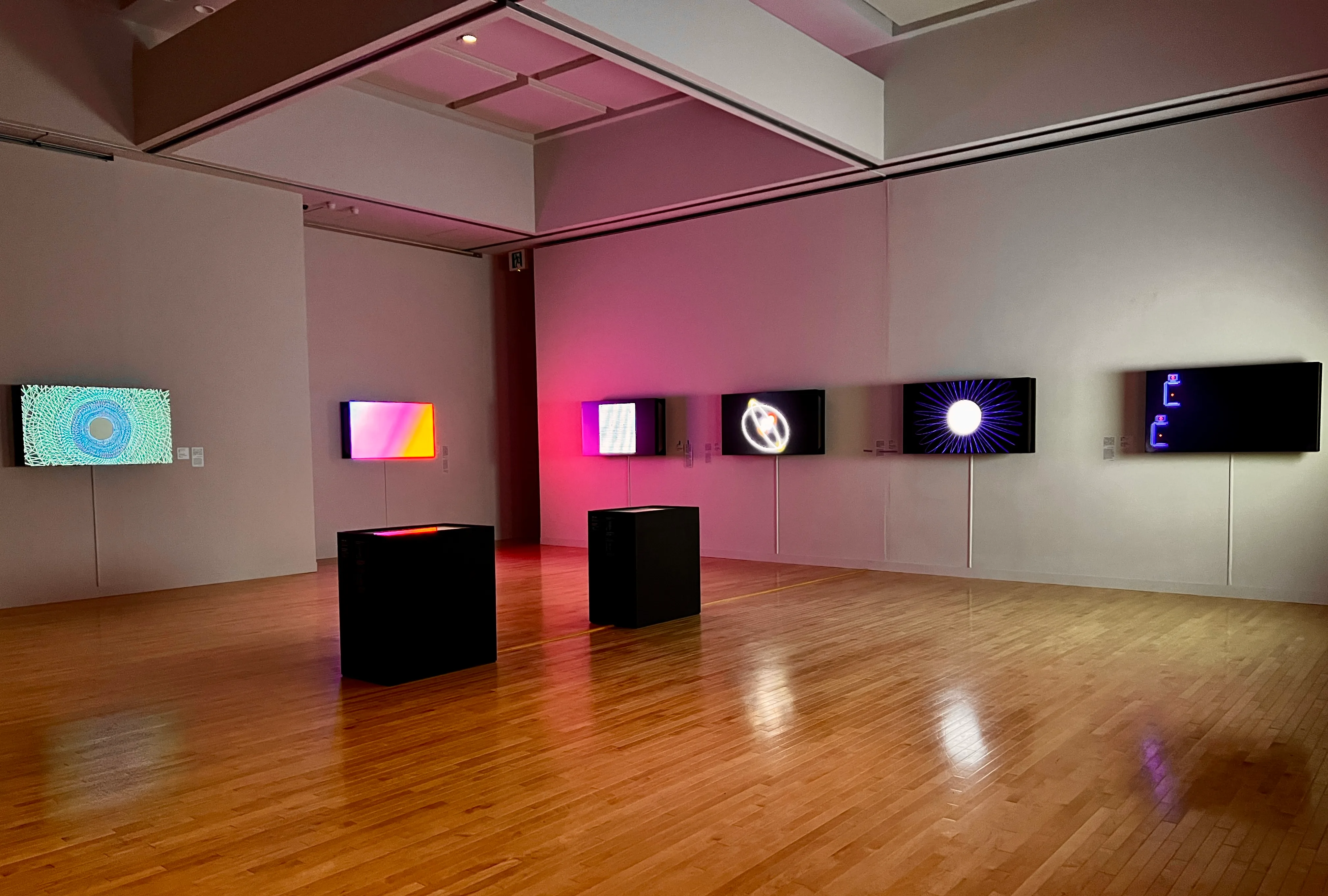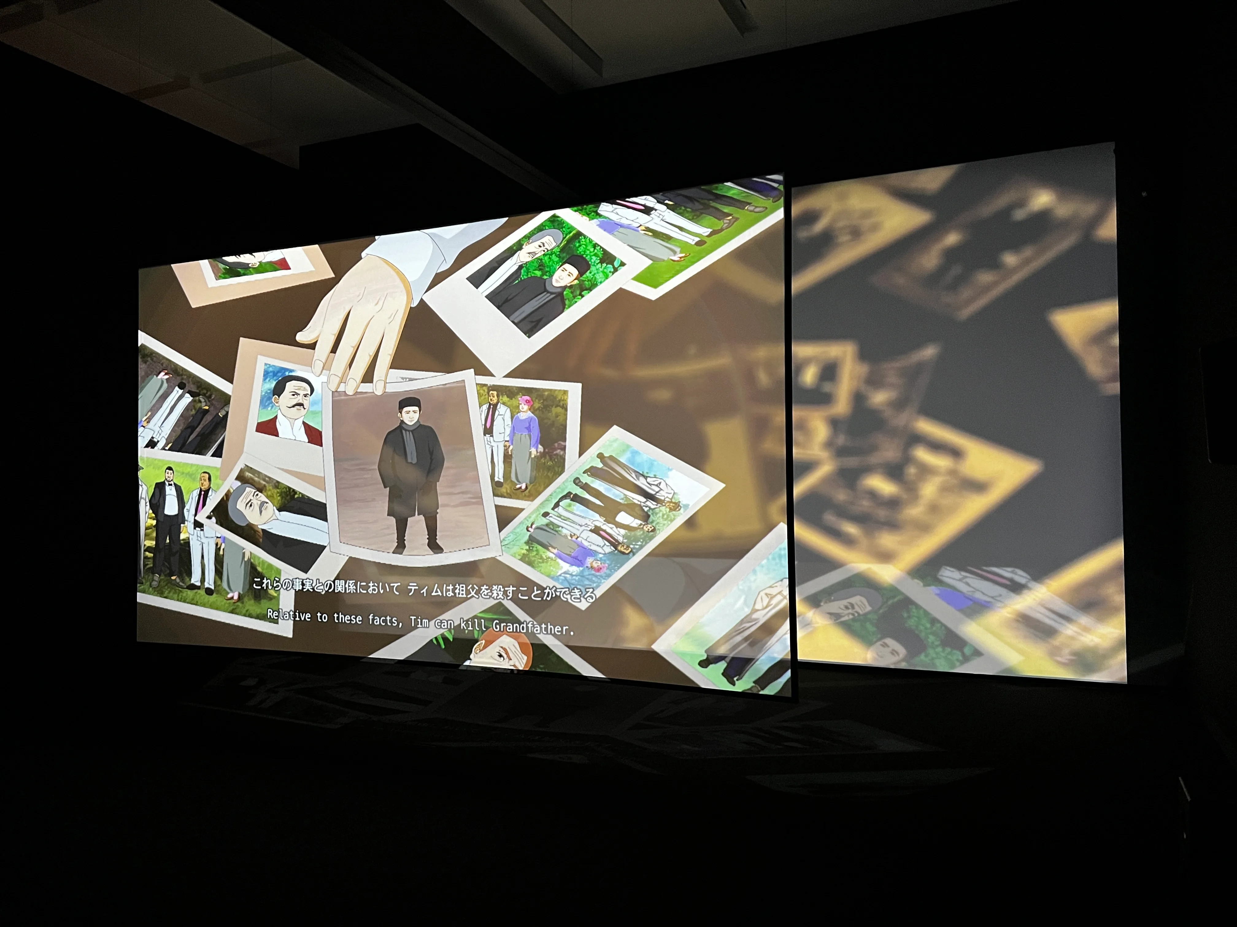 奥には作家が発掘した過去の様々な場面や映画など素材となる映像が映され、手前にはその引用元をアニメーション化したものが投影される。多様なイメージや物語の断片が、アルゴリズムによって次々と現れる。そこには素粒子から、地球上の生命の寿命、そして宇宙へと至る様々なレベルの時間が示唆されており、時間や経験に関する問いを投げかける。