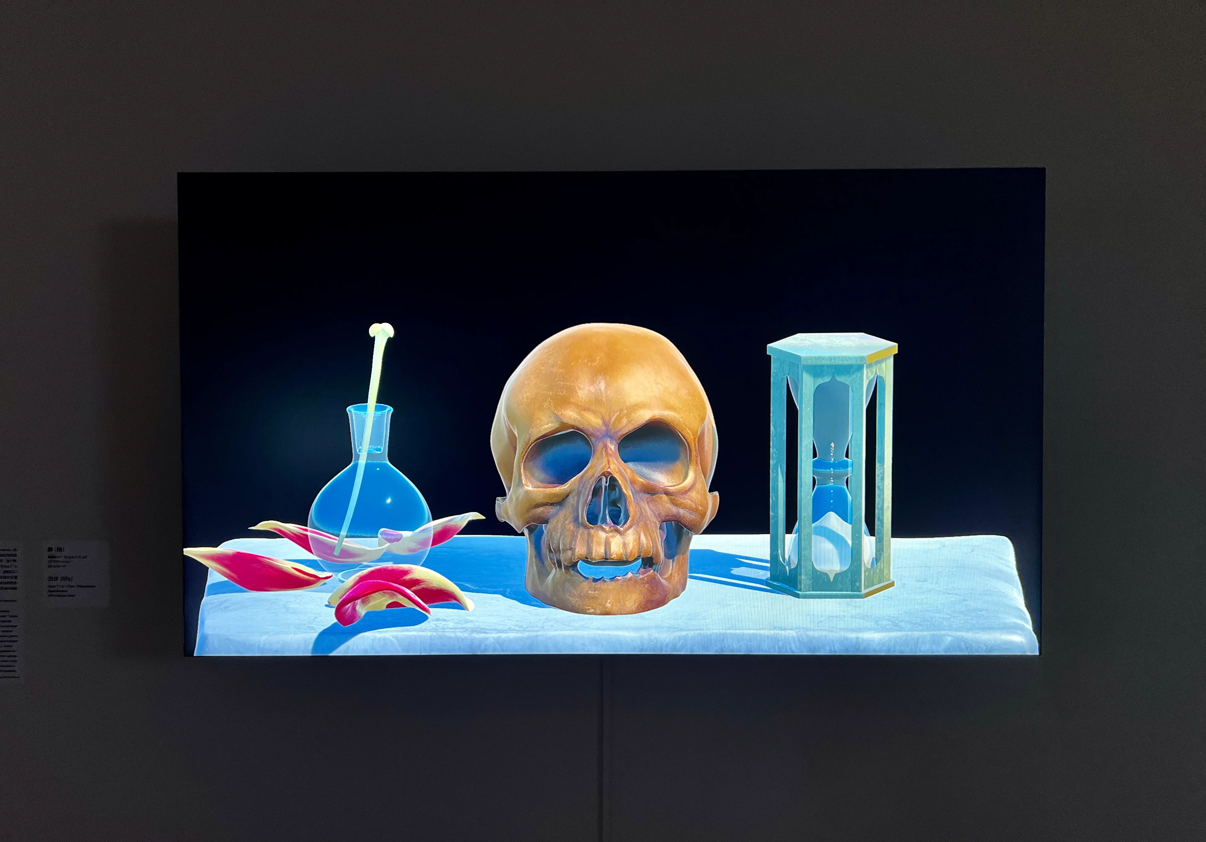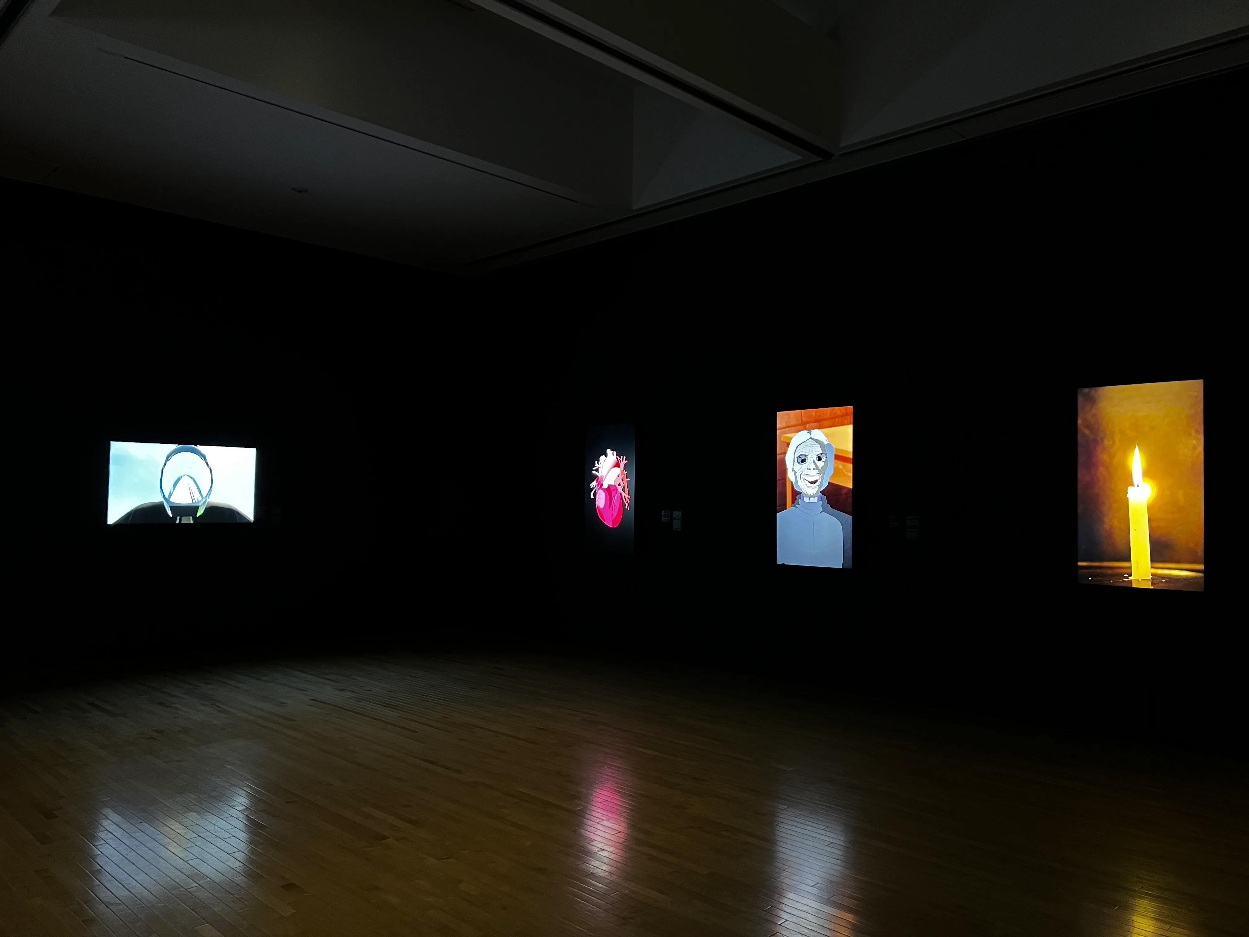 もうひとつ時間を扱うもので、《時間(タイム)のT:タイムピース》(2023)という42点の映像からなる作品群がある。映像は時計や、バイクのヘルメットに映る景色の変化、成長しては枯れるひまわりなど、いずれも様々な尺度の時間を感じさせるものだ。光子や惑星のような科学的なイメージもあれば、蝋燭の火やヴァニタス(生のはかなさ、現世の虚しさ)を表現する静物画など、美術史的なイメージも登場し、各映像はそれぞれの長さでループしている。