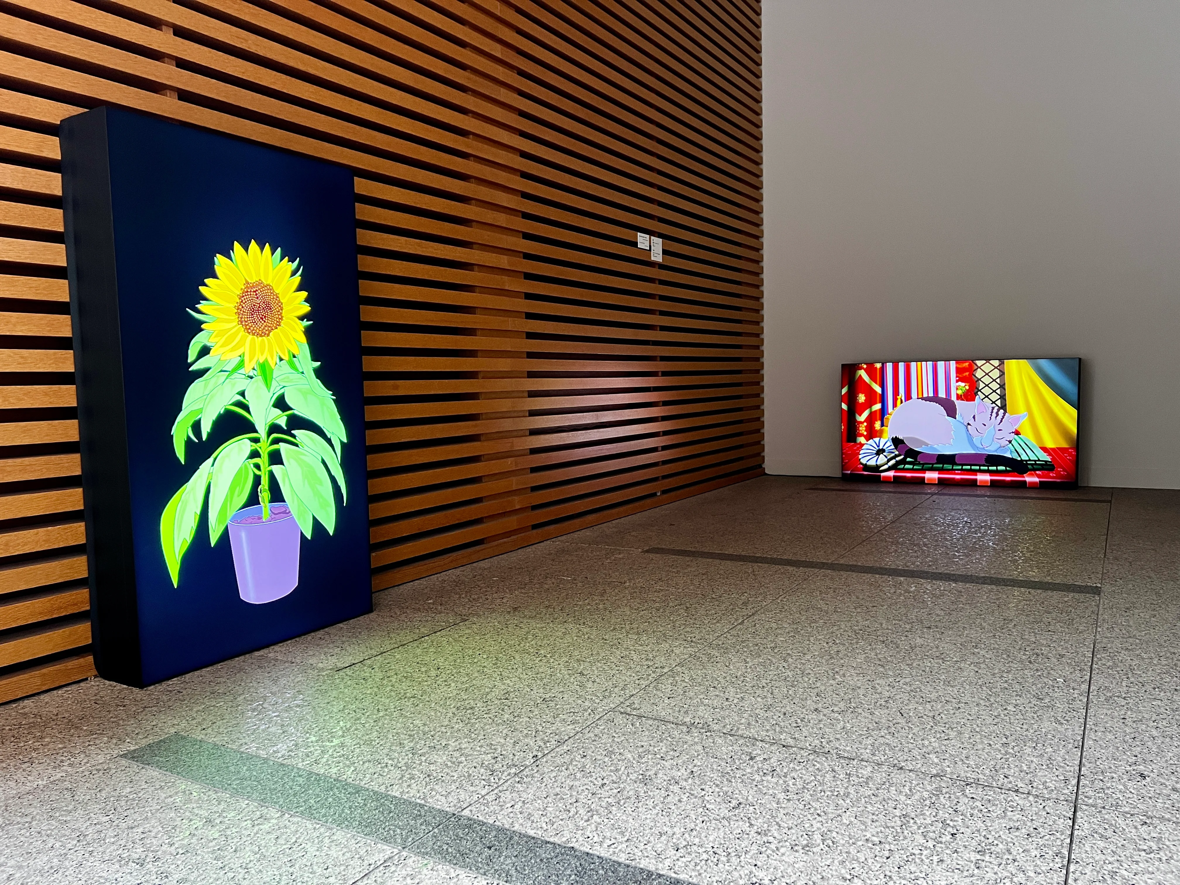 「時間というテーマは、作品だけでなく展覧会の構造そのものにも大きく関わっています。美術展ではひとつのところにひとつの作品があるのが常識ですが、今回は実験として、とどまるものがなくつねに変化している展示室にしました。時間によって見られるものが違う構成になっています。シンガポールの店舗では『BUY 1 GET 1 FREE』(1つ買えばもう1つは無料)というシステムがありますが、そんな感じで見てもらえればいいんじゃないか、もしくはバーのハッピーアワーみたいな感じで見てもらえたらいいんじゃないか、と思っています。