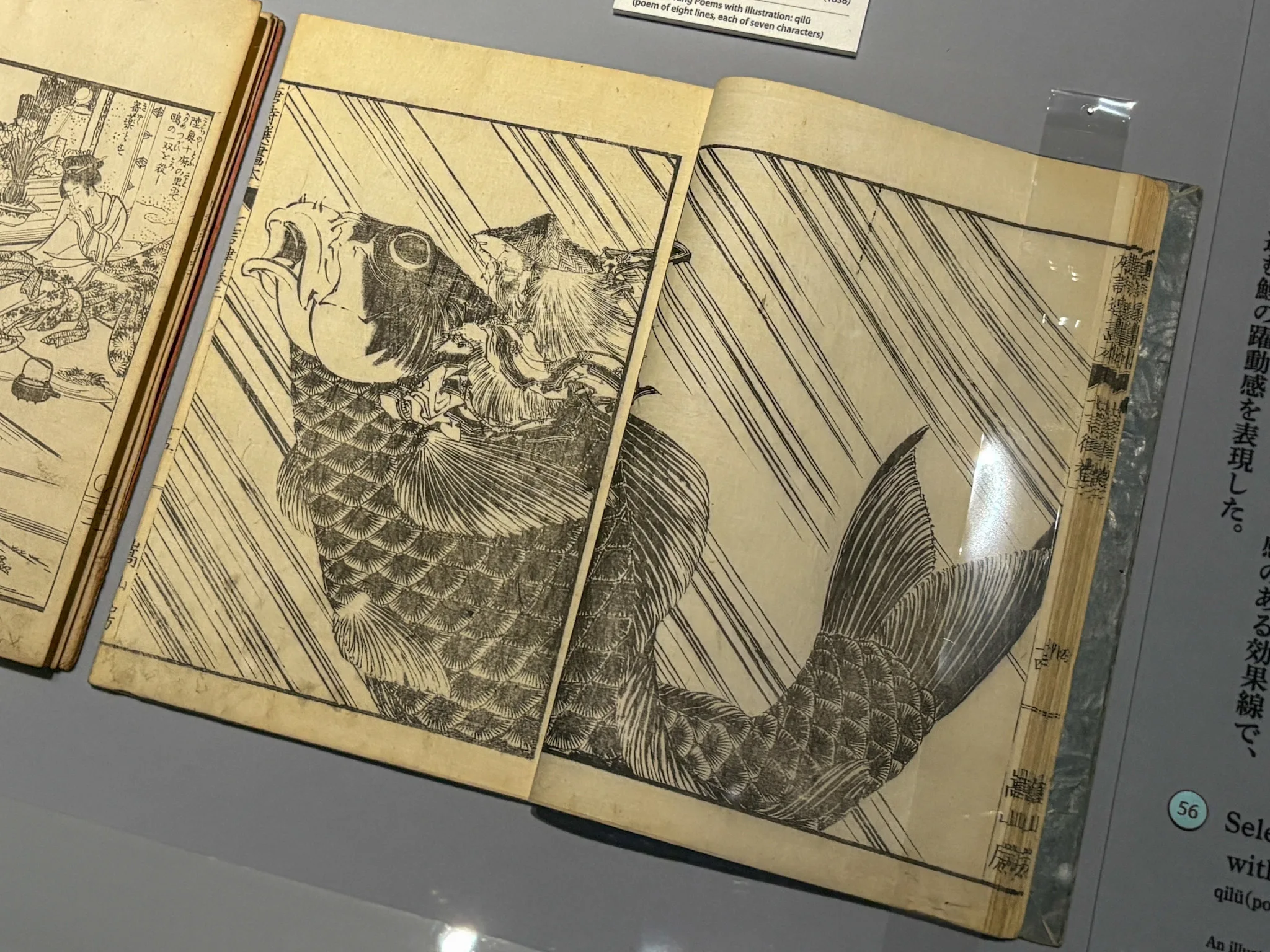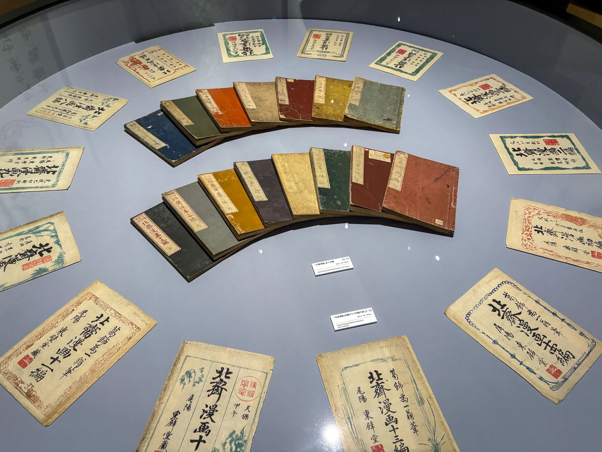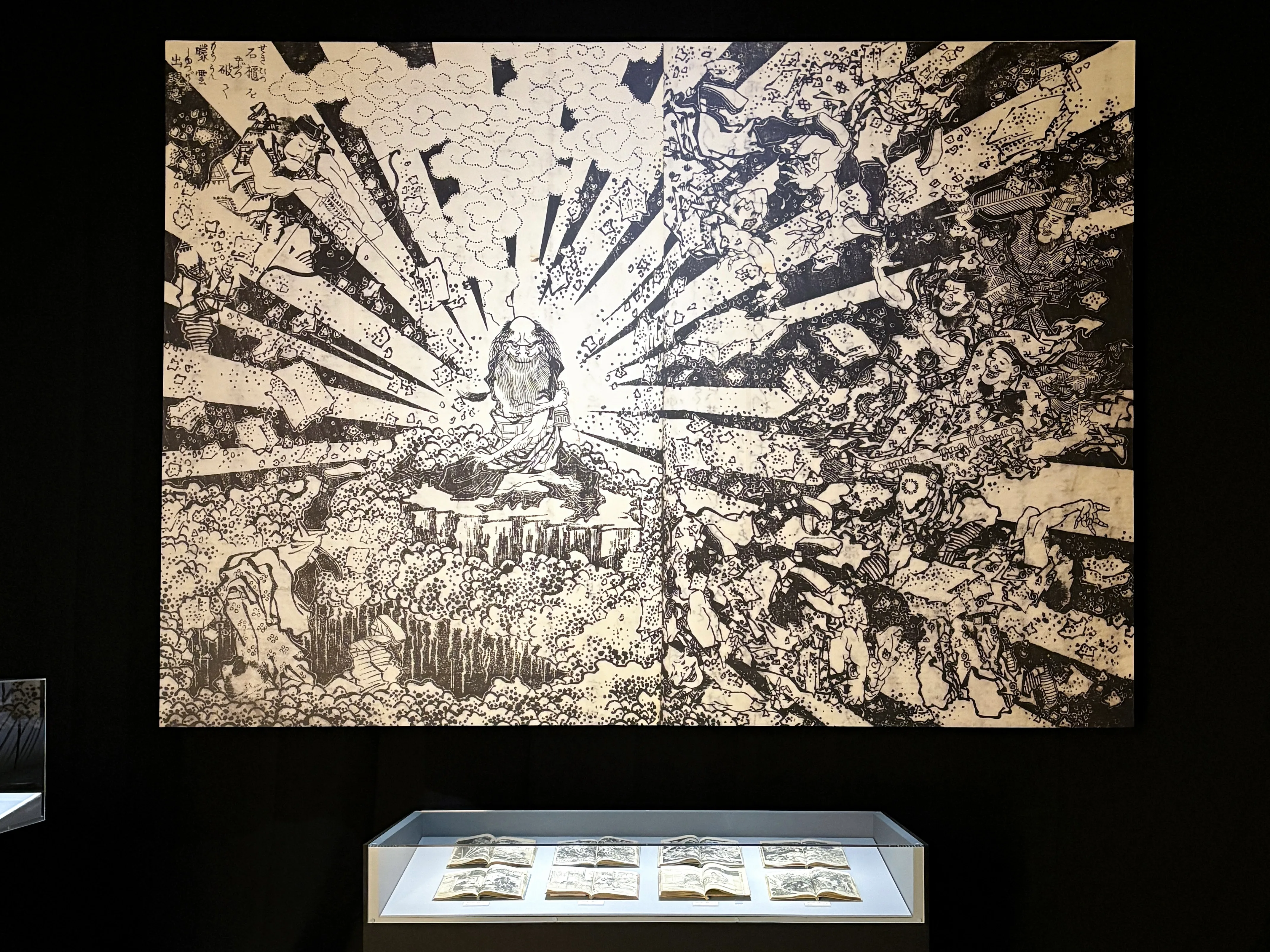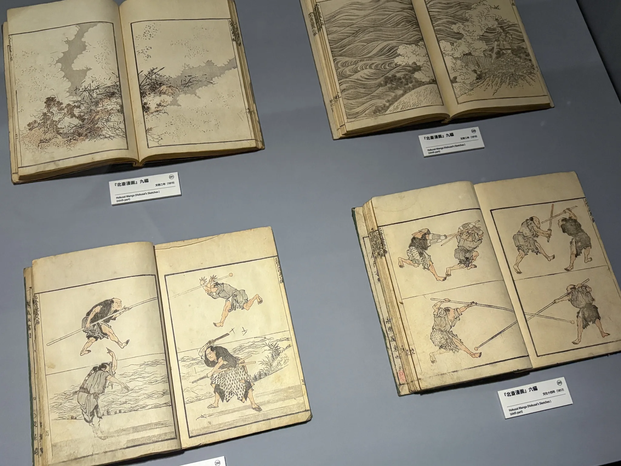 こちらは、作家が64年もの歳月をかけて完成させたライフワーク、『北斎漫画』の全15編が並ぶ展示室。「大波」に象徴されるダイナミックな構図と超絶技巧の描写はもちろんだが、ユーモアや遊び心あふれる人物画や、怪奇・妖怪の表現、精巧な博物誌など、作家の創造力の豊かさを感じられるフロアだ。