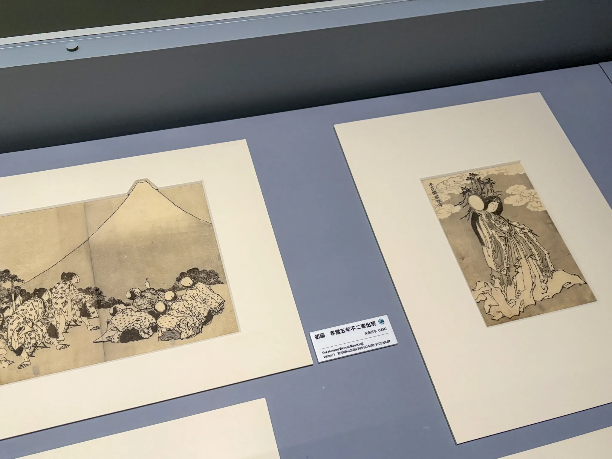 展覧会を締めくくる『富嶽百景』は、単色の薄墨摺(うすずみずり:墨を淡く摺り重ねて陰影や奥行きを表現する技法)の絵本。富士山を様々な角度から色鮮やかに描き分けた『富嶽三十六景』に対して、富士信仰や人びとの暮らしなどの要素を盛り込んだ作品となっている。