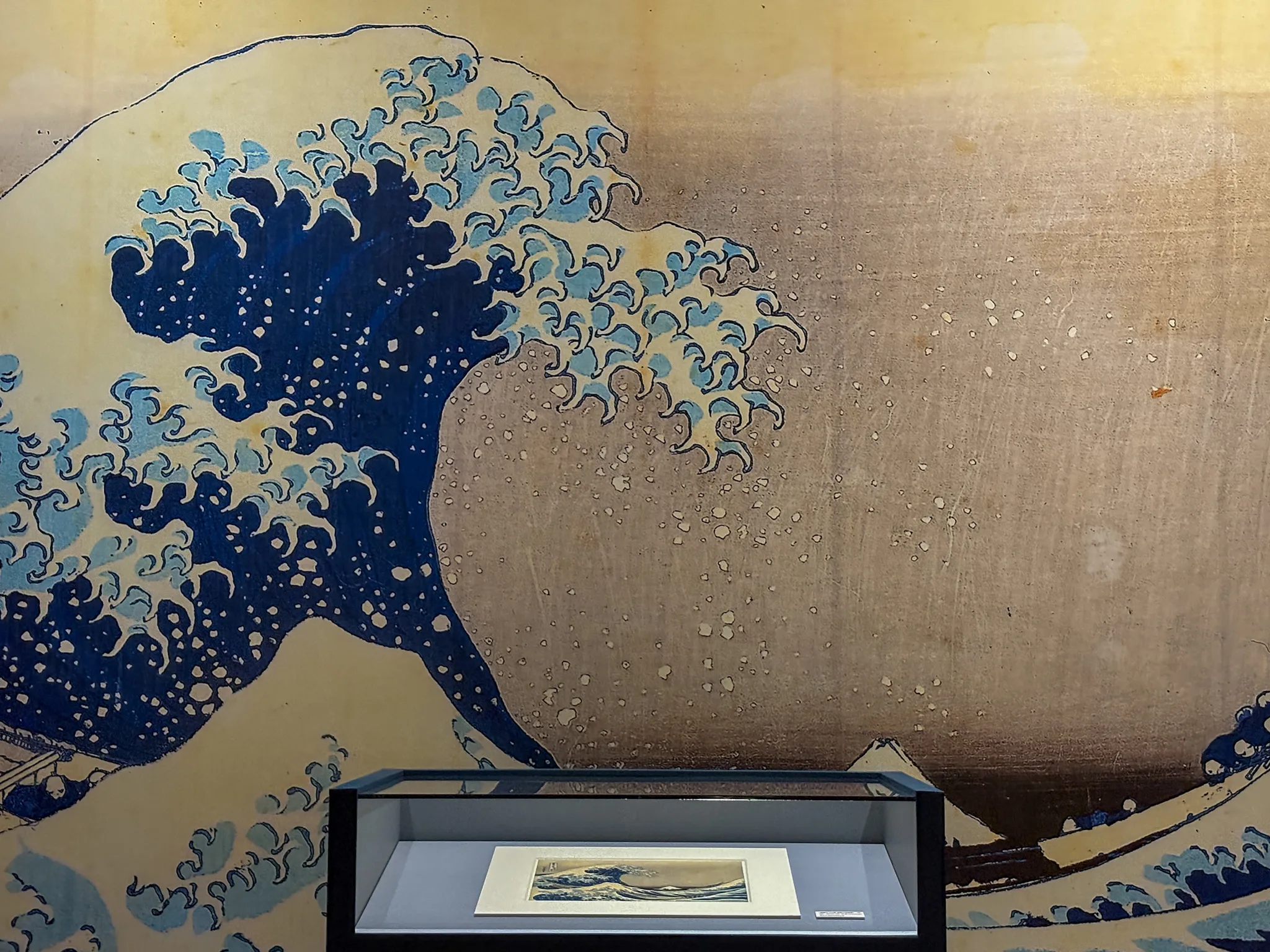 続けて展示されるのは、北斎の代表作《冨嶽三十六景 神奈川沖浪裏》(通称:大波)だ。こちらは『富嶽三十六景』の中でもっとも有名な作品だが、同フロアにはほかの「波」や「水」をテーマとした作品も並んでいた。