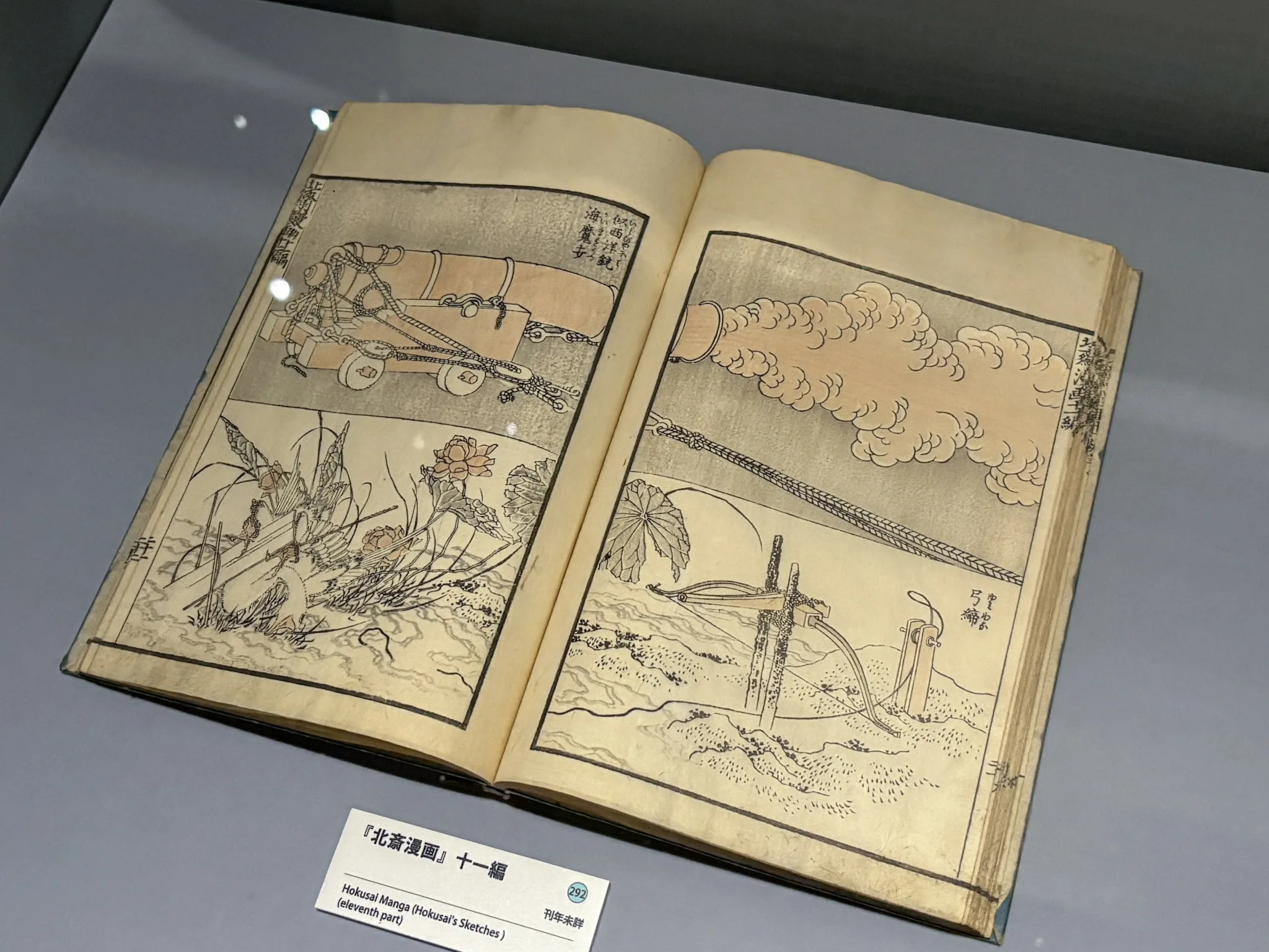 同作品の中には、マンガでいうコマ割りに類似した表現も見られる。『北斎漫画 11編』では大砲から煙を上げて飛び出した弾丸がページを飛び越えて海魔という海魚に命中するように描かれるなど、時間の経過が視覚的に表現されていた。