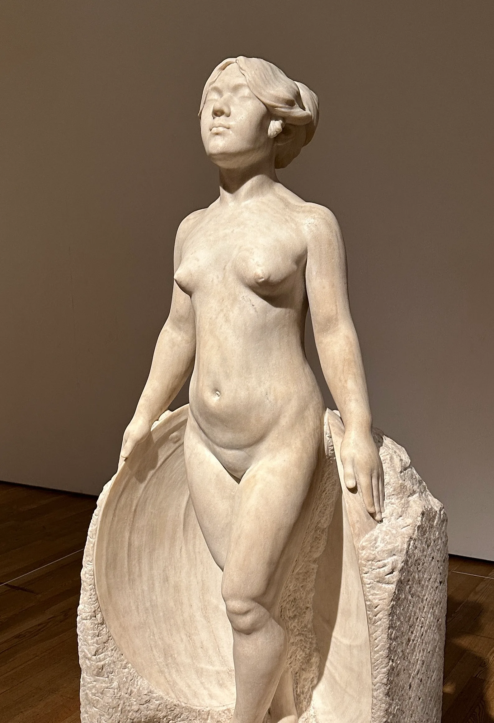 黄は1915年から1922年まで東京美術学校で高村光雲の教えを受けた後、1923年に東京にアトリエを構え、1930年に36歳で夭逝するまで制作活動を続けた。《甘露水》は西洋の彫刻技法を使って、気高く力強いアジア女性の体形と表情を再現しており、明治時代の文明開化で文化的価値観が揺れる20世紀初頭の時代のうねりが見て取れる。