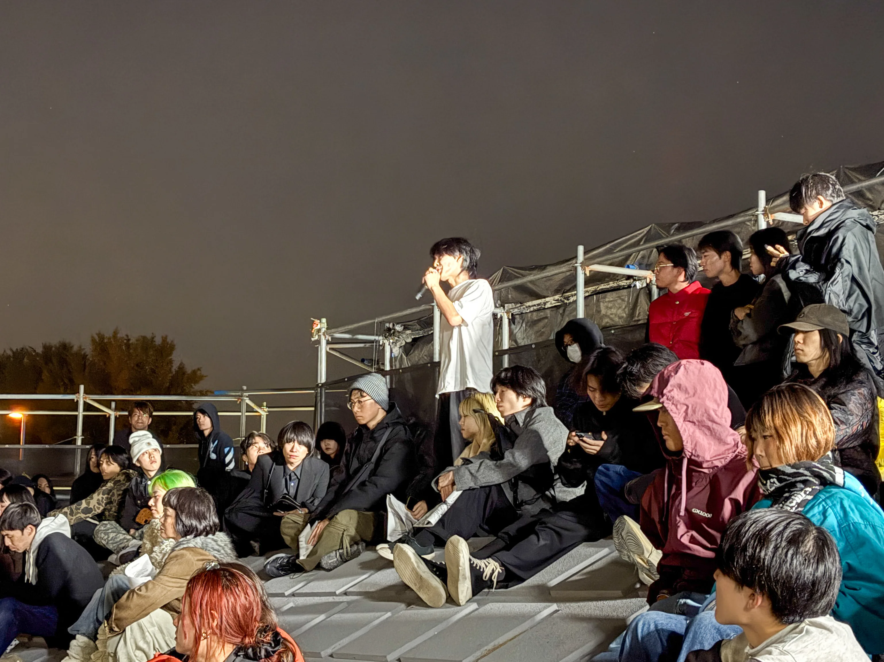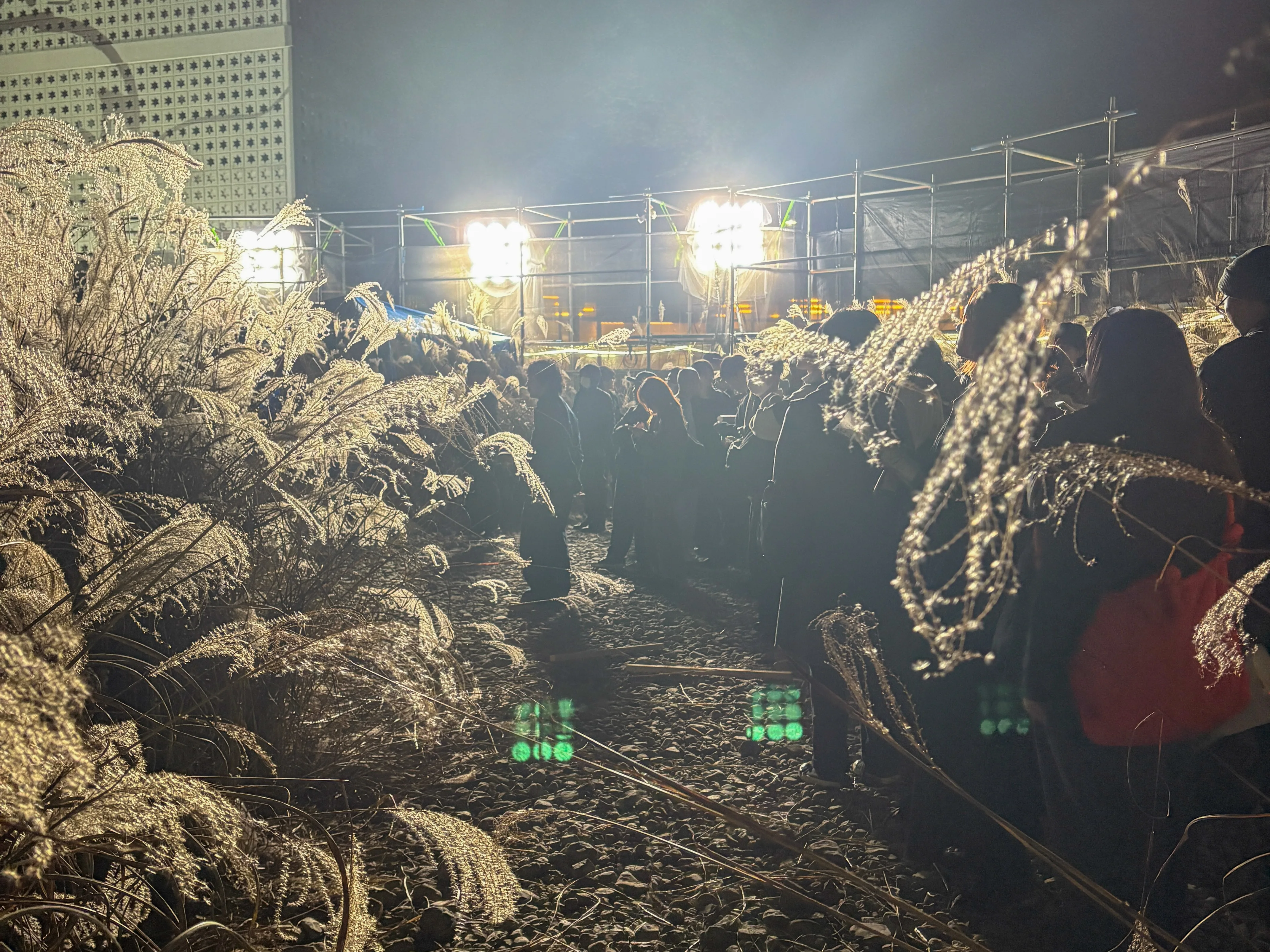 インスタレーションの中には、プロジェクトに初期から携わっている彫刻家、横手太紀や、クィア、非西洋中心主義をテーマに活動を行う磯村暖、海野林太郎によるキネティックな彫刻作品も配されている。筆者が訪れた初日(7日)の夜にはすでに多くの人が集結し、さながらフェスのような雰囲気に。訪れた人びとは、すすき原を探索したり、作品を興味深げに見つめたり、土手に寝そべって目当てのパフォーマンスを待っていたりと、おもいおもいのスタイルで時間を過ごしていた。