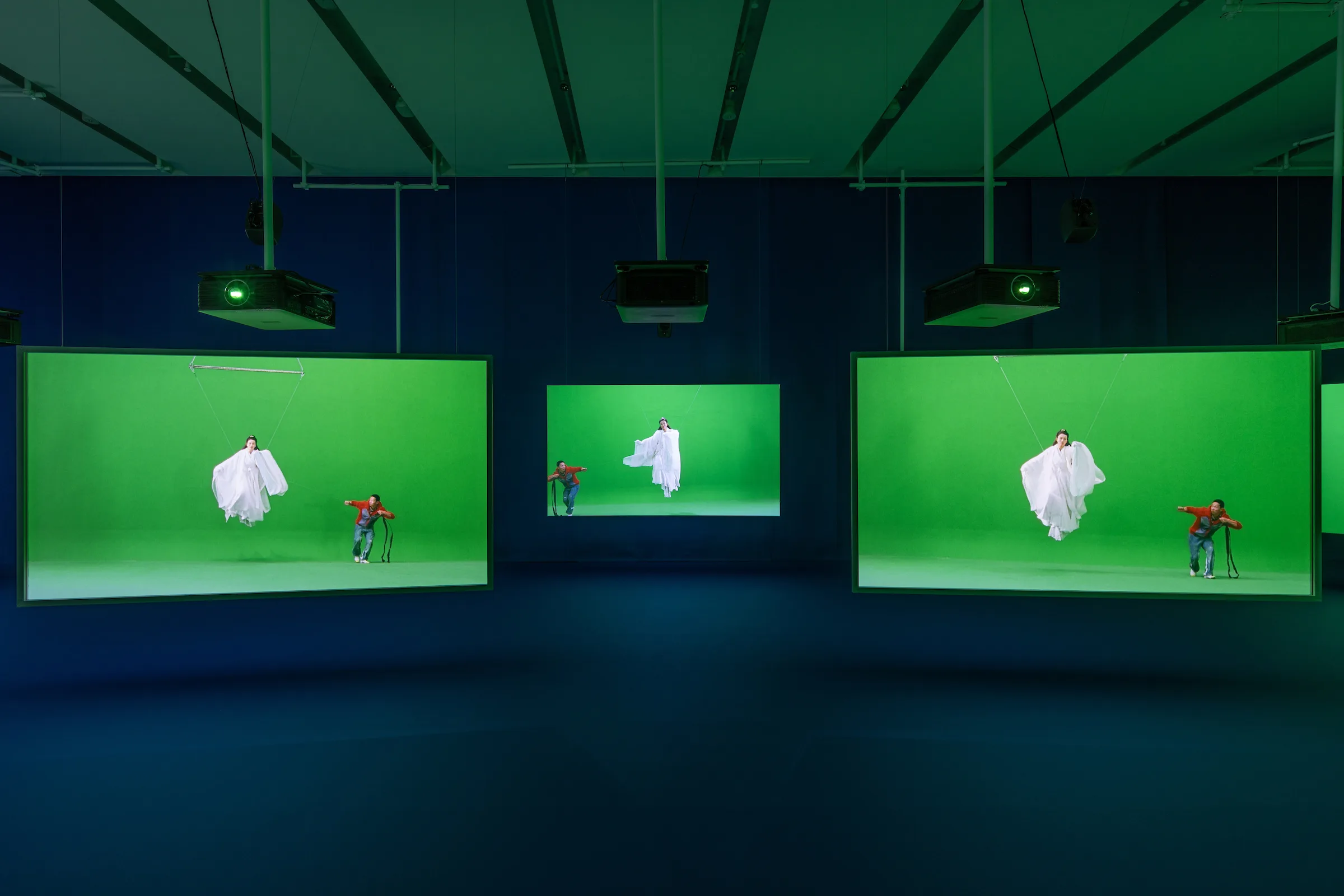 「亡くなった23名は貝を穫る漁業従事者でした。その方々の存在なしでは私たちは貝を食べることはできません。何かを食べたり、文化的なものの背景にある見えない労働にもフォーカスしています」と作家が話すように、作品内ではスタジオで宙に舞う媽祖の演出を支えるスタッフたち、書道の巨匠ゴン・ファーゲン(鞏法根)をサポートするスタッフの存在も克明に映し出す。