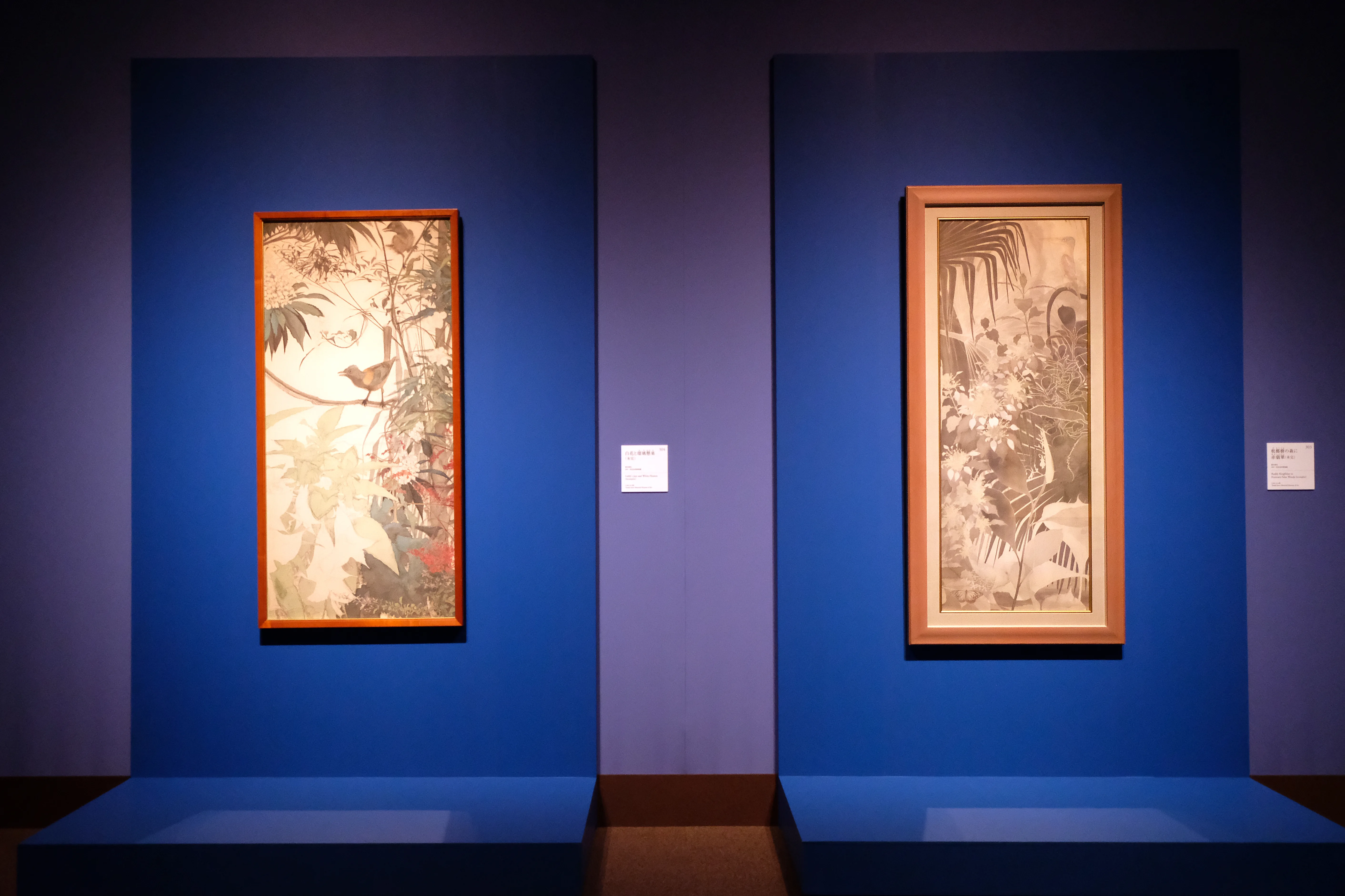 そして、未完のまま残されていた《檳榔樹の森に赤翡翠》、《白花と瑠璃懸巣》も展示されている。淡い彩色とともに、鉛筆のしたがきの線や薄墨や淡彩の下塗りなど、一村がどのように独自の世界を作り出していたかが把握できる。