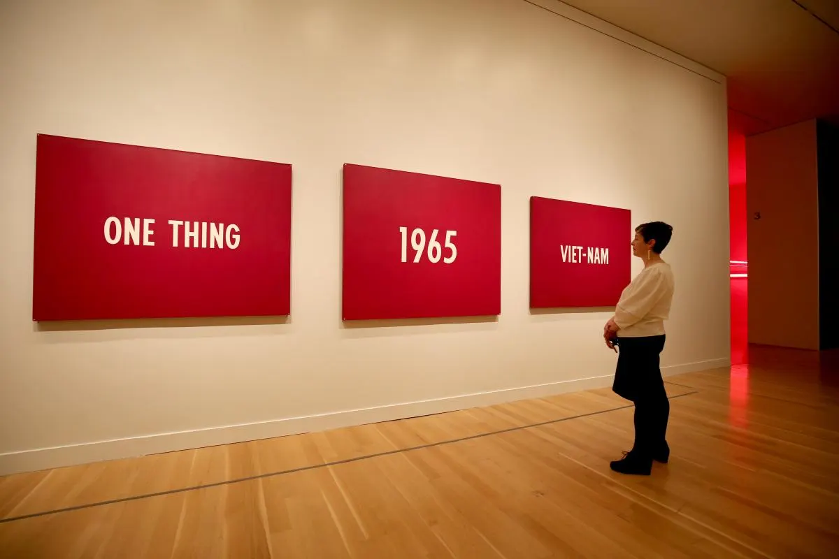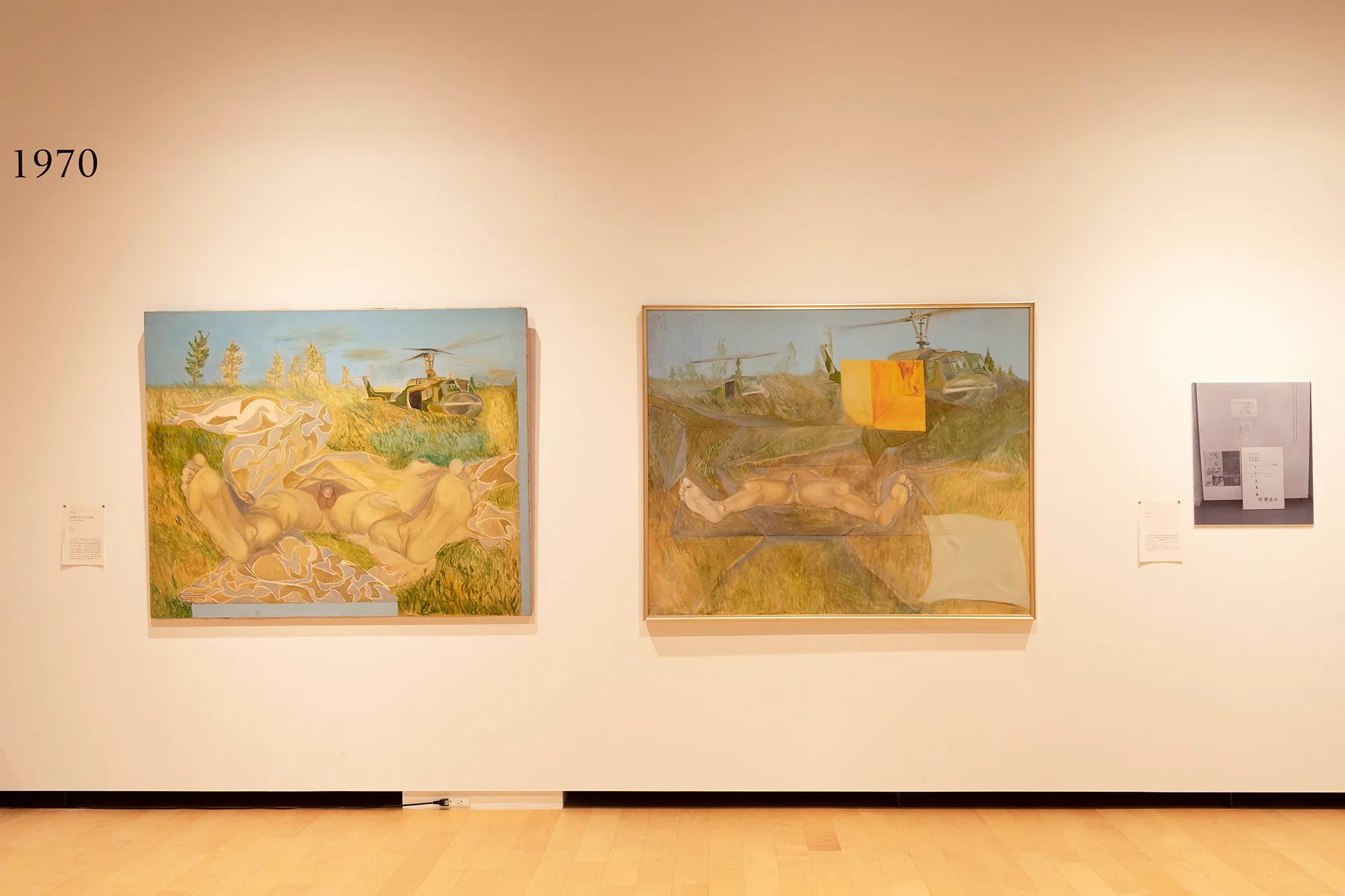 作品を検討するにあたって、例えば真っ先に思い浮かぶのは、河原温の《Title (ONE THING, 1965, VIET-NAM)》(1965)だろう。のちの《TODAY》シリーズに連なるこの作品は、ニューヨークに居を移した河原が「在外日本作家展」(東京国立近代美術館、1965)に出品した作品のひとつであり(つまり鑑賞者の多くは日本に住む者たち)、ベトナム戦争とアメリカのアーティストの関係を検証した「ARTISTS RESPOND American Art and the Vietnam War, 1965-1975」展(スミソニアン・アメリカ美術館、ミネアポリス美術館、2019-20)でも、アーティストからの反応の嚆矢と位置づけられている。