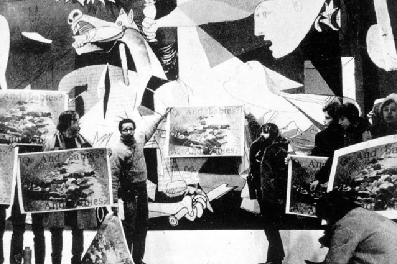 この写真を用いた表現でもっともよく知られるのは、芸術労働者連合がMoMAのゲルニカの前で抗議を行った際に用いたポスター《Q. And Babies? A. And Babies.》(赤ん坊も殺されたのですか?ええ、赤ん坊も)だろう。抗議は写真が公開された1969年12月に時をほぼ経ずして行われており、このポスターは翌1970年7月からMoMAで開催された「INFORMATION」展のカタログにも掲載されている(*17)。川村が同様の写真を用いてコラージュを制作したのは1970年3月である。