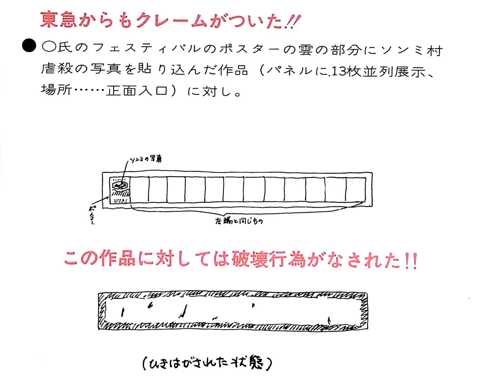 川村の作品は、展覧会初日の4月1日時点で後援の東急から「フェスティバルのポスター転用は許さぬ」という理由で介入がなされ、翌日には「残酷で政治的だ」という理由で「こどもの国」協会管理事務所が撤去を要求する事態へと発展する(展覧会自体の中止も辞さない強硬姿勢であった(*16))。