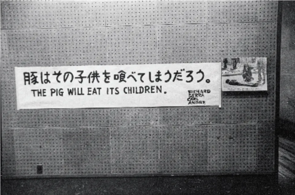 この展覧会は、コミッショナー(キュレーター)の中原佑介が「人間と物質(のあいだ)」というテーマを掲げ(*19)、当時の欧米圏で注目を集めていたミニマルかつコンセプチュアルな表現に、国内の「もの派」などの作品を併置させた極めて先鋭的なものであった。したがって、発表された作品のほとんどはいわゆる絵画ではなく、インスタレーション、写真、映像、パフォーマンスの形態をとっていた。だがここで言及したいのは、そうした傾向と部分的に重なりながらもほとんど言及されることがないカール・アンドレ(1935〜)とリチャード・セラ(1938〜)の共作《豚はその子供を喰べてしまうだろう。》である。