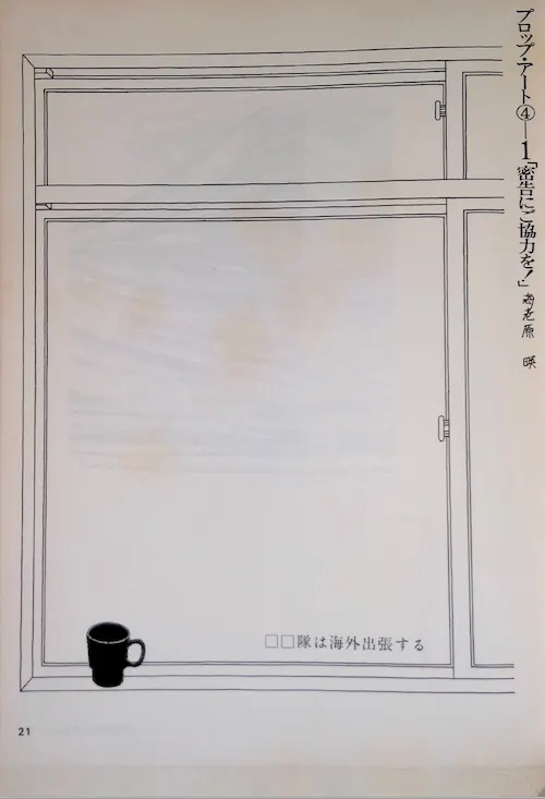 海老原の次のシリーズは一転して静物画や風景画のようであり、異なるタッチで描かれたヤカンや水差しが映る台所の窓、小窓の向こうに人影がある民家の様子が描かれている。だがよく見るとどちらも画面右上部分に小さく「密告にご協力を!」とある。あるいは、雑誌『デザイン』に掲載されたものには「□□隊は海外出張する」とある。ここには何のイメージが潜伏しているのだろうか。