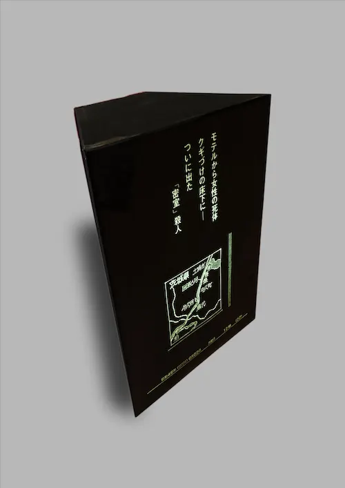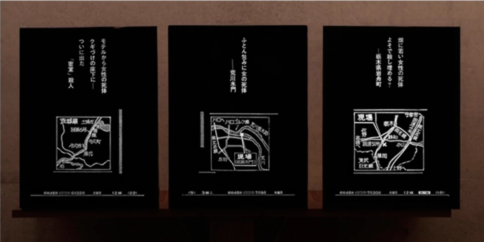 海老原は《事故現場見取図集》の発表後、事件の見取り図と煽り文が光る立体作品を制作し、ギャラリーをカーテンなどで暗室にして図と文字だけが浮かび上がるような構成をとった「殺人現場見取り図」展を開催する。展示は東京のガレリア・グラフィカで行われた後、大阪のモリスフォーム(*25)にも巡回している。「殺人現場見取り図」展は新聞にも掲載され、いわば新聞からはじまったプロジェクトが新聞へと還っていくかたちで一区切りとなった。
