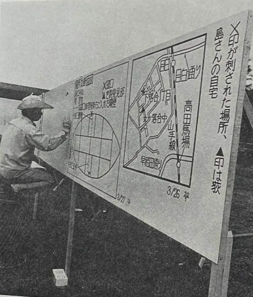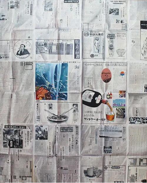 現代美術野外フェスティバルの記録写真を見ると、都内の殺人現場の見取り図の左隣に文字を書き込む海老原の姿が映っている(*2)。ここで、あらかじめ彼女の当時の作品について振り返っておこう。海老原は1969年頃、新聞の誌面を折れ目も含めて写しとっていくという仕事で注目を集めていた(*3)。