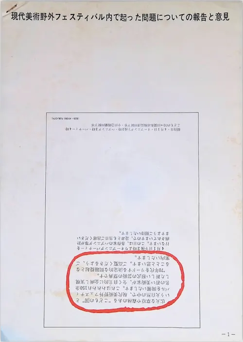 海老原、板東、そして矢田章子の3人は、『現代美術野外フェスティバル内で起った問題についての報告と意見』と題した、アート紙に写植2色刷、説明図版つき、5枚綴りのプリントを作成・配布する。ほかのビラよりも目立ち、手に取ってもらえ、かつ、捨てられずにきちんと読んでもらえるよう吟味した結果の紙選定であり、それゆえの2色刷であった。